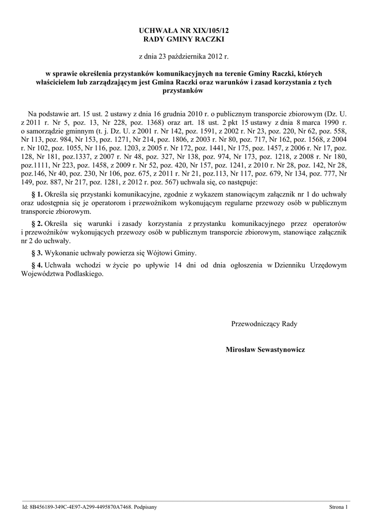 Uchwała Nr XIX/105/12 Rady Gminy Raczki z dnia