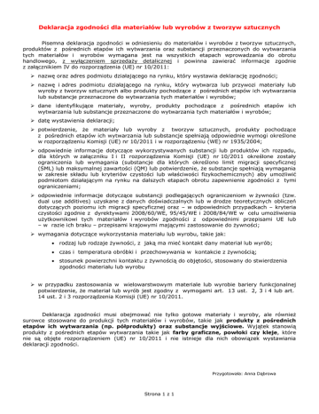 Deklaracja zgodności dla materiałów lub wyrobów z tworzyw sztucznych Pisemna deklaracja zgodności w odniesieniu do materiałów i wyrobów z tworzyw sztucznych, produktów z pośrednich etapów ich wytwarzania oraz substancji przeznaczonych do wytwarzania tych materiałów i wyrobów wymagana jest na wszystkich etapach wprowadzania do obrotu handlowego, z wyłączeniem sprzedaży detalicznej i powinna zawierać informacje zgodnie z załącznikiem IV do rozporządzenia (UE) nr 10/2011: nazwę oraz adres podmiotu działającego na rynku, który wystawia deklarację zgodności; nazwę i adres podmiotu działającego na rynku, który wytwarza lub przywozi materiały lub wyroby z tworzyw sztucznych albo produkty pochodzące z pośrednich etapów ich wytwarzania lub substancje przeznaczone do wytwarzania tych materiałów i wyrobów; dane identyfikujące materiały, wyroby, produkty pochodzące z pośrednich etapów ich wytwarzania lub substancje przeznaczone do wytwarzania tych materiałów i wyrobów; datę wystawienia deklaracji; potwierdzenie, że materiały lub wyroby z tworzyw sztucznych, produkty pochodzące z pośrednich etapów ich wytwarzania lub substancje spełniają odpowiednie wymogi określone w rozporządzeniu Komisji (UE) nr 10/2011 i w rozporządzeniu (WE) nr 1935/2004; odpowiednie informacje dotyczące wykorzystywanych substancji lub produktów ich rozpadu, dla których w załączniku I i II rozporządzenia Komisji (UE) nr 10/2011 określone zostały ograniczenia lub wymagania (substancje dla których określono limit migracji specyficznej (SML) lub maksymalnej zawartości (QM) lub potwierdzenie, że substancje spełniają wymagania w zakresie składu lub kryteriów czystości lub właściwości fizykochemicznych) aby umożliwić podmiotom działającym na rynku na dalszych etapach obrotu zapewnienie zgodności z tymi ograniczeniami; odpowiednie informacje dotyczące substancji podlegających ograniczeniom w żywności (tzw. dual use additives) uzyskane z danych doświadczalnych lub w drodze teoretycznych obliczeń dotyczących poziomu ich migracji specyficznej oraz – w odpowiednich przypadkach – kryteria czystości zgodnie z dyrektywami 2008/60/WE, 95/45/WE i 2008/84/WE w celu umożliwienia użytkownikowi tych materiałów i wyrobów zgodności z odpowiednimi przepisami UE lub – w razie ich braku – przepisami krajowymi mającymi zastosowanie do żywności; wymagania dotyczące wykorzystania materiału lub wyrobu, takie jak: rodzaj lub rodzaje żywności, z jaką ma mieć kontakt dany materiał lub wyrób; czas i temperatura obróbki i przechowywania w kontakcie z żywnością; stosunek powierzchni kontaktu z żywnością do objętości, stosowany do stwierdzenia zgodności materiału lub wyrobu w przypadku zastosowania w wielowarstwowym materiale lub wyrobie bariery funkcjonalnej potwierdzenie, że materiał lub wyrób jest zgodny z wymogami art. 13 ust. 2, 3 i 4 lub art. 14 ust. 2 i 3 rozporządzenia Komisji (UE) nr 10/2011. Deklaracja zgodności musi obejmować nie tylko gotowe materiały i wyroby, ale również surowce stosowane do produkcji tych materiałów i wyrobów, takie jak produkty z pośrednich etapów ich wytwarzania (np. półprodukty) oraz substancje wyjściowe. Wyjątek stanowią produkty z pośrednich etapów wytwarzania takie jak farby graficzne, powłoki czy kleje, które nie są objęte rozporządzeniem (UE) nr 10/2011 i nie istnieje dla nich obowiązek wystawiania deklaracji zgodności. Przygotowała: Anna Dąbrowa Strona 1 z 1