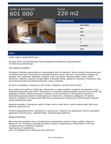 DOM na SPRZEDAŻ 601 000 Puławy 220 m2 28/4988/ODS Secondary 336 220 2010 4 5 VeryGood Villa Opis DOM O WIELU MOŻLIWOŚCIACH Szukasz domu do zamieszkania i/lub prowadzenia działalności gospodarczej? Ta oferta Cię zainteresuje. OPIS NIERUCHOMOŚCI Oferujemy Państwu jednorodzinny, wolnostojący dom w Puławach. Nieruchomość usytuowana jest na działce 336 mkw. Powierzchnia mieszkalna domu wynosi 220 mkw. Na parterze znajduję się gabinet, hall, wiatrołap, kotłownia, łazienka z WC oraz garaż. Pierwsze piętro: salon, aneks kuchenny, łazienka z pralnią. Drugie piętro: antresola, pokój, sypialnia z łazienką. Przyziemie: dwa duże pomieszczenia do własnej aranżacji, sauna, łazienka. Na dachu rozkładany, drewniany, letni taras z widokiem na panoramę miasta. Dom oddany do użytku w 2010 roku. Wzniesiony z cegły kratówki, ocieplony styropianem, kryty dachówką betonową. Okna PCV i drewniane, na ścianach gładzie gipsowe, glazura oraz kamień. Na podłogach panele, deska barlinecka i terakota. Drzwi zewnętrzne i wewnętrzne drewniane. Ogrzewanie gazowe piecem kondensacyjnym Viessmann, częściowo podłogowe. W salonie kominek. Zasobnik na ciepłą wodę 300l plus przygotowana instalacja do zamontowania solarów. Stacja uzdatniania wody. Budynek posiada 2 niezależne wejścia dzięki czemu część domu można wykorzystać jako biuro, gabinet, pracownię itp. Działka zagospodarowana i ogrodzona z zadaszonym miejscem do grillowania. Brama wjazdowa i garażowa automatyczna, wideodomofon. Dojazd droga asfaltową. INFRASTRUKTURA Nieruchomość położona jest w bezpośrednim sąsiedztwie centrum Puław, jednak z dala od głównych ulic. W pobliżu znajdują się Galeria Zielona, Galeria Nova, Media Markt, HTM oraz mniejsze punkty handlowo-usługowe. Zapraszamy do współpracy Dom Czy Mieszkanie to więcej niż nieruchomości Dom Czy Mieszkanie Dominik Rodzik tel. 728473982 email: [email protected] Dom Czy Mieszkanie Powered by TCPDF (www.tcpdf.org)