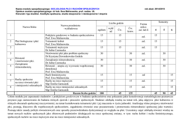 Nazwa modułu specjalizacyjnego: SOCJOLOGIA PŁCI I RUCHÓW SPOŁECZNYCH Opiekun modułu specjalizacyjnego: dr hab. Ewa Malinowska, prof. nadzw. UŁ Kierunek i typ studiów: Analityka społeczna, studia stacjonarne i niestacjonarne I stopnia Nazwa bloku 1 Nazwa przedmiotu –wykładowca rok akad. 2014/2015 Liczba godzin ogółem wykł ad Ćw. Ćw. konw. Forma zalicz. zal. lub E Semestry 4 5 6 Podejście genderowe w badaniu społeczeństwa 15 15 15 zal. Prof. Ewa Malinowska 2 Płeć biologiczna i płeć Tożsamość kobiet 15 15 zal. 15 kulturowa Prof. Ewa Malinowska 3 Tożsamość mężczyzn 15 15 zal. 15 Dr Julita Czernecka 3 Nierówności płci jako problem społeczny 30 30 zal. 30 Dr Krystyna Dzwonkowska-Godula Równość 4 i nierówności płci. Zarządzanie różnorodnością 30 30 zal. 30 Dr Julita Czernecka Zarządzanie 5 różnorodnością Równość – utopia czy wyzwanie współczesnej 30 30 zal. 30 demokracji Prof. Ewa Malinowska 6 Ruch feministyczny 15 15 zal 15 Prof. Ewa Malinowska Ruchy społeczne 7 Ruchy na rzecz mężczyzn 15 15 zal. 15 na rzecz równości płci Mgr Emilia Garncarek i mniejszości seksualnych 8 Ruchy na rzecz mniejszości seksualnych 15 15 zal. 15 Mgr Emilia Garncarek Razem liczba godzin 180 45 135 45 90 45 Celem modułu jest zapoznanie studentów z podejściem genderowym w badaniu społeczeństwa oraz pokazanie jakie konsekwencje metodologiczno-poznawcze przynosi jego zastosowanie do badania różnych zjawisk i procesów społecznych. Studenci zdobędą wiedzę na temat roli, jaką odgrywa płeć kulturowa w różnych obszarach społecznej rzeczywistości, na temat kształtowania tożsamości płci i jej znaczenia w życiu jednostki. Analizując różne przejawy nierówności płci, poznają, kluczowe dla współczesnych społeczeństw, zagadnienia równości oraz poszanowania i promowania różnorodności społecznej jako wartości. Poznają także zasady polityk równościowych oraz sposoby przeciwdziałania dyskryminacji ze względu na płeć. Uczestnicy zajęć zdobędą również wiedzę na temat nowych ruchów społecznych jako zbiorowych podmiotów działających na rzecz społecznej zmiany, w tym: ruchu kobiet i ruchu feministycznego, społecznych ruchów na rzecz mężczyzn oraz na rzecz mniejszości seksualnych.