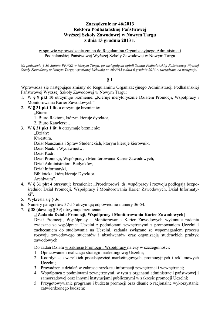 Zarządzenie nr 46/2013 Rektora Podhalańskiej Państwowej Wyższej Szkoły Zawodowej w Nowym Targu z dnia 13 grudnia 2013 r. w sprawie wprowadzenia zmian do Regulaminu Organizacyjnego Administracji Podhalańskiej Państwowej Wyższej Szkoły Zawodowej w Nowym Targu Na podstawie § 30 Statutu PPWSZ w Nowym Targu, po zasięgnięciu opinii Senatu Podhalańskiej Państwowej Wyższej Szkoły Zawodowej w Nowym Targu, wyrażonej Uchwałą nr 46/2013 z dnia 6 grudnia 2013 r. zarządzam, co następuje: §1 Wprowadza się następujące zmiany do Regulaminu Organizacyjnego Administracji Podhalańskiej Państwowej Wyższej Szkoły Zawodowej w Nowym Targu: 1. W § 9 pkt 10 otrzymuje brzmienie: „Kieruje merytorycznie Działem Promocji, Współpracy i Monitorowania Karier Zawodowych”. 2. W § 31 pkt 1 lit. a otrzymuje brzmienie: „Biura: 1. Biuro Rektora, którym kieruje dyrektor, 2. Biuro Kanclerza„. 3. W § 31 pkt 1 lit. b otrzymuje brzmienie: „Działy: Kwestura, Dział Nauczania i Spraw Studenckich, którym kieruje kierownik, Dział Nauki i Wydawnictw, Dział Kadr, Dział Promocji, Współpracy i Monitorowania Karier Zawodowych, Dział Administratora Budynków, Dział Informatyki, Biblioteka, którą kieruje Dyrektor, Archiwum”. 4. W § 31 pkt 4 otrzymuje brzmienie: „Prorektorowi ds. współpracy i rozwoju podlegają bezpośrednio: Dział Promocji, Współpracy i Monitorowania Karier Zawodowych, Dział Informatyki”. 5. Wykreśla się § 36. 6. Numery paragrafów 37-55 otrzymują odpowiednio numery 36-54. 7. § 38 (dawniej § 39) otrzymuje brzmienie: „[Zadania Działu Promocji, Współpracy i Monitorowania Karier Zawodowych] Dział Promocji, Współpracy i Monitorowania Karier Zawodowych wykonuje zadania związane ze współpracą Uczelni z podmiotami zewnętrznymi z promowaniem Uczelni i zachęcaniem do studiowania na Uczelni, zadania związane ze wspomaganiem procesu rozwoju zawodowego studentów i absolwentów oraz organizacją studenckich praktyk zawodowych. Do zadań Działu w zakresie Promocji i Współpracy należy w szczególności: 1. Opracowanie i realizacja strategii marketingowej Uczelni; 2. Koordynacja wszelkich przedsięwzięć marketingowych, promocyjnych i reklamowych Uczelni; 3. Prowadzenie działań w zakresie przekazu informacji zewnętrznej i wewnętrznej; 4. Współpraca z podmiotami zewnętrznymi, w tym z organami administracji państwowej i samorządowej oraz innymi instytucjami publicznymi w zakresie promocji Uczelni; 5. Przygotowywanie programu i budżetu promocji oraz dbanie o racjonalne wykorzystanie zatwierdzonego budżetu; 6. Współpraca z jednostkami organizacyjnymi Uczelni w zakresie pozyskiwania danych do przygotowywania materiałów promocyjnych i informacyjnych oraz przygotowywanie techniczne tych materiałów; 7. Współpraca z mediami celem kreowania pozytywnego wizerunku Uczelni zgodnie z jej strategią rozwoju; 8. Organizacja obsługi, w tym medialnej, imprez, konferencji, wykładów specjalnych; 9. Współpraca przy redakcji i stałej aktualizacji strony www Uczelni; 10. Stała współpraca ze szkołami ponadgimnazjalnymi, organizowanie spotkań i imprez w tych szkołach celem przedstawienia oferty Uczelni i pozyskiwania potencjalnych studentów; 11. Stały monitoring rynku edukacyjnego; 12. Prowadzenie Księgi Pamiątkowej Uczelni; 13. Gromadzenie dokumentacji medialnej na temat Uczelni, w tym prowadzenie archiwum fotograficznego i video oraz obsługa fotograficzna życia uczelni. Do zadań Działu w zakresie Monitorowania Karier Zawodowych należy utrzymywanie kontaktów z absolwentami, współpraca ze stowarzyszeniem absolwentów, śledzenie losów absolwentów a w szczególności: 1. w zakresie prowadzenia studiów podyplomowych i kursów dokształcających: a. współpraca z dyrektorami instytutów w zakresie opracowywania i uaktualniania oferty programowej studiów podyplomowych i kursów dokształcających, b. obsługa procesu rekrutacji na studia podyplomowe i kursy dokształcające, c. wnioskowanie do Rektora o uruchomienie studiów podyplomowych lub kursu dokształcającego, d. opracowanie kalkulacji kosztów uczestnictwa w studiach podyplomowych lub kursie dokształcającym, e. zapewnienie sal dydaktycznych i wyposażenia niezbędnego do właściwej realizacji planu i programu studiów podyplomowych i kursów dokształcających, f. przygotowywanie, wydawanie i rejestrowanie certyfikatów o ukończeniu kursu dokształcającego bądź świadectw ukończenia studiów podyplomowych; 2. w zakresie administracyjnej obsługi studenckich praktyk zawodowych: a. opracowywanie, w uzgodnieniu z opiekunami dydaktyczno-wychowawczymi, rocznego harmonogramu praktyk odbywanych przez studentów wszystkich kierunków, b. przygotowywanie i wydawanie skierowań dla studentów na praktyki do poszczególnych placówek, c. prowadzenie bazy zakładów pracy przyjmujących studentów na praktyki, d. prowadzenie bazy studentów kierowanych na praktyki, e. przygotowywanie umów zawieranych pomiędzy placówkami i Uczelnią, dotyczących warunków odbywania praktyk i zajęć praktycznych, f. monitorowanie losów absolwentów pod względem zatrudniania ich przez zakłady pracy, w których odbywali praktyki; 3. w zakresie współpracy z powiatowymi urzędami pracy i pracodawcami: a. gromadzenie danych dotyczących ofert pracy w poszczególnych zawodach, w regionie i kraju, b. utrzymywanie kontaktów z pracodawcami, organizacja spotkań, pozyskiwanie ofert pracy, c. organizacja giełd pracy, d. monitorowanie rynku pracy w zakresie możliwości zatrudnienia absolwentów; 4. w zakresie prowadzenia działalności konsultacyjno-szkoleniowej: a. organizowanie grupowych zajęć warsztatowych mających na celu zapoznanie studentów z technikami poszukiwania pracy oraz standardami rekrutacji, b. powiadamianie absolwentów o możliwościach podnoszenia kwalifikacji zawodowych poprzez kursy dokształcające i studia podyplomowe, c. organizowanie prezentacji firm w Uczelni o
