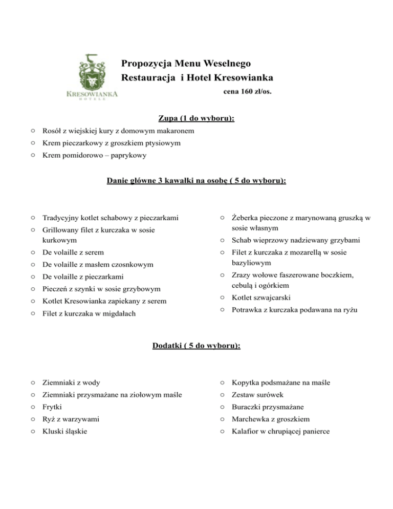 ! Propozycja Menu Weselnego Restauracja i Hotel Kresowianka cena 160 zł/os. ! Zupa (1 do wyboru): o Rosół z wiejskiej kury z domowym makaronem o Krem pieczarkowy z groszkiem ptysiowym ! o Krem pomidorowo – paprykowy Danie główne 3 kawałki na osobę ( 5 do wyboru): ! ! o Tradycyjny kotlet schabowy z pieczarkami o Żeberka pieczone z marynowaną gruszką w sosie własnym o Grillowany filet z kurczaka w sosie kurkowym o Schab wieprzowy nadziewany grzybami o De volaille z serem o Filet z kurczaka z mozarellą w sosie bazyliowym o De volaille z masłem czosnkowym o Pieczeń z szynki w sosie grzybowym o Zrazy wołowe faszerowane boczkiem, cebulą i ogórkiem o Kotlet Kresowianka zapiekany z serem o Kotlet szwajcarski o Filet z kurczaka w migdałach o Potrawka z kurczaka podawana na ryżu o De volaille z pieczarkami ! ! Dodatki ( 5 do wyboru): ! ! ! ! ! o Ziemniaki z wody o Kopytka podsmażane na maśle o Ziemniaki przysmażane na ziołowym maśle o Zestaw surówek o Frytki o Buraczki przysmażane o Ryż z warzywami o Marchewka z groszkiem o Kluski śląskie o Kalafior w chrupiącej panierce Desery ( 1 do wyboru): ! o Puchar lodowy z bitą śmietaną o Maliny na gorąco z lodami waniliowymi o Marynowana gruszka z gałką lodów waniliowych w sosie czekoladowym z prażonymi migdałami ! o Strudel jabłkowo-gruszkowy na sosie waniliowym z gałką lodów gruszkowych Zimny bufet: ! Zimna płyta: • schab ze śliwką, • delikatne i słodkie terrriny drobiowe • galantyna drobiowa • polędwiczki wieprzowe z pastami • pieczona karkówka w sosie tatarskim, • szpikowana szpinakiem indyczą pierś • pasztet wiejski z żurawiną • terrina z piersi kurczaka z pistacjami w plastrach szynki • śliwka zapiekana w boczku ! ! ! ! ! ! ! Sałatki (2 do wyboru): ! o Tradycyjna jarzynowa o Z makaronem Farfalle i warzywami o Z wędzonego łososia o Z kurczakiem, ananasem i porem o Ryżowa z szynką i prażonym słonecznikiem o Z kaszą Kus-kus i warzywami o Ziemniaczana z boczkiem i pietruszką o Gyros o Grecka z serem feta i oliwkami o Z szynką, porem i jajkiem o Litewska o ! o Przekładaniec tuńczykowy Meksykańska Ryby (2 do wyboru): ! o Śledzie: w oleju, w śmietanie, po mazursku, w zalewie octowej o Ryba po grecku o Tatar śledziowy z orzechami i grzankami z chrupiącą cebulką ! ! ! ! Galarciki( 1 do wyboru): ! o Drobiowe o Wieprzowe o Warzywne ! ! Zakąski (2 do wyboru): o Roladki z łososiem norweskim o Śliwka zapiekana w boczku o Volaventy z pastami ! ! ! ! ! ! Kolacja Barszcz czysty dla wszystkich Gości Danie gorące podawane półmiskowo 1,5 porcji na osobę : ! ! o Gołąbki własnego wyrobu w sosie pomidorowym ! o Wiejska kiełbasa z grilla z cebulką podsmażaną Dodatkowe dania podane w stole 1,5 porcja na osobę: ✓ Pierogi litewskie, ✓ Pierogi z mięsem ! ! Śniadanie ( 1 do wyboru) o Barszcz z krokietem lub pasztecikiem o Gulasz o Flaki ! o Żurek z jajkiem ! Dodatkowo polecamy: Pieczony udziec podawany z złocistymi kopytkami i buraczkami 800,00 Stół wiejski (salcesony, kaszanki, szynki wędzone, kiełbasy, wszystko własnego wyrobu) 8,00/os ! Cena zawiera Kawa i Herbata (bez limitu) Apartament dla Pary Młodej Cena nie zawiera ! Tortu weselnego, ciasta weselnego, alkoholu, napoi, owoców Wybierając ta wersje otrzymują Państwo od nas w prezencie uroczystą kolacje dla 6 osób w Rocznicę Ślubu.
