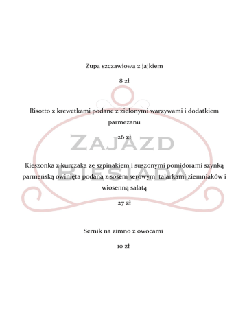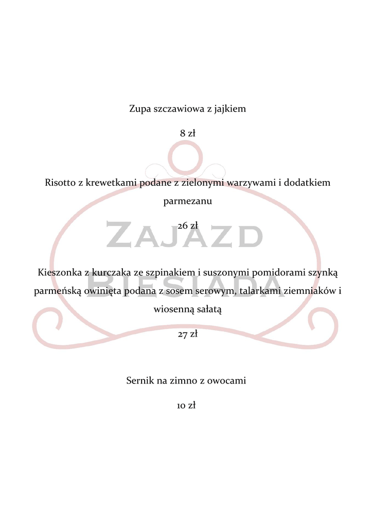 Zupa szczawiowa z jajkiem 8 zł Risotto z krewetkami podane z zielonymi warzywami i dodatkiem parmezanu 26 zł Kieszonka z kurczaka ze szpinakiem i suszonymi pomidorami szynką parmeńską owinięta podana z sosem serowym, talarkami ziemniaków i wiosenną sałatą 27 zł Sernik na zimno z owocami 10 zł