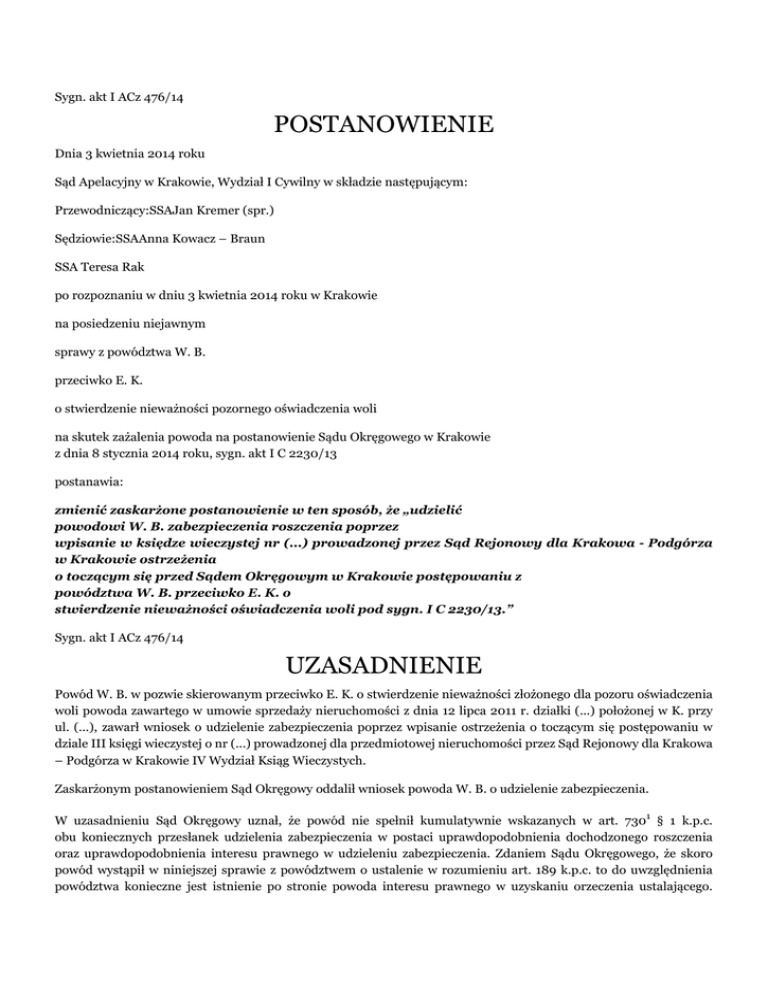Sygn. akt I ACz 476/14 POSTANOWIENIE Dnia 3 kwietnia 2014 roku Sąd Apelacyjny w Krakowie, Wydział I Cywilny w składzie następującym: Przewodniczący:SSAJan Kremer (spr.) Sędziowie:SSAAnna Kowacz – Braun SSA Teresa Rak po rozpoznaniu w dniu 3 kwietnia 2014 roku w Krakowie na posiedzeniu niejawnym sprawy z powództwa W. B. przeciwko E. K. o stwierdzenie nieważności pozornego oświadczenia woli na skutek zażalenia powoda na postanowienie Sądu Okręgowego w Krakowie z dnia 8 stycznia 2014 roku, sygn. akt I C 2230/13 postanawia: zmienić zaskarżone postanowienie w ten sposób, że „udzielić powodowi W. B. zabezpieczenia roszczenia poprzez wpisanie w księdze wieczystej nr (...) prowadzonej przez Sąd Rejonowy dla Krakowa - Podgórza w Krakowie ostrzeżenia o toczącym się przed Sądem Okręgowym w Krakowie postępowaniu z powództwa W. B. przeciwko E. K. o stwierdzenie nieważności oświadczenia woli pod sygn. I C 2230/13.” Sygn. akt I ACz 476/14 UZASADNIENIE Powód W. B. w pozwie skierowanym przeciwko E. K. o stwierdzenie nieważności złożonego dla pozoru oświadczenia woli powoda zawartego w umowie sprzedaży nieruchomości z dnia 12 lipca 2011 r. działki (...) położonej w K. przy ul. (...), zawarł wniosek o udzielenie zabezpieczenia poprzez wpisanie ostrzeżenia o toczącym się postępowaniu w dziale III księgi wieczystej o nr (...) prowadzonej dla przedmiotowej nieruchomości przez Sąd Rejonowy dla Krakowa – Podgórza w Krakowie IV Wydział Ksiąg Wieczystych. Zaskarżonym postanowieniem Sąd Okręgowy oddalił wniosek powoda W. B. o udzielenie zabezpieczenia. W uzasadnieniu Sąd Okręgowy uznał, że powód nie spełnił kumulatywnie wskazanych w art. 7301 § 1 k.p.c. obu koniecznych przesłanek udzielenia zabezpieczenia w postaci uprawdopodobnienia dochodzonego roszczenia oraz uprawdopodobnienia interesu prawnego w udzieleniu zabezpieczenia. Zdaniem Sądu Okręgowego, że skoro powód wystąpił w niniejszej sprawie z powództwem o ustalenie w rozumieniu art. 189 k.p.c. to do uwzględnienia powództwa konieczne jest istnienie po stronie powoda interesu prawnego w uzyskaniu orzeczenia ustalającego. W tym kontekście stwierdził, że skoro dla spornej nieruchomości prowadzona jest księga wieczysta, w której jako właścicielka figuruje pozwana, to powód może dochodzić ochrony swoich praw powództwem o uzgodnienie treści tej księgi wieczystej skierowanym przeciwko osobie ujawnionej w niej jako właściciel lub też – gdyby powód utracił władztwo nad nieruchomością - powództwem o wydanie lokalu, którego prawo do dotyczy, skierowanym przeciwko osobie, która lokalem faktycznie włada. Zdaniem Sądu Okręgowego te dwa powództwa w pełni zapewniają ochronę prawną interesów powoda, zatem nie ma powód interesu prawnego w żądaniu stwierdzenia nieważności pozornego oświadczenia woli. Nadto powód może kwestionować ważność umowy sprzedaży z dnia 12 lipca 2011 r. w postępowaniu o eksmisję do sygn. akt I C 3790/13/P niezależnie od niniejszego powództwa o ustalenie. W sytuacji gdy powód może żądać świadczenia lub uzgodnienia treści księgi wieczystej z rzeczywistym stanem prawnym a zarzutami dotyczącymi nieważności umowy z dnia 12 lipca 2011 r. może bronić się w toczącym się postępowaniu o eksmisję do sygn. akt I C 3790/13/P, nie ma powód interesu prawnego w żądaniu stwierdzenia nieważności pozornego oświadczenia woli, tym bardziej, że rozpoznanie takich powództw i zarzutów procesowych definitywnie zakończy spór pomiędzy powodem a pozwaną, podczas gdy rozstrzygnięcie sporu o stwierdzenie nieważności pozornego oświadczenia woli definitywnie sporu tego nie zakończy. Tym samym Sąd Okręgowy uznał, że powód nie uprawdopodobnił dochodzonego roszczenia w stopniu pozwalającym na jego zabezpieczenie zgodnie z wnioskiem. W ocenie Sądu Okręgowego powód nie uprawdopodobnił również interesu prawnego w udzieleniu zabezpieczenia. Subiektywne i gołosłowne twierdzenie powoda o możliwości rozporządzenia przez pozwaną sporną nieruchomością nie może zostać uznane za prawidłowe uprawdopodobnienie interesu prawnego w uzyskaniu zabezpieczenia. Zażalenie na to postanowienie złożył powód, zaskarżając je w całości i wnosząc jego zmianę poprzez udzielenie zabezpieczenia zgodnie ze złożonym wnioskiem. Zaskarżonemu postanowieniu zarzucił naruszenie następujących przepisów prawa: 1. art. 7301 § 1 i § 3 k.p.c. poprzez jego niezastosowanie i błędne przyjęcie, że nie zostały spełnione przesłanki udzielenia zabezpieczenia w postaci uprawdopodobnienia roszczenia i interesu prawnego; 2. art. 7301 § 2 k.p.c. poprzez błędne przyjęcie, że powód nie ma interesu prawnego w udzieleniu zabezpieczenia, w sytuacji gdy interesem prawnym powoda jest stwierdzenie nieważności umowy sprzedaży nieruchomości z dnia 12 lipca 2011 r.; 3. art. 31 ust 2 ustawy o księgach wieczystych i hipotece poprzez jego niezastosowanie i błędne uznanie, że ewentualny wyrok stwierdzający nieważność umowy sprzedaży z dnia 12 lipca 2011 r. nie będzie realizował uprawnień powoda jako właściciela, podczas gdy zgodnie z powołanym przepisem wyrok ustalający nieważność umowy sprzedaży nieruchomości będzie stanowił podstawę do dokonania wpisu prawa własności w księdze wieczystej. W uzasadnieniu wskazał, że o istnieniu interesu prawnego w udzieleniu zabezpieczenia świadczy w szczególności fakt wytoczenia przez pozwaną wobec powoda procesu o eksmisję sygn. akt I C 3790/12/P. Zdaniem skarżącego pozwana w postępowaniu tym chce opróżnić przedmiotową nieruchomość, by ją następnie sprzedać, jaką wolną od osób. Sąd Apelacyjny zważył, co następuje: Zażalenie jest zasadne. W orzecznictwie Sądu Najwyższego występują zróżnicowane poglądy dotyczące możliwości wykazania interesu prawnego dla powództwa z art. 189 k.p.c. Nie wdając się w rozważanie zasadności po