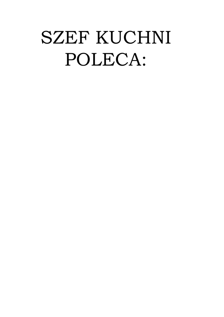 SZEF KUCHNI POLECA: PRZYSTAWKI I SAŁATY 1. Śledź po kaszubsku wg Magdy Gessler 9 zł 2. Chrupiące pieczone pierogi z naszego ciasta z wytrawnym jabłkiem, majerankiem i wędzonym boczkiem podane z sosem jabłkowo - chrzanowym 19 zł 3. Sałatka z pieczonych warzyw z pieczonym kurczakiem, sosem z pastą tahini i sezamem 19 zł 4. Wersja wegańska - Sałatka z pieczonych warzyw z avocado, sosem z pastą tahini i sezamem 18 zł 5. Świeża figa pieczona z owczym serem i szynką długodojrzewającą 19 zł 6. Wersja wegetariańska - Figa pieczona z owczym serem 17 zł ZUPY 7. Żurek na domowym zakwasie z białą kiełbasą i jajkiem 8. Zupa dnia (zapytaj obsługę) tym znakiem oznaczone są dania bezglutenowe Uwaga! Mimo wszystko prosimy o informowanie o tym, że danie ma być bezglutenowe; czasami dodatki do dania to np. kopytka albo bułka tarta z masłem itp. W przypadku osoby uczulonej na gluten zamienimy dodatki na inne i wyeliminujemy produkty z glutenem. Niektóre produkty mimo, iż w swoim składzie nie zawierają glutenu, poprzez styczność z innymi produktami mogą być nim zanieczyszczone. 10 zł DANIA GŁÓWNE 9. Łosoś z dynią zapiekany w śmietanie i białym winie, podany z ziemniakami zapiekanymi i sałatą z kiełkami i sosem winegret 35 zł 10. Duszone żebra baranie, podane z kopytkami i buraczkami zasmażanymi 29 zł 11. Kotlet schabowy z kostką i tłuszczykiem smażony tradycyjnie na smalcu wieprzowym podany z ziemniakami zapiekanymi i surówką z kiszonej przez nas kapusty 26 zł 12. Pół kaczki pieczonej z jabłkami, podanej z zapiekanką ziemniaczaną, kapustą modrą na czerwonym winie i domową marynowaną gruszką 48 zł 13. Podwędzane w naszej wędzarni polędwiczki wieprzowe podane z sosem śliwkowym, "risottem" z kaszy pęczak z cebulką oraz surówką z selera z orzechami 30 zł 14. Gołąbki (o dzisiejsze nadzienie zapytaj obsługę) 25 zł 15. Wersja wegańska - Gołąbki (o dzisiejsze nadzienie zapytaj obsługę) 20 zł 16. Potrawka z kurczaka z opieńkami pod domowej roboty ciastem francuskim, podana z sałatą z sosem winegret 30 zł 17. Danie wegetariańskie - Placki ziemniaczane z sosem grzybowym i surówkami 18 zł 18. Pierogi ruskie lub pierogi z mięsem 15 zł 19. Pierogi sezonowe (zapytaj obsługę) * * * * wszystkie dania zawierają dopasowane dodatki Porcja mięsa w daniu głównym to min. 200 g Porcja ryby w daniu głównym to min. 180 g 1/2 porcji stanowi 70% ceny dania MENU DLA NAJMŁODSZYCH 20. Faworki z kurczaka (100 g) w panierce z płatków kukurydzianych z frytkami i surówką z marchewki 14 zł 21. Pieczony filet z łososia (100 g) z sosem koperkowym z kopytkami i duszoną z masłem marchewką 19 zł 22. Frytki 7 zł DESERY 23. Domowa szarlotka 8 zł 24. Domowa szarlotka podana na gorąco z lodami waniliowymi i bitą śmietaną 13 zł 25. Lody (3 gałki) ze świeżymi owocami i bitą śmietaną 15 zł 26. Fondant, czyli czekoladowe ciastko z płynnym wnętrzem, podane z lodami waniliowymi i solonym karmelem 17 zł 27. Placki ziemniaczane (3 szt.) ze śmietaną i cukrem 10 zł 28. Racuchy z jabłkami 13 zł 29. Deser wegański - gruszka zapiekana z marcepanem i bakaliami 12 zł DODATKI DO DAŃ 30. Frytki 5 zł 31. Ziemniaki 5 zł 32. Surówki 5 zł tym znakiem oznaczone są dania bezglutenowe NAPOJE GORĄCE Kawa (czarna, z mlekiem lub espresso) 7 zł Kawa Inka zbożowa, kawa rozpuszczalna bezkofeinowa 7 zł Capuccino 8 zł Caffe Latte 10 zł Caffe Latte z syropem Monin (różne smaki) 13 zł Herbaty z suszu podawane w dzbanuszku: * czarna * czarna earl grey * zielona * zielona jaśminowa * zielona owocowa * owocowa 7 zł Herbata czarna podana w filiżance (saszetka Ahmad) 5 zł Kakao z bitą śmietaną 10 zł NAPOJE ZIMNE Napoje gazowane 0,2 l (Pepsi, 7up, Mirinda, Tonic) Soki Toma 0,2 l ( grejpfrutowy, pomarańczowy, jabłkowy, pomidorowy) Napój porzeczkowy Toma 0,2l Lipton Ice Tea 0,5 l Woda Cisowianka: - Classique / Perlage 0,3 l - Classique / Perlage 0,7 l 4 zł 4 zł 4 zł 5 zł 4 zł 6 zł NAPOJE ALKOHOLOWE Wódka Czysta "Dwór Sieraków" Wódka z Beczki "Dwór Sieraków" Wódka z Czarnego Bzu "Dwór Sieraków" Wódka Pieprzowa "Dwór Sieraków" Wyborowa Żubrówka Nalewka Soplica (różne rodzaje) Jack Daniells Metaxa 5* Johnie Walker Label Gin Seagram`s Rum Havana Club Tequila Sierra Silver Martini Bianco/Rosso/Dry 40 ml/10 zł 0,7 l /150 zł 40 ml/12 zł 0,7 l/180 zł 40 ml/11 zł 0,5 l /120 zł 40 ml/11 zł 0,5 /120 zł 40 ml/ 7 zł 0,5 l/70 zł 40 ml/7 zł 0,5 l /70 zł 40 ml/ 7 zł 0,5 l/70 zł 40 ml/12 zł 0,7 l /180 zł 40 ml/12 zł 0,7 l/180 zł 40 ml/10 zł 0,7 l /150 zł 40 ml/8 zł 0,7 l /120 zł 40 ml/9 zł 0,7 l/130 zł 40 ml/9 zł 0,7 l /130 zł 100 ml/10 zł 1 l/80 zł Z "TABUNOWEJ" PIWNICZKI * Miodówko - cytrynówka 40 ml 10 zł * Domowy Ajerkoniak 40 ml 10 zł * Domowa nalewka 40 ml 12 zł * Cydr domowej roboty: 0,3 l 0,5 l 9 zł 12 zł * Grzany cydr z laską cynamonu i miodem 0,3 l 14 zł * " Grzaniec Otomiński", czyli grzane wino domowej roboty z przyprawami korzennymi, miodem i pomarańczą 0,3 l 12 zł 0,33l but. 4 zł 0,5l but. 7 zł 0,5l but. 8 zł 0,5l but. 8 zł 0,5 l but. 7 zł PIWO *Lech free (bezalkoholowe) *Żywe (Browar Amber) (jasne, niepasteryzowane, alk. 6,2%) *Pszeniczniak (Browar Amber) (pszeniczne, niefiltrowane, pasteryzowane) *Koźlak (Browar Amber) (ciemne typu bock, alk. 6,5 %) * Johannes (Browar Amber) (jasne, pełne, pasteryzowane, warzone metodą tradycyjną, alk. 6,5 %) WINO Wina domu (lekko wytrawne: białe, czerwone lub różowe) - Hiszpania * * * * Kieliszek 15 cl - 9 zł Karafka 0,25 l - 13 zł Karafka 0,5 l - 22 zł Karafka 1l - 40 zł WINO BIAŁE * Berberana Gran Tradicion Semi Seco Cava DO (Hiszpania) 0,75l/50 zł Wino białe półwytrawne musujące. Kolor słomkowy. Delikatne zapachy powstające podczas starzenia się butelki.Przyjemne słodkawe nuty owoców, z drobnymi,orzeźwiającymi bąbelkami. *Stemmari Moscato Terre Siciliane IGT (Włochy) 0,75l/45 zł Wino białe,
