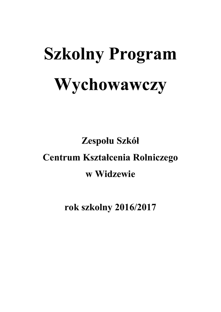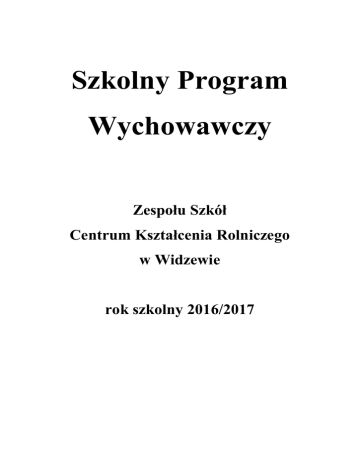 Szkolny Program Wychowawczy Zespołu Szkół Centrum Kształcenia Rolniczego w Widzewie rok szkolny 2016/2017 Misja szkoły I. „Kto chce – szuka sposobów, kto nie chce – szuka powodów” Stefan Żeromski Misję pragniemy realizować poprzez solidne nauczanie, przyjazną atmosferę, nowoczesne metody zarządzania, współpracę z innymi szkołami i instytucjami. Szkoły wchodzące w skład zespołu zmierzają do kształtowania młodych ludzi obdarzonych wrażliwością, kompetentnych, odpowiedzialnych, przygotowanych do świadomego i aktywnego uczestnictwa w życiu społeczno – zawodowym. II. Akty prawne Szkolny Program Wychowawczy został opracowany na podstawie następujących dokumentów: 1. 2. 3. 4. 5. 6. 7. 8. 9. III. Konstytucja Rzeczpospolitej Polskiej, Powszechna Deklaracja Praw Człowieka Międzynarodowa Konwencja Praw Dziecka Ustawa o systemie oświaty z dnia 7 września 1991r. ze zmianami Rozporządzenie Ministra Edukacji Narodowej z dnia 7 października 2009r. Pakiet rozporządzeń Ministra Edukacji Narodowej z dnia 17 listopada 2010r. Rozporządzenie Ministra Edukacji Narodowej z dnia 30 kwietnia 2013r. Rozporządzenie Ministra Edukacji Narodowej z dnia 6 sierpnia 2015r. Wnioski Rady Pedagogicznej, Samorządu Uczniowskiego i Rady Rodziców. Ideał absolwenta. Przygotowany do wykonywania wyuczonego zawodu, dążący do podnoszenia kwalifikacji. Umiejący odnaleźć się na rynku pracy. Uspołeczniony, dojrzały do podejmowania odpowiedzialności za siebie, swoją rodzinę, społeczność, ojczyznę. Przygotowany emocjonalnie do dorosłego życia: asertywny, komunikatywny, empatyczny, wolny od uzależnień, przeciwny agresji i przemocy. Przygotowany do odbioru sztuki. IV. Priorytety wychowawcze. 1. Wszechstronny rozwój osobowości ucznia: poznawczy, emocjonalny, moralny. 2. Kształtowanie postawy patriotycznej, szacunku dla tradycji, historii, ojczystego języka. 3. Przyjazna atmosfera w szkole. 4. Ścisła współpraca szkoły ze środowiskiem rodzinnym – celem ujednolicenia oddziaływań wychowawczych. 5. Objęcie uczniów szczególnym nadzorem oraz szeregiem oddziaływań wychowawczych w zakresie realizacji przez nich obowiązku nauki. V. 1. 2. 3. 4. 5. 6. 7. 8. 9. Cele wychowania. Kształtowanie postaw prospołecznych Kształtowanie umiejętności zawodowych. Przygotowanie do poruszania się po rynku pracy. Promocja zdrowia. Opieka nad młodzieżą znajdującą się w trudnej sytuacji. Zapewnienie uczniom bezpieczeństwa. Profilaktyka w zakresie rozwoju emocjonalnego i społecznego. Współpraca z rodzicami. Kształtowanie norm etycznych i kultury życia. VI. 1. 2. 3. 4. 5. 6. 7. 8. 9. Metody pracy. Pogadanki i prelekcje. Zajęcia warsztatowe. Uroczystości szkolne, apele. Udział w seansach filmowych, spektaklach teatralnych, zajęciach organizowanych przez ośrodki kultury, muzea itp. Zajęcia z psychologiem Poradni Psychologiczno – Pedagogicznej. Konkursy przedmiotowe, tematyczne, okolicznościowe. Turnieje sportowe. Wycieczki zawodowe i krajoznawcze. Udział w sesjach otwartych samorządu terytorialnego. VII. Formy pracy 1. Praca w zespołach zadaniowych. 2. Praca w grupach. 3. Praca indywidualna. VIII. Metody ewaluacji. 1. 2. 3. 4. 5. Sondaż wśród nauczycieli, uczniów i rodziców. Obserwacja uczestnicząca. Wywiad. Analiza dokumentacji. Obserwacja efektów pracy uczniów. Cele Zadania I. Kształtowanie postaw 1) Kształtowanie samodzielności i prospołecznych samorządności Sposoby realizacji - 2) Kształtowanie postaw patriotycznych - - 3) Respektowanie praw człowieka - - 4) Budowanie pozytywnego klimatu w szkole Osoby odpowiedzialne przygotowane imprez i uroczystości szkolnych, praca samorządu szkolnego, dbałość o wystrój szkoły i jej otoczenie, plan wychowawczy klasy, - nauczyciele, opiekun samorządu szkolnego, nauczyciele, opiekunowie prac dyplomowych, wychowawcy uznanie wartości typu: tolerancja, życzliwość, sprawiedliwość, praca, dobro, poszanowanie godła, flagi państwowej, sztandaru szkoły, dziedzictwa kultury regionalnej, lokalnej, udział w konkursach literackich, organizowanie wyjść do teatru, kina, muzeum, - wychowawcy, nauczyciele, pedagog szkolny, psycholog dyrektor stwarzanie możliwości do wyrażania swoich opinii, kształtowanie wrażliwości i właściwych postaw moralnych, zajęcia warsztatowe w zakresie tworzenia pozytywnych relacji rówieśniczych zajęcia warsztatowe na temat tolerancji wobec wszelkich odmienności, budowanie pozytywnych relacji: uczeń – nauczyciel, nauczyciel – dyrektor, nauczyciel – rodzic, - wychowawcy, nauczyciele, pedagog szkolny, dyrektor psycholog zaplanowanie rozwoju osobistego i zespołu klasowego, - wychowawcy, nauczyciele, psycholog i pedagog szkolny, - współzawodnictwo międzyklasowe, - eksponowanie osiągnięć i prezentacja prac uczniów, prowadzenie zajęć warsztatowych (integracja, asertywność, przedsiębiorczość), spotkania z rodzicami. - - 5) Budowanie wizerunku szkoły w społeczności lokalnej - 6) Uwrażliwianie młodzieży na problemy innych II. Współpraca z rodzicami uczniów - 1) Włączenie rodziców do życia szkoły - 2) Pedagogizacja rodziców w celu poprawienia jakości wychowania - - 3) Ujednolicenie oddziaływań wychowawczych w udział społeczności szkolnej w uroczystościach lokalnych, udział przedstawicieli władz samorządowych w uroczystościach szkolnych, działania szkoły na rzecz środowiska lokalnego, pomoc potrzebującym w ramach Szkolnego Koła PCK i wolontariatu realizacja programu „Młoda krew ratuje życie”. organizowanie spotkań z rodzicami, udział w tworzeniu Szkolnego Programu Wychowawczego i Szkolnego Programu Profilaktyki diagnozowanie potrzeb rodziców w zakresie wychowania i działań opiekuńczych, organizowanie prelekcji i spotkań konsultacyjnych dla rodziców zaangażowanie rodziców w system oddziaływań: systematyczny kontakt wychowawców i pedagoga szkolnego z rodzicami uczniów, wspólne - opiekun samorz