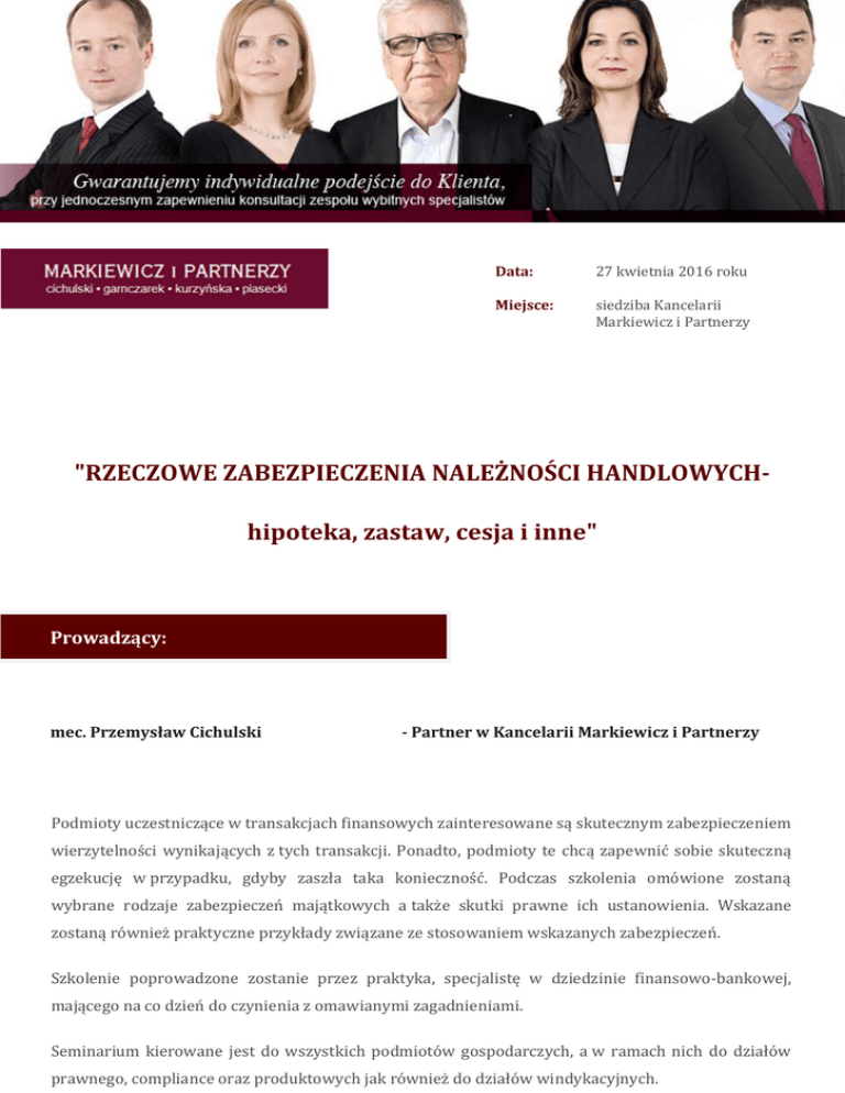 Data: 27 kwietnia 2016 roku Miejsce: siedziba Kancelarii Markiewicz i Partnerzy "RZECZOWE ZABEZPIECZENIA NALEŻNOŚCI HANDLOWYCHhipoteka, zastaw, cesja i inne" Prowadzący: mec. Przemysław Cichulski - Partner w Kancelarii Markiewicz i Partnerzy Podmioty uczestniczące w transakcjach finansowych zainteresowane są skutecznym zabezpieczeniem wierzytelności wynikających z tych transakcji. Ponadto, podmioty te chcą zapewnić sobie skuteczną egzekucję w przypadku, gdyby zaszła taka konieczność. Podczas szkolenia omówione zostaną wybrane rodzaje zabezpieczeń majątkowych a także skutki prawne ich ustanowienia. Wskazane zostaną również praktyczne przykłady związane ze stosowaniem wskazanych zabezpieczeń. Szkolenie poprowadzone zostanie przez praktyka, specjalistę w dziedzinie finansowo-bankowej, mającego na co dzień do czynienia z omawianymi zagadnieniami. Seminarium kierowane jest do wszystkich podmiotów gospodarczych, a w ramach nich do działów prawnego, compliance oraz produktowych jak również do działów windykacyjnych. Al. Ujazdowskie 51 Dom Dochodowy, VI p. 00-536 Warszawa Tel. +48-22 584 7400 Faks +48-22 584 7401 E-mail [email protected] Przemysław Cichulski Radca prawny, Partner kierujący zespołem Markiewicz i Partnerzy specjalizującym się w praktyce finansowo-bankowej. W latach 2002-2008 współpracował z PricewaterhouseCoopers i jednej z Kancelaria została założona w 2004 roku przez pięciu partnerów pragnących realizować własną wizję międzynarodowych kancelarii prawnych, gdzie był doradztwa, w której najważniejszy byłby bezpośredni szefem zespołu finansowo-bankowego. Poprzednio in- kontakt z klientem oraz jego indywidualne potrzeby. house w Raiffeisen Bank Polska S.A. specjalizujący się Kancelaria działała pod firmą Rymar i Partnerzy do w obszarze SME i retail banking. 2011 roku, kiedy to na skutek wyboru adwokata Stanisława Rymara na stanowisko sędziego Trybunału Jest uznanym specjalistą z ponad 10-letnią praktyką Konstytucyjnego w zakresie i korporacyjnego. w charakterze partnera adwokata Marka Markiewicza, Posiada rozległe doświadczenie w międzynarodowych kancelaria zmieniła nazwę na Markiewicz i Partnerzy transakcjach finansowych, włączając w to transakcje Adwokaci i Radcowie Prawni spółka partnerska. prawa finansowego oraz przystąpienia do spółki typu project finance, leveraged finance, transakcje z wykorzystaniem restrukturyzacyjne, w zakresie derywatów, nabycia praktyki transakcje banków rynków i transakcje kapitałowych. Obecnie tworzymy grupę ponad dwudziestu doświadczonych prawników, działających w ramach zespołów kierowanych przez radców Doświadczony w zakresie doradztwa prawnego przy i adwokatów. otwieraniu działalności w Polsce przez zagraniczne z poświęceniem i pasją, oferując naszym klientom banki, wysoki standard obsługi. W naszym zespole znajdują jak również finansowych reprezentowania krajowych instytucji i zagranicznych Wykonujemy prawnych którzy doświadczenie Posiada rozległe doświadczenie pracę się specjaliści o ugruntowanej pozycji na prawniczym, w postępowaniach przed regulatorem. swoją posiadają rynku długoletnie w wiodących polskich w doradztwie i międzynarodowych firmach prawniczych, instytucjach prawnym odnośnie struktur cash management, w tym finansowych oraz spółkach giełdowych. Dzięki ich cash poolingowych, leasingu, pozabilansowych metod fachowemu finansowania, struktur zabezpieczeniowych i handlu wysokiej jakości pomoc prawną, zarówno na rzecz wierzytelnościami przeterminowanymi. Klientów polskich, jak i zagranicznych, prowadząc przygotowaniu możemy świadczyć również obsługę w języku angielskim, francuskim oraz niemieckim. Łączymy doświadczenie globalnej współpracy ze znajomością polskiego rynku. Sukces naszej wszystkim kancelarii dobremu zawdzięczamy zrozumieniu przede specyfiki działalności naszych Klientów, ich celów i potrzeb biznesowych. Pozwala nam to MARKIEWICZ I PARTNERZY ADWOKACI I RADCOWIE PRAWNI SPÓŁKA PARTNERSKA NIP: 7010182710, REGON: 141757745, KRS 0000324766, Sąd Rejonowy dla m. st. Warszawy, www.mplaw.pl na aktywne uczestniczenie w budowaniu strategii działań etapie. i koncepcji biznesowych Klienta już na początkowym Program szkolenia Wydanie zastawu zastawnikowi I. Zagadnienia wstępne i podstawowe c) 1. Rodzaje prawnych zabezpieczeń wierzytelności. Przewłaszczenie na zabezpieczenie Przewłaszczenie na zabezpieczenie - zawarcie umowy, wydanie rzeczy 2. Cel ustanawiania zabezpieczeń majątkowych d) Przelew wierzytelności na zabezpieczenie (cesja) 3. Zakres możliwych (dostępnych) zabezpieczeń majątkowych e) Kaucja gwarancyjna dla wierzytelności finansowych – kryteria podziału, wybór f) Blokada środków na rachunku bankowym optymalnej formy zabezpieczenia. g) Umowa 4. Skutki prawne zabezpieczeń ustanowienia majątkowych – Blokada środków na rachunku bankowym i) Zabezpieczenie na maklerskich instrumentach finansowych zagadnienia prawne. IV. Przystąpienie do długu, przejęcie długu, zmiany III. Charakterystyka prawna zabezpieczeń majątkowych ZABEZPIECZENIA „RZECZOWE": a) lub h) poszczególnych wybrane zastrzeżonego powierniczego Podmioty ustanawiające zabezpieczenia majątkowe - relacje prawne względem dłużnika głównego i wierzyciela. II. rachunku podmiotowe lub organizacyjne stron - skutki dla ustanowionych zabezpieczeń 1. Zmiany dotyczące podmiotu Hipoteka zabezpieczenie majątkowe Ustanowienie hipoteki, 2. Zmiany dotyczące dłużnika Zbycie nieruchomości z hipoteką, 3. Zmiany dotyczące wierzyciela ustanawiającego Udostępnienie hipoteki nieruchomości własnej osobom trzecim, b) V. Akcesoryjność zabezpieczeń - wpływ wykonania lub Realizacja zabezpieczenia. zmiany zobowiązania głównego na ustanowione Zastaw (cywilny, rejestrowy, finansowy) zabezpieczenia Ustanowienie zastawu, 1. Zmiana zobowiązania głównego, Ustanowienie zastawu na majątku os