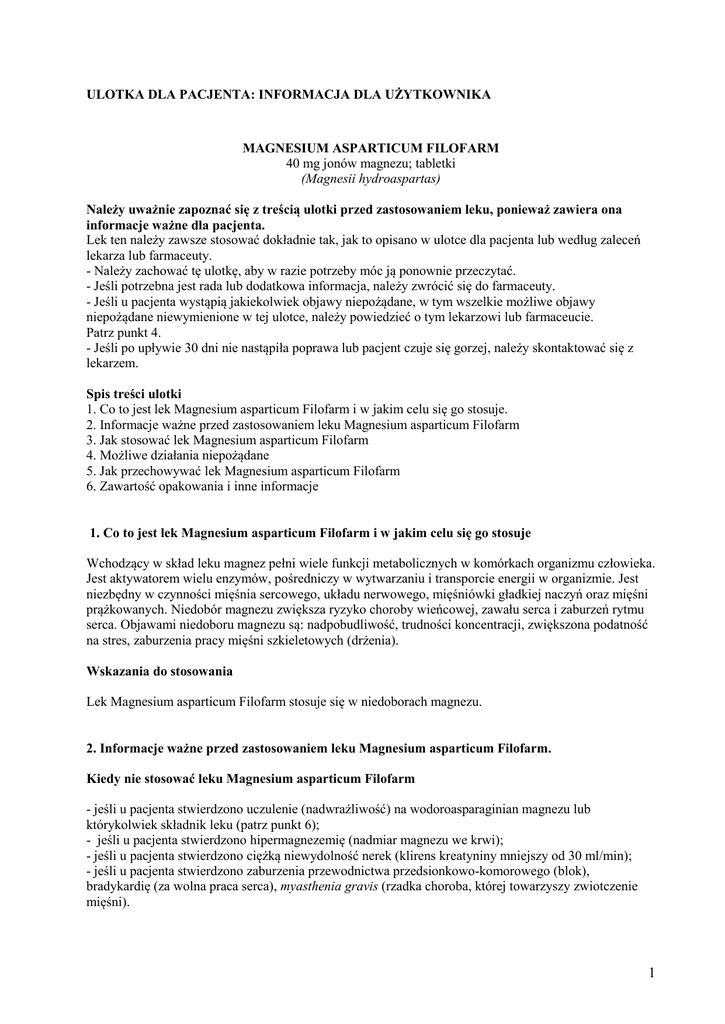 1. Co to jest lek Magnesium asparticum Filofarm i w jakim celu się go stosuje.