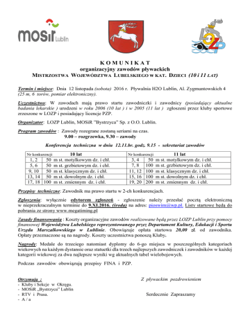 MISTRZOSTWA KOMUNIKAT organizacyjny zawodów pływackich WOJEWÓDZTWA LUBELSKIEGO w KAT. DZIECI (10 i 11 LAT) Termin i miejsce: Dnia 12 listopada (sobota) 2016 r. Pływalnia H2O Lublin, Al. Zygmuntowskich 4 (25 m, 6 torów, pomiar elektroniczny). Uczestnictwo: W zawodach mają prawo startu zawodniczki i zawodnicy (posiadający aktualne badania lekarskie ) urodzeni w roku 2006 (10 lat ) i w 2005 (11 lat ) zgłoszeni przez kluby sportowe zrzeszone w LOZP i posiadający licencje PZP. Organizator: LOZP Lublin, MOSiR ”Bystrzyca” Sp. z O.O. Lublin. Program zawodów : Zawody rozegrane zostaną seriami na czas. 9.00 – rozgrzewka, 9.30 – zawody Konferencja techniczna w dniu 12.11.br. godz. 9.15 - sekretariat zawodów Nr konkurencji 1, 2 50 5, 6 50 9, 10 50 13, 14 50 17, 18 100 10 lat m st. motylkowym dz. i chł. m st. grzbietowym dz. i chł. m st. klasycznym dz. i chł. m st. dowolnym dz. i chł. m st. zmiennym dz. i chł. Nr konkurencji 3, 4 7, 8 11, 12 15, 16 19, 20 50 100 100 100 200 11 lat m st. motylkowym dz. i chł. m st. grzbietowym dz. i chł. m st. klasycznym dz. i chł. m st. dowolnym dz. i chł. m st. zmiennym dz. i chł. Przepisy techniczne: Zawodnik ma prawo startu w 2-ch konkurencjach. Zgłoszenia: wyłącznie edytorem zgłoszeń - zgłoszenie należy przesłać pocztą elektroniczną w nieprzekraczalnym terminie do 9.XI.2016. (środa) na adres: [email protected]. Listy startowe będą do pobrania ze strony www.megatiming.pl Zasady finansowania : Koszty organizacyjne zawodów realizowane będą przez LOZP Lublin przy pomocy finansowej Województwa Lubelskiego reprezentowanego przez Departament Kultury, Edukacji i Sportu Urzędu Marszałkowskiego w Lublinie. Obowiązuje opłata startowa 20,00 zł. od zawodnika. Opłaty przeznaczone są na nagrody. Koszty uczestnictwa ponoszą Kluby. Nagrody: Medale do trzeciego natomiast dyplomy do 6-go miejsca w poszczególnych kategoriach wiekowych na każdym dystansie oraz statuetki dla trzech najlepszych zawodniczek i zawodników w każdej kategorii wiekowej za dwa najlepsze wyniki wg aktualnych tabel wielobojowych. Podczas zawodów obowiązują przepisy FINA i PZP. Otrzymują : - Kluby i Sekcje w Okręgu. - MOSiR „Bystrzyca” Lublin - RTV i Prasa. - A/a Z pływackim pozdrowieniem Serdecznie Zapraszamy