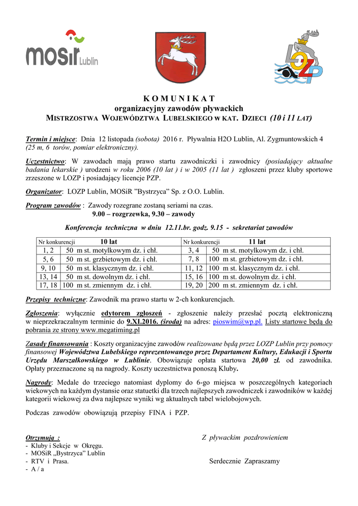 K O M U N I K A T organizacyjny zawodów pływackich