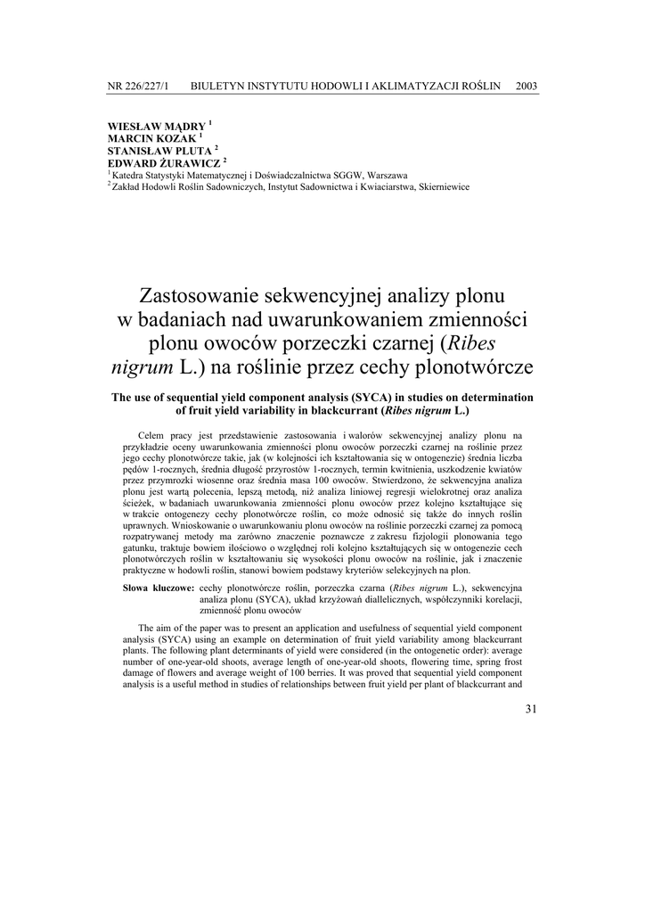 NR 226/227/1 BIULETYN INSTYTUTU HODOWLI I AKLIMATYZACJI ROŚLIN 2003 WIESŁAW MĄDRY 1 MARCIN KOZAK 1 STANISŁAW PLUTA 2 EDWARD ŻURAWICZ 2 1 2 Katedra Statystyki Matematycznej i Doświadczalnictwa SGGW, Warszawa Zakład Hodowli Roślin Sadowniczych, Instytut Sadownictwa i Kwiaciarstwa, Skierniewice Zastosowanie sekwencyjnej analizy plonu w badaniach nad uwarunkowaniem zmienności plonu owoców porzeczki czarnej (Ribes nigrum L.) na roślinie przez cechy plonotwórcze The use of sequential yield component analysis (SYCA) in studies on determination of fruit yield variability in blackcurrant (Ribes nigrum L.) Celem pracy jest przedstawienie zastosowania i walorów sekwencyjnej analizy plonu na przykładzie oceny uwarunkowania zmienności plonu owoców porzeczki czarnej na roślinie przez jego cechy plonotwórcze takie, jak (w kolejności ich kształtowania się w ontogenezie) średnia liczba pędów 1-rocznych, średnia długość przyrostów 1-rocznych, termin kwitnienia, uszkodzenie kwiatów przez przymrozki wiosenne oraz średnia masa 100 owoców. Stwierdzono, że sekwencyjna analiza plonu jest wartą polecenia, lepszą metodą, niż analiza liniowej regresji wielokrotnej oraz analiza ścieżek, w badaniach uwarunkowania zmienności plonu owoców przez kolejno kształtujące się w trakcie ontogenezy cechy plonotwórcze roślin, co może odnosić się także do innych roślin uprawnych. Wnioskowanie o uwarunkowaniu plonu owoców na roślinie porzeczki czarnej za pomocą rozpatrywanej metody ma zarówno znaczenie poznawcze z zakresu fizjologii plonowania tego gatunku, traktuje bowiem ilościowo o względnej roli kolejno kształtujących się w ontogenezie cech plonotwórczych roślin w kształtowaniu się wysokości plonu owoców na roślinie, jak i znaczenie praktyczne w hodowli roślin, stanowi bowiem podstawy kryteriów selekcyjnych na plon. Słowa kluczowe: cechy plonotwórcze roślin, porzeczka czarna (Ribes nigrum L.), sekwencyjna analiza plonu (SYCA), układ krzyżowań diallelicznych, współczynniki korelacji, zmienność plonu owoców The aim of the paper was to present an application and usefulness of sequential yield component analysis (SYCA) using an example on determination of fruit yield variability among blackcurrant plants. The following plant determinants of yield were considered (in the ontogenetic order): average number of one-year-old shoots, average length of one-year-old shoots, flowering time, spring frost damage of flowers and average weight of 100 berries. It was proved that sequential yield component analysis is a useful method in studies of relationships between fruit yield per plant of blackcurrant and 31 Wiesław Mądry ... its determinants which develop in an ontogenetic order. This method could be more suitable in such cases than the linear multiple regression analysis and path analysis. Similar conclusions could be given for other crops, both agricultural and horticultural ones. Description of blackcurrant plant fruit yield variability by its determinants using the proposed method could be important for crop physiology and for breeding directed towards fruit yield. Key words: blackcurrant (Ribes nigrum L.), correlation coefficients, diallel crosses, fruit yield variability, determinants of yield, sequential yield component analysis (SYCA) WSTĘP Plon rolniczy na roślinie jest cechą ilościową, określającą najważniejszy ze względów praktycznych, końcowy rezultat skomplikowanego procesu ontogenezy roślin. Proces ten jest warunkowany przez wielką liczbę różnorodnych przyczyn. Zależnie od kierunku i celu badań można rozpatrywać jego uwarunkowanie przez różne rodzaje czynników, np. czynniki środowiskowe (siedliskowe i uprawowe), genetyczne (geny i genotypy), fizjologiczne i inne. Wszystkie te czynniki wpływają zarówno na plon, jak i na plonotwórcze cechy roślin i łanu, czyli takie cechy ilościowe, które mają określone znaczenie w kształtowaniu plonu roślin w trakcie ontogenezy. Zatem ocena uwarunkowania plonu przez cechy plonotwórcze roślin i łanu dostarcza wiedzy o mechanizmach biologicznych plonowania roślin, która może mieć także duże znaczenie praktyczne w hodowli i uprawie roślin (Fraser i Eaton, 1983; Rozbicki, 1997). Cechy plonotwórcze roślin i łanu kształtują się w różnych fazach ich rozwoju. W wyniku działania wspólnych czynników na procesy rozwojowe roślin w następujących po sobie fazach i wzajemnej kompensacji cech roślin w łanie, cechy plonotwórcze są zazwyczaj w różnym stopniu i kierunku skorelowane, zależnie od przyczyn genetycznych i środowiskowych warunkujących rozpatrywaną zmienność cech roślin (Fraser i Eaton, 1983; Gołaszewski, 1996; Mądry i in., 2000). Przy empirycznym opisie i interpretacji zależności między cechami plonotwórczymi roślin i łanu a plonem, stosuje się różne metody statystyczne (Fraser i Eaton, 1983; Mądry i Kozak, 2000; Kozak, 2002). Najczęściej stosowaną jest analiza liniowej regresji wielokrotnej, a zwłaszcza jej modyfikacja — analiza ścieżek. Ma ona pewne mankamenty w zastosowaniu do cech plonotwórczych rozwijających się sekwencyjnie w ontogenezie (Yadav i in., 1994; Kozak, 2002). Lepszą metodą, bardziej przystającą do rzeczywistości w takich przypadkach, może być metoda sekwencyjnej analizy plonu (Eaton i Kyte, 1978; Eaton i MacPherson, 1978; Gołaszewski, 1996). Jest to metoda statystyczna oparta na specyficznym zastosowaniu regresji krokowej „w przód”, z zachowaniem kolejności wprowadzania cech plonotwórczych do modelu, zgodnej z kolejnością ich kształtowania się w ontogenezie. Pomysł sekwencyjnej analizy plonu pochodzi od kanadyjskich badaczy roślin sadowniczych G. W. Eatona i jego współpracowników (Eaton i Kyte, 1978; Eaton i MacPherson, 1978). Mimo jej, jak się wydaje, walorów jest ona wciąż metodą rzadziej stosowaną. Celem tej pracy jest przedstawienie zastosowania i walorów sekwencyjnej ana