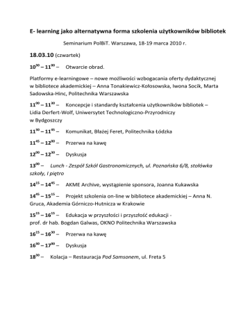 E- learning jako alternatywna forma szkolenia użytkowników bibliotek Seminarium PolBiT. Warszawa, 18-19 marca 2010 r. 18.03.10 (czwartek) 1030 – 1100 – Otwarcie obrad. Platformy e-learningowe – nowe możliwości wzbogacania oferty dydaktycznej w bibliotece akademickiej – Anna Tonakiewicz-Kołosowska, Iwona Socik, Marta Sadowska-Hinc, Politechnika Warszawska 1100 – 1130 – Koncepcje i standardy kształcenia użytkowników bibliotek – Lidia Derfert-Wolf, Uniwersytet Technologiczno-Przyrodniczy w Bydgoszczy 1130 – 1145 – Komunikat, Błażej Feret, Politechnika Łódzka 1145 – 1200 – Przerwa na kawę 1200 – 1230 – Dyskusja 1300 – Lunch - Zespół Szkół Gastronomicznych, ul. Poznaoska 6/8, stołówka szkoły, I piętro 1415 – 1445 – AKME Archive, wystąpienie sponsora, Joanna Kukawska 1445 – 1515 – Projekt szkolenia on-line w bibliotece akademickiej – Anna N. Gruca, Akademia Górniczo-Hutnicza w Krakowie 1515 – 1615 – Edukacja w przyszłości i przyszłośd edukacji prof. dr hab. Bogdan Galwas, OKNO Politechnika Warszawska 1615 – 1630 – Przerwa na kawę 1630 – 1700 – Dyskusja 1830 – Kolacja – Restauracja Pod Samsonem, ul. Freta 5 19.03.10 (piątek) 900 – 930 – ABE Marketing, wystąpienie sponsora, Edyta Burczyk, Regional Sales Manager EER, Databases@Ovid 930 – 1000 – Kursy Biblioteki Politechniki Krakowskiej oferowane studentom na platformie uczelnianej Wirtualna Politechnika – Marta M. Stąporek, Joanna Radzicka, Politechnika Krakowska 1000 – 1030 – Elementy e-learningu w kursie „Czasopisma elektroniczne” – Agnieszka K. Wolaoska, Politechnika Wrocławska 1030 – 1045 – Przerwa na kawę 1045 – 1115 – Przysposobienie biblioteczne on-line w Bibliotece Głównej Politechniki Śląskiej – próba podsumowania – Joanna Dziak, Politechnika Śląska 1115 – 1130 – Komunikat, Marzena Marcinek, Politechnika Krakowska 1130 – 1230 – Dyskusja i zakooczenie obrad 1245 – Lunch - Zespół Szkół Gastronomicznych ul. Poznaoska 6/8, stołówka szkoły, I piętro