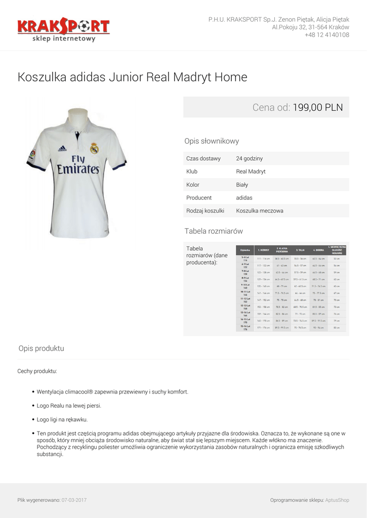P.H.U. KRAKSPORT Sp.J. Zenon Piętak, Alicja Piętak Al.Pokoju 32, 31-564 Kraków +48 12 4140108 Koszulka adidas Junior Real Madryt Home Cena od: 199,00 PLN Opis słownikowy Czas dostawy 24 godziny Klub Real Madryt Kolor Biały Producent adidas Rodzaj koszulki Koszulka meczowa Tabela rozmiarów Tabela rozmiarów (dane producenta): Opis produktu Cechy produktu: Wentylacja climacool® zapewnia przewiewny i suchy komfort. Logo Realu na lewej piersi. Logo ligi na rękawku. Ten produkt jest częścią programu adidas obejmującego artykuły przyjazne dla środowiska. Oznacza to, że wykonane są one w sposób, który mniej obciąża środowisko naturalne, aby świat stał się lepszym miejscem. Każde włókno ma znaczenie. Pochodzący z recyklingu poliester umożliwia ograniczenie wykorzystania zasobów naturalnych i ogranicza emisję szkodliwych substancji. Plik wygenerowano: 07-03-2017 Oprogramowanie sklepu: AptusShop P.H.U. KRAKSPORT Sp.J. Zenon Piętak, Alicja Piętak Al.Pokoju 32, 31-564 Kraków +48 12 4140108 Materiał podstawowy: materiał o specjalnej konstrukcji, 100% poliester; tylny panel: dzianina o gęstym splocie, 100% poliester pochodzący z recyklingu. Informacje dotyczące nadruków: Dostępne są polskie znaki. Zamówienie nadruku możliwe jest tylko i wyłącznie z opcją płatności z góry (przelew lub karta kredytowa). Nie wysyłamy koszulek z nadrukiem za pobraniem (płatnością przy odbiorze). Wykonanie nadruku trwa od 1-5 dni roboczych, liczone od momentu otrzymania wpłaty. Z uwagi na indywidualny charakter zamówienia, koszulka z nadrukiem nie podlega zwrotowi ani wymianie. Warianty produktu Plik wygenerowano: 07-03-2017 128 199,00 PLN 164 199,00 PLN 176 199,00 PLN Oprogramowanie sklepu: AptusShop P.H.U. KRAKSPORT Sp.J. Zenon Piętak, Alicja Piętak Al.Pokoju 32, 31-564 Kraków +48 12 4140108 Galeria Plik wygenerowano: 07-03-2017 Powered by TCPDF (www.tcpdf.org) Oprogramowanie sklepu: AptusShop