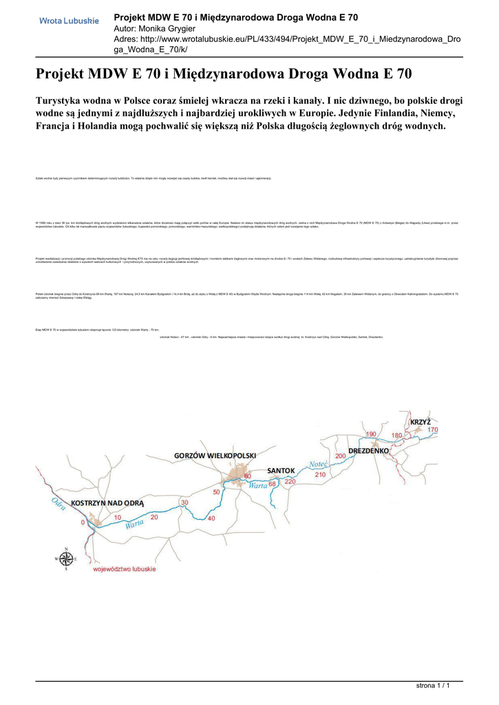 Projekt MDW E 70 i Międzynarodowa Droga Wodna E 70 Autor: Monika Grygier Adres: http://www.wrotalubuskie.eu/PL/433/494/Projekt_MDW_E_70_i_Miedzynarodowa_Dro ga_Wodna_E_70/k/ Projekt MDW E 70 i Międzynarodowa Droga Wodna E 70 Turystyka wodna w Polsce coraz śmielej wkracza na rzeki i kanały. I nic dziwnego, bo polskie drogi wodne są jednymi z najdłuższych i najbardziej urokliwych w Europie. Jedynie Finlandia, Niemcy, Francja i Holandia mogą pochwalić się większą niż Polska długością żeglownych dróg wodnych. Szlaki wodne były pierwszym czynnikiem determinującym rozwój ludzkości. To właśnie dzięki nim mogły rozwijać się osady ludzkie, kwitł handel, możliwy stał się rozwój miast i aglomeracji. W 1996 roku z sieci 36 tys. km śródlądowych dróg wodnych wydzielono kilkanaście szlaków, które docelowo mają połączyć setki portów w całej Europie. Nadano im status międzynarodowych dróg wodnych. Jedna z nich Międzynarodowa Droga Wodna E 70 (MDW E 70) z Antwerpii (Belgia) do Kłajpedy (Litwa) przebiega m.in. przez województwo lubuskie. Od kilku lat marszałkowie pięciu województw (lubuskiego, kujawsko-pomorskiego, pomorskiego, warmińsko-mazurskiego, wielkopolskiego) podejmują działania, których celem jest rozwijanie tego szlaku. Projekt rewitalizacji i promocji polskiego odcinka Międzynarodowej Drogi Wodnej E70 ma na celu: rozwój żeglugi jachtowej śródlądowymi i morskimi statkami żaglowymi oraz motorowymi na drodze E- 70 i wodach Zalewu Wiślanego, rozbudowę infrastruktury portowej i zaplecza turystycznego, uatrakcyjnienie turystyki zbiorowej poprzez umożliwienie zwiedzania obiektów o wysokich walorach kulturowych i przyrodniczych, usytuowanych w pobliżu szlaków wodnych. Polski odcinek biegnie przez Odrę do Kostrzyna 68 km Wartą, 187 km Notecią, 24,5 km Kanałem Bydgoskim i 14,4 km Brdą, aż do styku z Wisłą (i MDW E 40) w Bydgoskim Węźle Wodnym. Następnie droga biegnie 114 km Wisłą, 62 km Nogatem, 35 km Zalewem Wiślanym, do granicy z Obwodem Kaliningradzkim. Do systemu MDW E 70 zaliczamy również Szkarpawę i rzekę Elbląg. Etap MDW E 70 w województwie lubuskim obejmuje łącznie 123 kilometry: odcinek Warty - 70 km, odcinek Noteci - 47 km , odcinek Odry - 6 km. Najważniejsze miasta i miejscowości leżące wzdłuż drogi wodnej to: Kostrzyn nad Odrą, Gorzów Wielkopolski, Santok, Drezdenko. strona 1 / 1 Powered by TCPDF (www.tcpdf.org)