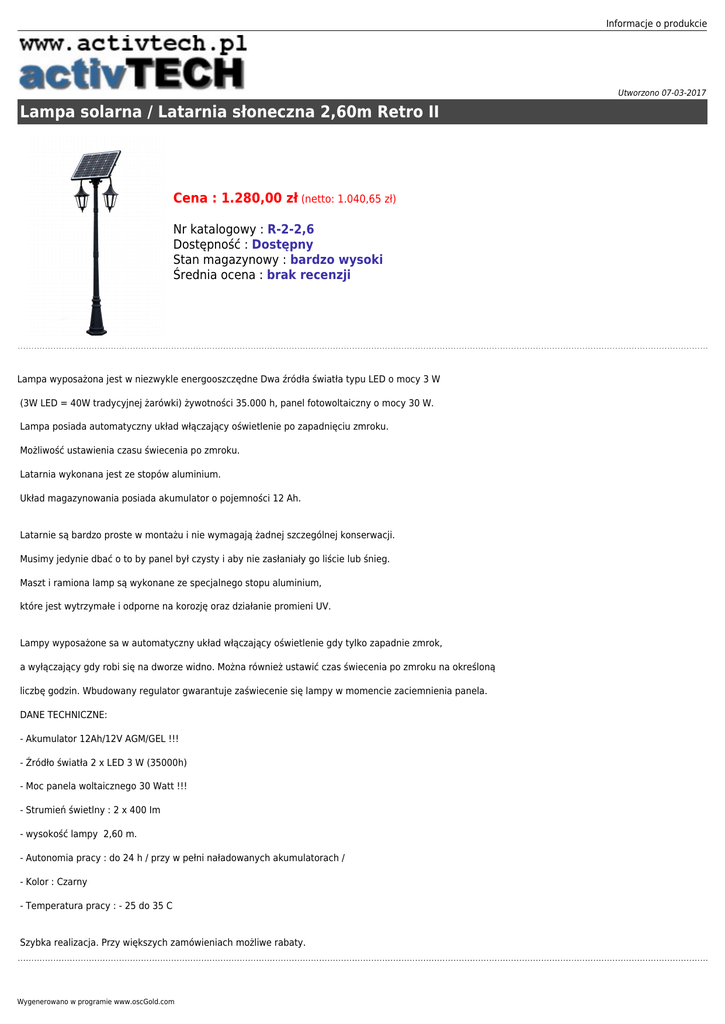 Informacje o produkcie Utworzono 07-03-2017 Lampa solarna / Latarnia słoneczna 2,60m Retro II Cena : 1.280,00 zł (netto: 1.040,65 zł) Nr katalogowy : R-2-2,6 Dostępność : Dostępny Stan magazynowy : bardzo wysoki Średnia ocena : brak recenzji Lampa wyposażona jest w niezwykle energooszczędne Dwa źródła światła typu LED o mocy 3 W (3W LED = 40W tradycyjnej żarówki) żywotności 35.000 h, panel fotowoltaiczny o mocy 30 W. Lampa posiada automatyczny układ włączający oświetlenie po zapadnięciu zmroku. Możliwość ustawienia czasu świecenia po zmroku. Latarnia wykonana jest ze stopów aluminium. Układ magazynowania posiada akumulator o pojemności 12 Ah. Latarnie są bardzo proste w montażu i nie wymagają żadnej szczególnej konserwacji. Musimy jedynie dbać o to by panel był czysty i aby nie zasłaniały go liście lub śnieg. Maszt i ramiona lamp są wykonane ze specjalnego stopu aluminium, które jest wytrzymałe i odporne na korozję oraz działanie promieni UV. Lampy wyposażone sa w automatyczny układ włączający oświetlenie gdy tylko zapadnie zmrok, a wyłączający gdy robi się na dworze widno. Można również ustawić czas świecenia po zmroku na określoną liczbę godzin. Wbudowany regulator gwarantuje zaświecenie się lampy w momencie zaciemnienia panela. DANE TECHNICZNE: - Akumulator 12Ah/12V AGM/GEL !!! - Źródło światła 2 x LED 3 W (35000h) - Moc panela woltaicznego 30 Watt !!! - Strumień świetlny : 2 x 400 Im - wysokość lampy 2,60 m. - Autonomia pracy : do 24 h / przy w pełni naładowanych akumulatorach / - Kolor : Czarny - Temperatura pracy : - 25 do 35 C Szybka realizacja. Przy większych zamówieniach możliwe rabaty. Wygenerowano w programie www.oscGold.com