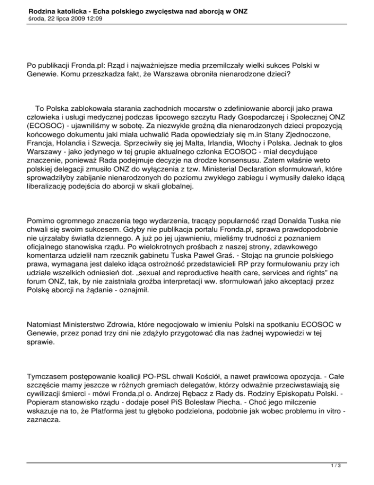 Rodzina katolicka - Echa polskiego zwycięstwa nad aborcją w ONZ