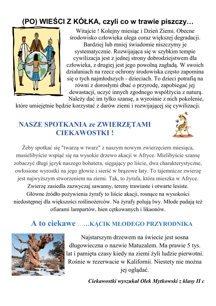 (PO) WIEŚCI Z KÓŁKA, czyli co w trawie piszczy… Witajcie ! Kolejny miesiąc i Dzień Ziemi. Obecne środowisko człowieka ulega coraz większej degradacji. Bardziej lub mniej świadomie niszczymy je systematycznie. Rozwijająca się w szybkim tempie cywilizacja jest z jednej strony dobrodziejstwem dla człowieka, z drugiej jest jego powolną zagładą. W swoich działaniach na rzecz ochrony środowiska często zapomina się o tych najmłodszych - dzieciach. To dzieci potrafią na równi z dorosłymi dbać o przyrodę, zapobiegać jej dewastacji, uczyć innych zgodnego współżycia z naturą. Należy dać im tylko szansę, a wyrośnie z nich pokolenie, które umiejętnie będzie korzystać z darów ziemi i rozwijającej się cywilizacji. NASZE SPOTKANIA ze ZWIERZĘTAMI CIEKAWOSTKI ! Żeby spotkać się "twarzą w twarz" z naszym nowym zwierzęciem miesiąca, musielibyście wspiąć się na wysokie drzewo akacji w Afryce. Mielibyście szansę zobaczyć długi język naszego bohatera, sięgający po liście, dwa charakterystyczne, owłosione wyrostki na jego głowie i sierść w brązowe łaty. To tajemnicze zwierzę jest najwyższym stworzeniem na ziemi. Tak, to żyrafa, która mieszka w Afryce. Zwierzę zasiedla zazwyczaj sawanny, tereny trawiaste i otwarte lesiste. Główne źródło pożywienia żyrafy to liście akacji, rosnące na wysokości niedostępnej dla większości roślinożerców. Na żyrafy polują lwy. Młode padają też ofiarami lampartów, hien cętkowanych i likaonów. A to ciekawe ……KĄCIK MŁODEGO PRZYRODNIKA Najstarszym drzewem na świecie jest sosna długowieczna o nazwie Matuzalem. Ma prawie 5 tys. lat i pamięta czasy kiedy na ziemi żyli ludzie pierwotni. Rośnie w rezerwacie w Kalifornii. Niestety nie można jej oglądać. Ciekawostki wyszukał Olek Mytkowski z klasy II c COŚ DLA MALUCHA I STARSZAKA 1. Odszukaj i pokoloruj liście z cyfrą 3. 3. Znajdź 10 różnic. 2. Która żyrafa nie pasuje do reszty. Odszukaj ją i pokoloruj. UWAGA ! KONKURS! Rozwiąż krzyżówkę, przynieś rozwiązanie do sali 111 do piątku 29 kwietnia. Mało czasu, pospiesz się. Nagrody dla Wszystkich. Pamiętaj! Na kartce z rozwiązaniem podaj swoje imię i nazwisko oraz klasę. ZESPÓŁ REDAKCYJNY: uczniowie i opiekun Szkolnego Koła Ekologiczno-Przyrodniczego. Nr 4 (40) – KWIECIEŃ 2016r. Święto naszej planety Ziemi. Pamiętamy o niej zawsze, nie tylko 22 kwietnia. Dbamy, pielęgnujemy i szanujemy. Chcemy aby pozostała czysta dla przyszłych pokoleń
