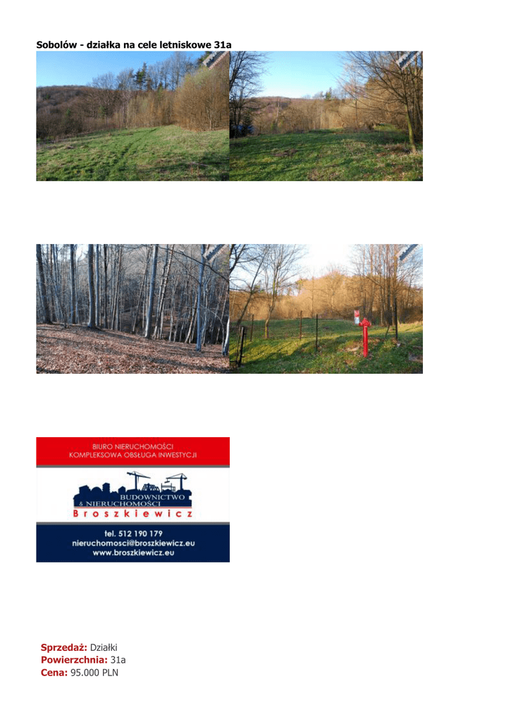 Sobolów - działka na cele letniskowe 31a Sprzedaż: Działki Powierzchnia: 31a Cena: 95.000 PLN Dostępność: Dostępne Typ: Działka Nr oferty: 191 Sobolów. Oferta sprzedaży dotyczy działki z przeznaczeniem pod zabudowę mieszkaniową jednorodzinną lub rekreacyjną o powierzchni 31a. Spokojna okolica w bezpośrednim sąsiedztwie lasu, w dalszym sąsiedztwie domy letniskowe i mieszkalne. Dojazd drogą asfaltową, wjazd na działkę z drogi betonowej. Media prąd i wodociąg znajdują się na działce. Na działce pozostał fundament po domu jednorodzinnym. Piękny widok, działka lekko nachylona na zachód. Polecamy! Adres tego pliku: http://www.broszkiewicz.eu/pdf/offer/197 Adres oferty na stronie: http://www.broszkiewicz.eu/site/offers/show/197/sobolow-dzialka-cele-letniskowe-31a.html