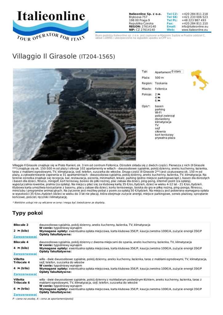 Italieonline Sp. z o.o. Bryksova 757 198 00 Praga 9 Republika Czeska REGON: 27614140 NIP: CZ 27614140 Tel CZ: Tel SK: Tel PL: Fax: Email: Web: +420 284 811 218 +421 233 006 523 +48 223 987 493 +420 284 811 210 [email protected] www.italieonline.eu Biuro podróży Italieonline sp. z o.o. jest zapisane w Miejskim Sądzie w Pradze oddział C, wkład 118991 i ubezpieczone na wypadek upadku w ČPP a.s. Villaggio Il Girasole (IT204-1565) Typ: Apartament 0 stars Plaża: 500 m Region: Toskania Miasto: Follonica Pokoje: 2 4 6 Opis*: basen parking Wi-Fi pobyt zwierząt dozwolony klimatyzacja TV sejf siłownia kort tenisowy prywatna plaża Villaggio Il Girasole znajduje się w Prato Ranieri, ok. 3 km od centrum Follonica. Ośrodek składa się z dwóch części. Pierwsza z nich (Il Girasole ***) znajduje się ok. 150-500 m od plaży i oferuje 102 apartamenty w willach - dwuosobowe sypialnie, pokój dzienny, aneks kuchenny, łazienka, taras z mablami ogrodowymi, TV, klimatyzacja, sejf, telefon, suszarka do włosów. Druga część (Il Girasole 2**) jest usytuowana ok. 150 m od plaży, a zakwaterowanie zapewnia w 31 apartamentach - dwuosobowa sypialnia, pokój dzienny, aneks kuchenny, łazienka, TV, klimatyzacja. Na terenie ośrodka znajduje się recepcja, bar, restauracja, pizzeria, minimarket, lekarz, parking (jedno miejsce parkingowe/apt.), basen dla dorosłych i basen dla dzieci, fitness, minigolf, kort tenisowy, boisko do piłki nożnej, plac zabaw dla dzieci, ping-pong, internet point (za opłatą), wypożyczalnia rowerów, pralnia (za opłatą). Na miejscu płaci się za klubową kartę 35 €/os./tydzień, dzieci w wieku 4-12 lat - 21 €/os./tydzień. Klubowa karta umożliwia korzystanie z basenu, placu zabaw dla dzieci, kortu tenisowego, boiska do gry w piłkę nożną, ping-ponga, fitnessu, miniclubu i programów animacyjnych. Na życzenie jest możliwy pobyt z psem za opłatą 50 €/tydzień. Na miejscu jest pobierana wymagana opłata w wysokości 35 €/os./tydzień (dzieci w wieku do 3 lat nie płacą), która obejmuje zużycie anergii, miejsce parkingowe, serwis plażowy, sprzątanie końcowe, pościel, ręczniki i klimatyzację. * Niektóre usługi nie są wliczone w cenę i mogą być świadczone za dopłatą. Typy pokoi Bilocale 2 2 (bilo) Zarezerwować Bilocale 4 4 (bilo) Zarezerwować Villetta Trilocale 4 4 (trilo) Zarezerwować Villetta Trilocale 6 6 (trilo) Zarezerwować dwuosobowa sypialnia, pokój dzienny, aneks kuchenny, łazienka, TV, klimatyzacja W cenie: tygodniowy wynajem Wymagane opłaty: ewentualna opłata miejscowa, karta klubowa 35€/P, kaucja zwrotna 100€/A, zużycie energii 35€/P Opłaty fakultatywne: dwuosobowa sypialnia, pokój dzienny z dwoma miejscami do spania, aneks kuchenny, łazienka, TV, klimatyzacja W cenie: tygodniowy wynajem Wymagane opłaty: ewentualna opłata miejscowa, karta klubowa 35€/P, kaucja zwrotna 100€/A, zużycie energii 35€/P Opłaty fakultatywne: willa - dwie dwuosobowe sypialnie, pokój dzienny, aneks kuchenny, łazienka, taras z mablami ogrodowymi, TV, klimatyzacja, sejf, telefon, suszarka do włosów W cenie: tygodniowy wynajem Wymagane opłaty: ewentualna opłata miejscowa, karta klubowa 35€/P, kaucja zwrotna 100€/A, zużycie energii 35€/P Opłaty fakultatywne: willa - dwie dwuosobowe sypialnie, pokój dzienny z rozkładanym podwójnym łóżkiem, aneks kuchenny, łazienka, taras z mablami ogrodowymi, TV, klimatyzacja, sejf, telefon, suszarka do włosów W cenie: tygodniowy wynajem Wymagane opłaty: ewentualna opłata miejscowa, karta klubowa 35€/P, kaucja zwrotna 100€/A, zużycie energii 35€/P Opłaty fakultatywne: P - cena na osobę, A - cena za apartament/pokój Prezentowane zdjęcia są przykładowe. https://www.italieonline.eu/pl/follonica/villaggio-il-girasole-1565.html www.ITALIEONLINE.eu TOUR OPERATOR FOR ITALY
