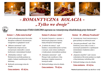 - ROMANTYCZNA KOLACJA „Tylko we dwoje” Restauracja STARA KARCZMA zaprasza na romantyczną obiadokolację przy świecach* Zestaw I „Tylko mnie kochaj” Zestaw II „Romeo i Julia” Listki podwędzanej piersi kurczaka skropione malinowo-chrzanowym vinegretem na gałązkach rucoli Soczyste Carpaccio z ananasa z kolorowym pieprzem i świeżą miętą skropione dressingiem „Miłosne uniesienie” czyli Polędwiczka wieprzowa na warzywnym ratatouille z sosem kurkowym i ziemniakami fondant „Z miłości do natury” czyli Sandacz z mazurskich jezior na łożu z warzyw, sosie winno-maślanym z tradycyjnym ziemniakiem podany „Niebiańska rozkosz” czyli Wyśmienita szarlotka podana na ciepło z lodami waniliowymi i bitą śmietaną „Namiętne uniesienie” czyli Płonące lody waniliowe z bitą śmietaną i ciepłym musem ze świeżych malin Kieliszek czerwonego wina do obiadu Kieliszek białego wina do obiadu Cena zestawu: 65 zł/os. Cena zestawu: 70 zł/os. Zestaw III „Miłosny Pocałunek” Aromatyczny łosoś marynowany w ginie podany na ziołowym sosie „Soczysty pocałunek” czyli Filet drobiowy (sous-vide) w sosie z suszonych pomidorów z opiekanymi ziemniakami i bukietem sałat z winegretem „Upojenie zmysłów” czyli mocno czekoladowe Brownie podane na ciepło z bitą śmietaną i odrobiną chili Kieliszek białego wina do obiadu Cena zestawu: 65 zł/os. *Możliwość zamówienia kwiatów ( np. róża 50 cm = 10 zł)