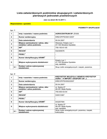 Lista zatwierdzonych podmiotów skupujących i zatwierdzonych pierwszych jednostek przetwórczych stan na dzień 06.12.2011 r. Województwo: opolskie PODMIOTY SKUPUJĄCE Lp.: 1 1 Imię i nazwisko / nazwa podmiotu AGROCENTRUM SP. Z O.O. 2 Numer ewidencyjny KRE/OP/PS/0001/2007 3 Data zatwierdzenia 05.04.2007 4 Miejsce zamieszkania i adres, albo siedziba i adres podmiotu Olszowa, Księży Las 1 47-100 Strzelce Opolskie 5 NIP1 756-183-61-65 1 532309576 6 REGON 7 2 PESEL - 8 Numer identyfikacyjny ARiMR3 - 9 Miejsce wykonywania działalności Księży Las 1 47-100 Strzelce Opolskie woj. opolskie Rodzaj i zakres wykonywanej działalności Skup roślin energetycznych: rzepak, pszenica. 1 Imię i nazwisko / nazwa podmiotu KRZYSZTOF WOJDYŁA I HENRYK KRZYSZTOF AGRA – H IMPORT I EKSPORT SP. J. 2 Numer ewidencyjny KRE/OP/PS/0002/2007 3 Data zatwierdzenia 05.04.2007 4 Miejsce zamieszkania i adres, albo siedziba i adres podmiotu ul. Nyska 27 48-351 Biała Nyska 5 NIP1 755-000-53-54 6 REGON1 9.1 Lp.: 2 530513367 2 7 - PESEL 3 8 Numer identyfikacyjny ARiMR 9 Miejsce wykonywania działalności 9.1 Rodzaj i zakres wykonywanej działalności 043257594 ul. Nyska 27 48-351 Biała Nyska woj. opolskie Skup roślin energetycznych: pszenica, rzepak, kukurydza. Lp.:3 1 Imię i nazwisko / nazwa podmiotu MARCHEM – MARCINISZYN SPÓŁKA JAWNA 2 Numer ewidencyjny KRE/OP/PS/0003/2007 3 Data zatwierdzenia 05.04.2007 4 Miejsce zamieszkania i adres, albo siedziba i adres podmiotu ul. Polanowicka 11A 46-220 Byczyna 5 NIP1 751-000-00-95 6 REGON1 530548590 7 PESEL2 - 8 Numer identyfikacyjny ARiMR3 - 9 Miejsce wykonywania działalności ul. Polanowicka 11A 46-220 Byczyna woj. opolskie 9.1 Rodzaj i zakres wykonywanej działalności Skup roślin energetycznych: rzepak, pszenica; Lp.: 4 1 Imię i nazwisko / nazwa podmiotu FARMER MYŚLIWY I FALKOWSKI SP. J. 2 Numer ewidencyjny KRE/OP/PS/0004/2007 3 Data zatwierdzenia 05.04.2007 4 Miejsce zamieszkania i adres, albo siedziba i adres podmiotu ul. Raciborska 22 48-100 Głubczyce 5 NIP1 748-000-30-99 6 REGON1 530553763 7 PESEL2 - 8 Numer identyfikacyjny ARiMR3 - 9 Miejsce wykonywania działalności 9.1 ul. Oświęcimska 11 48-100 Głubczyce woj. opolskie Skup roślin energetycznych: pszenica, rzepak, Rodzaj i zakres wykonywanej działalności kukurydza; Lp.: 5 1 Imię i nazwisko / nazwa podmiotu WIDAWA SP. Z O.O. 2 Numer ewidencyjny KRE/OP/PS/0005/2007 3 Data zatwierdzenia 05.04.2007 4 Miejsce zamieszkania i adres, albo siedziba i adres podmiotu Biestrzykowice ul. Ludowa 24 46-112 Świerczów 5 NIP1 752-135-24-32 6 REGON1 532194370-17214 7 PESEL2 - 8 Numer identyfikacyjny ARiMR3 - 9 Miejsce wykonywania działalności 9.1 Suszarnia Biestrzykowice-Miodary 46-112 Świerczów woj. opolskie Skup roślin energetycznych: rzepak, pszenica, Rodzaj i zakres wykonywanej działalności kukurydza; Lp.: 6 1 Imię i nazwisko / nazwa podmiotu GRUPA PRODUCENTÓW ROLNYCH CENTRALA NASIENNA SP. Z O.O. 2 Numer ewidencyjny KRE/OP/PS/0006/2007 3 Data zatwierdzenia 05.04.2007 4 Miejsce zamieszkania i adres, albo siedziba i adres podmiotu ul. Karola Miarki 11 46-200 Kluczbork 5 NIP1 751-167-25-66 1 532467677 6 REGON 7 PESEL2 - 8 Numer identyfikacyjny ARiMR3 - ul. Karola Miarki 11 46-200 Kluczbork woj. opolskie Skup roślin energetycznych: rzepak, pszenica, 9.1 Rodzaj i zakres wykonywanej działalności jęczmień, kukurydza, żyto, pszenżyto; Gotartów 10 Miejsce wykonywania działalności 46-211 Kujakowice Górne woj. opolskie Skup roślin energetycznych: trawa energetyczna, wierzba energetyczna, owies, mieszanki zbożowe, 10.1 Rodzaj i zakres wykonywanej działalności ślazowiec pensylwański, miskant olbrzymi, topinambur, spartina preriowa; 9 Miejsce wykonywania działalności Lp.: 7 1 Imię i nazwisko / nazwa podmiotu PRZEDSIĘBIORSTWO HANDLOWE AGROMUND EDMUND PODESZWA 2 Numer ewidencyjny KRE/OP/PS/0007/2007 3 Data zatwierdzenia 05.04.2007 4 Miejsce zamieszkania i adres, albo siedziba i adres podmiotu ul. Piłsudskiego 25 46-100 Namysłów 5 NIP1 752-000-08-37 1 530587868 6 REGON 7 PESEL2 - 8 Numer identyfikacyjny ARiMR3 - 9 9.1 Dąbrowa Namysłowska ul. Kasztanowa 5 Miejsce wykonywania działalności 46-112 Świerczów woj. opolskie Skup roślin energetycznych: rzepak, pszenica, Rodzaj i zakres wykonywanej działalności jęczmień, żyto, owies, kukurydza; Lp.: 8 1 Imię i nazwisko / nazwa podmiotu SPÓŁDZIELNIA PRODUCENTÓW NASION ROŚLIN OLEISTYCH EKO – OLEJ 2 Numer ewidencyjny KRE/OP/PS/0008/2007 3 Data zatwierdzenia 05.04.2007 4 Miejsce zamieszkania i adres, albo siedziba i adres podmiotu Wyszków Śląski 46 48-321 Niwnica 5 NIP1 753-224-12-45 6 REGON1 160005111 7 PESEL2 3 8 Numer identyfikacyjny ARiMR 9 Miejsce wykonywania działalności 9.1 Domaszkowice 48-321 Niwnica woj. opolskie Rodzaj i zakres wykonywanej działalności Skup roślin energetycznych: rzepak; Lp.: 9 1 Imię i nazwisko / nazwa podmiotu KORAGRO SP. Z O.O. 2 Numer ewidencyjny KRE/OP/PS/0009/2007 3 Data zatwierdzenia 05.04.2007 4 Miejsce zamieszkania i adres, albo siedziba i adres podmiotu ul. Powstańców Śląskich 11 48-317 Korfantów 5 NIP1 753-210-47-90 6 REGON1 531680883 7 PESEL2 - 8 Numer identyfikacyjny ARiMR3 - ul. Powstańców Śląskich 11 48-317 Korfantów woj. opolskie Skup roślin energetycznych: pszenica, rzepak, 9.1 Rodzaj i zakres wykonywanej działalności kukurydza; ul. Jagielnicka Ścinawa Nyska 10 Miejsce wykonywania działalności 48-325 Ścinawa Mała woj. opolskie Skup roślin energetycznych: pszenica, rzepak, 10.1 Rodzaj i zakres wykonywanej działalności kukurydza; 9 Miejsce wykonywania działalności Lp.:10 1 Imię i nazwisko / nazwa podmiotu FLORA SP. Z O.O. 2 Numer ewidencyjny KRE/OP/PS/0010/2007 3 Data zatwierdzenia 05.04.2007 4 Miejsce zamieszkania i adres, albo siedziba i adres podmiotu ul. Kopernika 15 46-320 Praszka 5 NIP1 576-145-07-65 6 REGON1 532240809 2 7 - PESEL 3 8 Numer identyfikacyjny ARiMR 9 Miejsce wykonywania działalności 9.1 ul. Wygodzka 1 46-300 Olesno woj. opolskie Rodzaj i