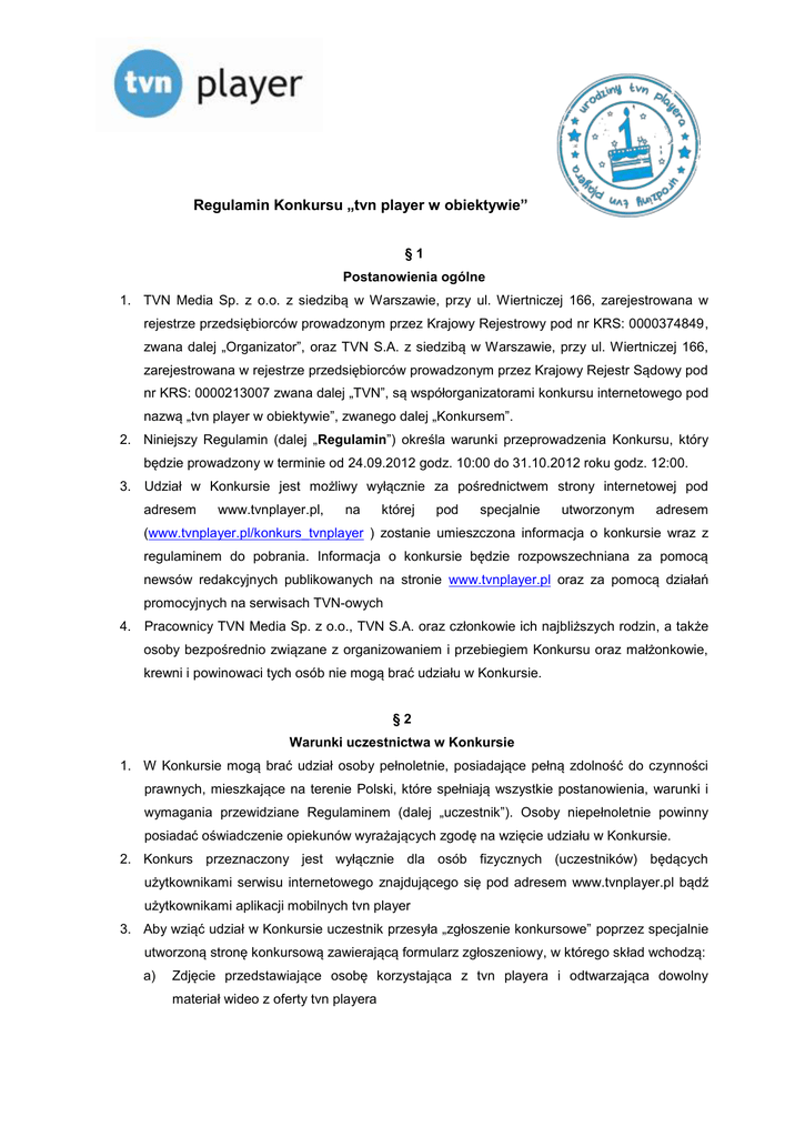Regulamin Konkursu „tvn player w obiektywie” §1 Postanowienia ogólne 1. TVN Media Sp. z o.o. z siedzibą w Warszawie, przy ul. Wiertniczej 166, zarejestrowana w rejestrze przedsiębiorców prowadzonym przez Krajowy Rejestrowy pod nr KRS: 0000374849, zwana dalej „Organizator”, oraz TVN S.A. z siedzibą w Warszawie, przy ul. Wiertniczej 166, zarejestrowana w rejestrze przedsiębiorców prowadzonym przez Krajowy Rejestr Sądowy pod nr KRS: 0000213007 zwana dalej „TVN”, są współorganizatorami konkursu internetowego pod nazwą „tvn player w obiektywie”, zwanego dalej „Konkursem”. 2. Niniejszy Regulamin (dalej „Regulamin”) określa warunki przeprowadzenia Konkursu, który będzie prowadzony w terminie od 24.09.2012 godz. 10:00 do 31.10.2012 roku godz. 12:00. 3. Udział w Konkursie jest możliwy wyłącznie za pośrednictwem strony internetowej pod adresem www.tvnplayer.pl, na której pod specjalnie utworzonym adresem (www.tvnplayer.pl/konkurs_tvnplayer ) zostanie umieszczona informacja o konkursie wraz z regulaminem do pobrania. Informacja o konkursie będzie rozpowszechniana za pomocą newsów redakcyjnych publikowanych na stronie www.tvnplayer.pl oraz za pomocą działań promocyjnych na serwisach TVN-owych 4. Pracownicy TVN Media Sp. z o.o., TVN S.A. oraz członkowie ich najbliższych rodzin, a także osoby bezpośrednio związane z organizowaniem i przebiegiem Konkursu oraz małżonkowie, krewni i powinowaci tych osób nie mogą brać udziału w Konkursie. §2 Warunki uczestnictwa w Konkursie 1. W Konkursie mogą brać udział osoby pełnoletnie, posiadające pełną zdolność do czynności prawnych, mieszkające na terenie Polski, które spełniają wszystkie postanowienia, warunki i wymagania przewidziane Regulaminem (dalej „uczestnik”). Osoby niepełnoletnie powinny posiadać oświadczenie opiekunów wyrażających zgodę na wzięcie udziału w Konkursie. 2. Konkurs przeznaczony jest wyłącznie dla osób fizycznych (uczestników) będących użytkownikami serwisu internetowego znajdującego się pod adresem www.tvnplayer.pl bądź użytkownikami aplikacji mobilnych tvn player 3. Aby wziąć udział w Konkursie uczestnik przesyła „zgłoszenie konkursowe” poprzez specjalnie utworzoną stronę konkursową zawierającą formularz zgłoszeniowy, w którego skład wchodzą: a) Zdjęcie przedstawiające osobę korzystająca z tvn playera i odtwarzająca dowolny materiał wideo z oferty tvn playera b) Opis zdjęcia (zawierającego max. 700 znaków ze spacjami) z informacją, gdzie i w jakich okolicznościach zostało zrobione zdjęcie. Opis zdjęcia będzie również podlegał ocenie jury konkursowego. c) Dane uczestnika: imię, nazwisko, adres e-mail oraz telefon kontaktowy wraz z oświadczeniem dotyczącym autorstwa pracy konkursowej. 4. Zgłoszenie konkursowe nie może zawierać jakichkolwiek przekazów promocyjnych lub reklamowych m.in. towarów, usług, znaków towarowych i/lub podmiotów (pomijając znak towarowy tvn playera). 5. Nadesłane poprawnie (tzn. zgodnie z Regulaminem) zgłoszenia konkursowe będą oceniane przez Jury Konkursowe. Kryterium oceny Jury Konkursowego będzie wybór najciekawszych i najbardziej kreatywnych zgłoszeń konkursowych. 6. W celu weryfikacji uczestnika i/lub wydania zwycięzcy nagrody konkursowej, uczestnik Konkursu jest zobowiązany do podania danych określonych w ust. 3 pkt (b) niniejszego paragrafu. 7. Imiona, nazwiska oraz zgłoszenia konkursowe zwycięzców, którym zostaną przyznane nagrody w Konkursie mogą być udostępnione publicznie na stronie www.tvnplayer.pl. 8. Przystępując do Konkursu poprzez wykonanie czynności, o których mowa w § 2 i § 3 Regulaminu, uczestnik Konkursu: a) wyraża zgodę na wykorzystywanie przez Organizatora swojego imienia, nazwiska i pseudonimu oraz opisu z przesłanego zgłoszenia konkursowego dla celów promocji i reklamy TVN oraz programów telewizyjnych i serwisów internetowych rozpowszechnianych przez TVN, b) oświadcza i gwarantuje, że inne osoby wymienione w zgłoszeniu konkursowym wyrażają zgodę na wykorzystanie przez Organizatora swojego imienia i nazwiska, pseudonimu, wizerunku wykorzystanego w zgłoszeniu konkursowym w zakresie wymienionych w ust. 7 niniejszego paragrafu pól eksploatacji i ponosi z tego tytułu wyłączną odpowiedzialność, a ww. osoby udzieliły przedmiotowej zgody na piśmie. §3 Przebieg Konkursu 1. Konkurs polega na przesłaniu przez uczestnika w określonym terminie (szczegółowo opisanym w § 3 pkt. 2) zgłoszenia konkursowego (zdjęcie + opis + dane uczestnika) zgodnie z § 2 pkt 3. niniejszego Regulaminu. 2. Zgłoszenia konkursowe powinny być przesyłane poprzez specjalnie utworzoną stronę konkursową i znajdujący się na niej formularz konkursowy 3. Konkurs podzielony jest na 4 etapy: i. Etap 1 (trwający w terminie od. 24.09.2012 r., godz. 10:00 do 21.10.2012 r., godz. 11:59) polegający na dostarczaniu zgłoszeń konkursowych poprzez formularz konkursowy umieszczony na specjalnie utworzonej stronie konkursowej pod adresem wskazanym w § 1, pkt 3. ii. Etap 2 (od 21.10.2012 r., godz.12:00 do 24.10.2012 r., godz. 11:59) – wyłonienie 10 najciekawszych zgłoszeń konkursowych, które zostaną opublikowane w serwisie tvnplayer.pl w celu dalszego głosowania (głosowanie użytkowników) iii. Etap 3 (od 24.10.2012 r., godz. 12:00 do 31.10.2012 r., godz. 11:59) – głosowanie użytkowników serwisu tvnplayer.pl na najlepsze zgłoszenia konkursowe iv. Etap 4 (31.10.2012 r., godz. 12:00) – wyłonienie zwycięzców konkursu i podanie informacji wraz z publikacją zwycięskich zgłoszeń konkursowych w serwisie tvnplayer.pl 4. Organizator oraz TVN powołują 3-osobowe Jury konkursowe, które po zapoznaniu się z nadesłanymi do konkursu zgłoszeniami wybierze trzy najciekawsze, jego zdaniem zgłoszenia. Jury Konkursu podejmuje decyzje w głosowaniu jawnym, zwykłą większością głosów. 5. Przyznanie nagrody jej Zwycięzcom zos