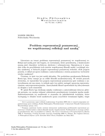 Studia Philosophica Wr a t i s l av i e n s i a vol. VI, fasc. 4 (2011) MAREK SIKORA Politechnika Wrocławska Problem reprezentacji poznawczej we współczesnej refleksji nad nauką* Literatura na temat problemu reprezentacji poznawczej we współczesnej refleksji nad nauką jest tak bogata, że rozważania, które przedstawię, z konieczności muszą mieć charakter wybiórczy, skrótowy i schematyczny. Ograniczę je w zasadzie tylko do przybliżenia tych nurtów współczesnej filozofii nauki i socjologii wiedzy naukowej, w których pojęcie reprezentacji poznawczej wchodzi, obok pojęcia prawdy, w skład osi sporu realizmu z antyrealizmem o status poznawczy wytworów wiedzy naukowej1. Uważam, że spór ten jest nadal aktualny. Nie podzielam przekonania Richarda Rorty’ego, który uznaje go za relikt filozofii modernistycznej. W swoich pracach stwierdza, że wprawdzie bez pojęcia reprezentacji poznawczej spór realizmu z antyrealizmem nie ma sensu, to jednak spór ten należy zastąpić opozycją reprezentacjonizm–antyreprezentacjonizm. Amerykański filozof opowiedział się zdecydowanie za drugim z tych stanowisk. W opinii Rorty’ego dyskusja między realistami a antyrealistami dotyczy głównie pytania, czy można wskazać odniesienie przedmiotowe terminów języka nauki. Zakwestionowanie tej możliwości w stosunku do jakichkolwiek terminów, które występują w obrębie teorii naukowych (poza oczywiście terminami logiki), wiąże * Jest to poszerzony zapis wykładu wygłoszonego 13 grudnia 2009 roku w ramach sympozjum zorganizowanego przez redakcję „Studia Philosophica Wratislaviensia” w Instytucie Filozofii Uniwersytetu Wrocławskiego (przyp. red.). 1 Pomijam omówienie bardzo ostatnio intensywnie analizowanej problematyki reprezentacji poznawczej w obrębie badań z zakresu filozofii umysłu i kognitywistyki. Problematyka ta wymaga osobnego potraktowania. Zob. na przykład J.J. Gibson, The Senses Considered as Perceptual Systems, Boston 1996; N. Nersessian, Creating Scientific Concepts, Cambridge 2008; G. Theiner, Res Cogitans Extensa. A Philosophical Defense of the Extended Mind Thesis, Frankfurt am Main 2011. Studia Philosophica Wratislaviensia vol. VI, fasc. 4, 2011 © for this edition by CNS SPW_6_4.indb 175 2011-11-30 15:02:45 176 M. Sikora, Problem reprezentacji poznawczej się z odmową ustalenia wartości logicznej zdań tych teorii, co w konsekwencji prowadzi do pewnej wersji antyrealizmu. Jeśli podważy się prawomocność klasycznej definicji prawdy, to — przekonuje Rorty — realizmu nie da się dłużej utrzymać2. Propozycja Rorty’ego, choć w znacznym stopniu brzmi przekonująco, wymaga pewnej korekty. Jej poważnym mankamentem jest to, że pomija metafizyczną płaszczyznę sporu o realizm. Ogranicza go tylko do płaszczyzny epistemologicznej i semantycznej. Tymczasem te trzy płaszczyzny wydają się ważne. Dopiero po ich uwzględnieniu można badać, czy i w jakiej postaci pojęcie reprezentacji jest w nich obecne. Proponuję zatem wyróżnić trzy płaszczyzny sporu realizmu z antyrealizmem: 1) metafizyczną, 2) epistemologiczną i 3) semantyczną. Ad 1. Realizm metafizyczny zakłada, że przynajmniej niektóre przedmioty istnieją niezależnie (to jest właśnie realnie) od aktów świadomości podmiotu poznającego. Antyrealizm metafizyczny uznaje natomiast zależność istnienia przedmiotów poznania od aktów świadomości poznającego podmiotu. Ad 2. Realizm epistemologiczny z kolei zakłada, że to, co poznajemy (to jest przedmioty poznania), jest niezależne (realne) od naszych aktów poznania. Antyrealizm epistemologiczny uznaje natomiast zależność przedmiotu poznania od naszej aktywności poznawczej. Ad 3. Realizm semantyczny, wreszcie, zakłada całkowitą definiowalność znaczenia zdań oznajmujących przez transcendentne, czyli właśnie realne warunki prawdziwości tych zdań. Antyrealizm semantyczny odrzuca taką możliwość i proponuje redukowalność znaczenia zdań oznajmujących do warunków ich użycia, to znaczy warunków ich stwierdzalności3. Nie tylko Rorty, który stoi na gruncie antyreprezentacjonizmu, nie dostrzega potrzeby rozpatrywania sporu o realizm na płaszczyźnie metafizycznej, epistemologicznej i semantycznej. Potrzeby takiej nie widzą również zwolennicy realizmu. Przykładem jest Jan Woleński. Uważa on, że rozróżnienie między pierwszą a drugą z tych płaszczyzn nie jest uzasadnione. W argumentacji na rzecz swojego stanowiska Woleński odwołuje się do Kazimierza Ajdukiewicza, który podczas omawiania zagadnienia granic poznania zgłosił postulat wyróżnienia dwóch sposobów rozumienia przedmiotów transcendentnych. Przy pierwszym rozumieniu za przedmioty transcendentne, czyli zewnętrzne wobec poznającego podmiotu, uważa się takie przedmioty, które nie są własnymi przeżyciami psychicznymi tegoż podmiotu. Ten, kto odpowie twierdząco na pytanie, „czy podmiot poznający jest zdolny poznać 2 R. Rorty, Obiektywność, relatywizm i prawda. Pisma filozoficzne, tłum. J. Mariański, Warszawa 1999, s. 11–26. 3 J. Woleński, Metamatematyka a epistemologia, Warszawa 1993, s. 285–286. Stanowisku realizmu metafizycznego przypisuje się niekiedy zupełnie inne znaczenie od tego, które podałem za Woleńskim. Charakteryzuje je klarownie między innymi Putnam jako splot czterech blisko z sobą powiązanych idei filozoficznych, dotyczących możliwości realizacji nieepistemicznie ujętej prawdy: 1) idei korespondencji między obiektami nauki a obiektami empirycznymi; 2) idei niezależności świata fizycznego wobec tego, co istoty ludzkie odkrywają lub mogą odkryć; 3) idei dwuwartościowości logicznej, zakładającej, że istnieją tylko dwie wartości logiczne (prawda i fałsz), oraz 4) idei wyjątkowości, która wyklucza możliwość sformułowania więcej niż jednego zupełnego i prawdziwego opisu rzeczywistości. Por. H. Putnam, Representation and Reality, Cambridge 1988, s. 1