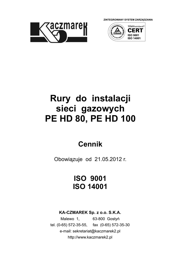 ZINTEGROWANY SYSTEM ZARZ¥DZANIA Rury do instalacji sieci gazowych PE HD 80, PE HD 100 Cennik Obowi¹zuje od 21.05.2012 r. ISO 9001 ISO 14001 KA-CZMAREK Sp. z o.o. S.K.A. Malewo 1, tel. (0-65) 572-35-55, 63-800 Gostyñ fax (0-65) 572-35-30 e-mail: [email protected] http://www.kaczmarek2.pl RURY PE HD 80 DO ROZPROWADZANIA PALIW GAZOWYCH Normy, aprobaty techniczne: PN-EN 1555 Nazwa artyku³u Wymiar Indeks J.M. [mm] ¯ó³te Rury PE HD 80 do rozprowadzania paliw gazowych Szereg SDR - 17,6 ¯ó³te Rury PE HD 80 do rozprowadzania paliw gazowych Szereg SDR - 11 [PLN] Iloœæ w op. mb. szt. w krêgu /pal. 75 x 4,3 90 x 5,2 110 x 6,3 125 x 7,1 140 x 8,0 160 x 9,1 180 x 10,3 200 x 11,4 225 x 12,8 250 x 14,2 280 x 15,9 315 x 17,9 355 x 20,2 400 x 22,8 450 x 25,6 500 x 28,4 3511615760 3511815540 3512015540 3512115540 3512215540 3512315540 3512415540 3512515540 3512615540 3512715540 3512815540 3512915540 3513015540 3513115540 3513215540 3513315540 mb. mb. mb. mb. mb. mb. mb. mb. mb. mb. mb. mb. mb. mb. mb. mb. 12,07 17,52 25,96 33,26 41,96 54,56 69,45 85,43 107,92 133,05 167,84 218,99 278,50 354,15 447,40 551,53 100 50 25 x 3,0 32 x 3,0 40 x 3,7 50 x 4,6 63 x 5,8 75 x 6,8 90 x 8,2 110 x 10,0 125 x 11,4 140 x 12,7 160 x 14,6 180 x 16,4 200 x 18,2 225 x 20,5 250 x 22,7 280 x 25,4 315 x 28,6 355 x 32,3 400 x 36,3 450 x 40,9 500 x 45,5 3511155800 3511255800 3511355780 3511455760 3511555760 3511655760 3511855540 3512055540 3512155540 3512255540 3512355540 3512455540 3512555540 3512655540 3512755540 3512855540 3512955540 3513055540 3513155540 3513255540 3513355540 mb. mb. mb. mb. mb. mb. mb. mb. mb. mb. mb. mb. mb. mb. mb. mb. mb. mb. mb. mb. mb. 2,72 3,59 5,53 8,60 13,66 18,42 26,65 39,73 51,46 64,24 84,35 106,61 131,47 166,58 205,02 256,95 337,31 429,22 545,01 689,03 851,58 200 200 150 100 100 100 50 50 Œrednice Œrednice Œrednice Data: 21.05.2012 r. Cena 25 90 125 - 53 48 43 38 20 17 14 14 11 4 3 3 3 2 2 53 48 43 20 20 17 14 14 4 4 3 3 3 2 2 75 - krêgi 110 - krêgi lub odcinki 12 mb. 500 - odcinki 12 mb. Obowi¹zuje cena w dniu odbioru towaru Podatek VAT - 23 % RURY PE HD 100 DO ROZPROWADZANIA PALIW GAZOWYCH Normy, aprobaty techniczne: PN-EN 1555 Nazwa artyku³u Wymiar Indeks J.M. [mm] Szereg SDR - 17,6 Pomarañczowe Rury PE HD 100 do rozprowadzania paliw gazowych Szereg SDR - 11 Pomarañczowe Rury PE HD 100 do rozprowadzania paliw gazowych [PLN] Iloœæ w op. mb. szt. w krêgu /pal. 75 x 4,3 90 x 5,2 110 x 6,3 125 x 7,1 140 x 8,0 160 x 9,1 180 x 10,3 200 x 11,4 225 x 12,8 250 x 14,2 280 x 15,9 315 x 17,9 355 x 20,2 400 x 22,8 450 x 25,6 500 x 28,4 3521615760 3521815540 3522015540 3522115540 3522215540 3522315540 3522415540 3522515540 3522615540 3522715540 3522815540 3522915540 3523015540 3523115540 3523215540 3523315540 mb. mb. mb. mb. mb. mb. mb. mb. mb. mb. mb. mb. mb. mb. mb. mb. 14,34 20,80 30,81 39,48 49,81 64,77 82,44 101,40 127,11 157,92 199,22 250,82 318,97 405,62 512,42 631,69 100 50 25 x 3,0 32 x 3,0 40 x 3,7 50 x 4,6 63 x 5,8 75 x 6,8 90 x 8,2 110 x 10,0 125 x 11,4 140 x 12,7 160 x 14,6 180 x 16,4 200 x 18,2 225 x 20,5 250 x 22,7 280 x 25,4 315 x 28,6 355 x 32,3 400 x 36,3 450 x 40,9 500 x 45,5 3521155800 3521255800 3521355780 3521455760 3521555760 3521655760 3521855540 3522055540 3522155540 3522255540 3522355540 3522455540 3522555540 3522655540 3522755540 3522855540 3522955540 3523055540 3523155540 3523255540 3523355540 mb. mb. mb. mb. mb. mb. mb. mb. mb. mb. mb. mb. mb. mb. mb. mb. mb. mb. mb. mb. mb. 3,23 4,26 6,66 10,21 16,21 22,67 32,79 47,16 61,07 76,25 100,13 126,54 156,05 197,73 243,36 305,00 386,33 491,61 624,22 789,16 976,34 200 200 150 100 100 100 50 50 Œrednice Œrednice Œrednice Data: 21.05.2012 r. Cena 25 90 125 - 53 48 43 38 20 17 14 14 11 4 3 3 3 2 2 53 48 43 38 20 17 14 14 4 4 3 3 3 2 2 75 - krêgi 110 - krêgi lub odcinki 12 mb. 500 - odcinki 12 mb. Obowi¹zuje cena w dniu odbioru towaru Podatek VAT - 23 % RURY WARSTWOWE PE / PE TYTAN DO ROZPROWADZANIA PALIW GAZOWYCH Normy, aprobaty techniczne: PN-EN 1555 Nazwa artyku³u Wymiar Indeks J.M. [mm] Szereg SDR - 17,6 Pomarañczowe Rury PE HD 100 z PE 100-RC do rozprowadzania paliw gazowych Szereg SDR - 11 Pomarañczowe Rury PE HD 100 z PE 100-RC do rozprowadzania paliw gazowych [PLN] Iloœæ w op. mb. szt. w krêgu /pal. 75 x 4,3 90 x 5,2 110 x 6,3 125 x 7,1 140 x 8,0 160 x 9,1 180 x 10,3 200 x 11,4 225 x 12,8 250 x 14,2 280 x 15,9 315 x 17,9 355 x 20,2 400 x 22,8 450 x 25,6 500 x 28,4 4121615760 4121815540 4122015540 4122115540 4122215540 4122315540 4122415540 4122515540 4122615540 4122715540 4122815540 4122915540 4123015540 4123115540 4123215540 4123315540 mb. mb. mb. mb. mb. mb. mb. mb. mb. mb. mb. mb. mb. mb. mb. mb. 16,35 20,79 31,05 39,60 49,76 65,06 82,44 101,87 129,04 158,41 198,98 252,16 320,62 431,36 546,67 675,63 100 50 25 x 3,0 32 x 3,0 40 x 3,7 50 x 4,6 63 x 5,8 75 x 6,8 90 x 8,2 110 x 10,0 125 x 11,4 140 x 12,7 160 x 14,6 180 x 16,4 200 x 18,2 225 x 20,5 250 x 22,7 280 x 25,4 315 x 28,6 355 x 32,3 400 x 36,3 450 x 40,9 500 x 45,5 4121155800 4121255800 4121355780 4121455760 4121555760 4121655760 4121855540 4122055540 4122155540 4122255540 4122355540 4122455540 4122555540 4122655540 4122755540 4122855540 4122955540 4123055540 4123155540 4123255540 4123355540 mb. mb. mb. mb. mb. mb. mb. mb. mb. mb. mb. mb. mb. mb. mb. mb. mb. mb. mb. mb. mb. 3,36 4,41 6,78 10,89 16,70 24,66 33,05 47,13 61,02 76,18 100,03 126,42 155,92 197,55 243,14 304,73 385,98 489,80 638,58 809,32 998,29 200 200 150 100 100 100 50 50 Œrednice Œrednice Œrednice Œrednice Data: 21.05.2012 r. Cena 53 48 43 38 20 17 14 14 11 4 3 3 3 2 2 53 48 43 38 20 17 14 14 4 4 3 3 3 2 2 32 - 75 500 - jednowarstwowe 32 75 - krêgi 90 110 - krêgi lub odcinki 12 mb. 125 - 500 - odcinki 12 mb. Obowi¹zuje cena w dniu odbioru towaru Podatek VAT - 23 %