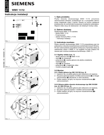 20 800 461.0-010 WLV 11/12 PL s WMV 11/12 Instrukcja instalacji 1. Opis produktu Plytka obwodu drukowanego WMV 11/12 umozliwia zachowywanie obrazów, przesylanych np. w przypadku alarmu przez magistrale video z kamer. Obrazy te mozna nastepnie przekazywac do centrali alarmowej przez urzadzenie wybierajace. Wyjscie video sluzy do testowania i do lokalnych funkcji video. 2. Zakres dostawy Opakowanie WMV 11/12 zawiera: - plytke WMV 11/12 - 6 zamocowan - zestaw foniczny WLV z 11/12 - instrukcja instalacji Rys. 1 3. Instrukcja montazu 8AA10892 - E0 - 10/05/2001 - PL - Q W Plytka obwodu drukowanego WMV 11/12 przewidziana jest do polaczenia z wtyczka rozszerzeniowa centrali alarmowych Sintony. W celu wykorzystania wszystkich funkcji przy transmisji nalezy ja zastosowac razem z WMA 11. Ze wzgledu na brak miejsca nie zawsze jest mozliwa dodatkowa kombinacja z SMV 11. 3.1 Ogólny widok (rys. 1) - dioda robocza LED T WMV 11/12 - wtyk Q do rozszerzen - polaczenie Y z plytka glówna lub plytka urzadzenia wybierajacego - wtyk W do monitora - polaczenie E z magistrala video - mostek programujacy R E Rys. 2 3.2 Montaz Q W 3.2.2 Glówna plytka obwodu drukowanego typ SM 210/220 (rys. 3) i SM 410 (rys. 4) 1 - Upewnic sie, ze plytka glówna jest odlaczona od napiecia. 2 - Na plytce glównej osadzic 4 krótkie zamocowania W. 3 - Plytke osadzic od góry na wtyczce rozszerzeniowej Q i zamocowaniach. W Rys. 3 Q W W Rys. 4 3.2.1 Plytka glówna typ SM 110/120 (rys. 2) 1 - Upewnic sie, ze plytka glówna jest odlaczona od napiecia. 2 - Na plytce glównej osadzic 2 krótkie zamocowania E a 2 dlugie zamocowania W zatrzasnac w dnie obudowy. 3 - Plytke osadzic od góry na wtyczce rozszerzeniowej Q i zamocowaniach. 4. Okablowanie WMV 61 SW1 SW2 4.1 W polaczeniu z WMV 61 (rys. 5) Okablowanie pokazane jest na rys. 5. WMV 61 podlaczone byc musi przed kamerami, tak by na monitorze ukazywaly sie wszystkie obrazy. Ilosc WAT 21 lub WAC 31/32/33 jest zalezna od centrali. 4.2 Bez WMV 61 (rys. 6) + NC NC - Vin +- Vin - - Vout T Okablowanie pokazane jest na rys. 6. Ilosc WAT 21 lub WAC 31/ 32/33 jest zalezna od centrali. T WAT 21 WAC 31/32/33 Vout Vout Vin+ Vin+ Vin+ Vin- WMV 11/12 WAT 21 WAC 31/32/33 5. Ustawienia Dlugosc magistrali video. Magistrala video Mostek < 200 m otwarty > 200 m zamkniety 6. Uruchomienie Vout Vout Vin+ Vin+ Centrale podlaczyc do pradu, na czas jednej sekundy zaswiecic sie musi zielona LED (T rys. 1) na WMV 11/12. Jesli dioda nie swieci sie, sprawdzic polaczenie z plytka glówna. Dioda ta musi sie swiecic równiez podczas odbierania obrazów z kamer. do WAT 21 WAC 31/32/33 Rys. 5 7. Dane techniczne WAT 21 WAC 31/32/33 Vout Vout Vin+ Vin+ Vin+ Vin- WMV 11/12 WAT 21 WAC 31/32/33 Vout Vout Vin+ Vin+ do WAT 21 WAC 31/32/33 Rys. 6 Zastrzega się zmiany techniczne opisanych urządzeń, także bez uprzedniej zapowiedzi. zasilanie pobór pradu w spoczynku pobór pradu podczas pracy temperatura robocza wymiary w mm ciezar przez plytke glówna 8 mA 160 mA -10șC do +40șC wys. 118 x dlug. 130 x gleb. 20 120 g