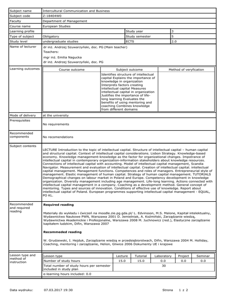 Subject name Intercultural Communication and Business Subject code Z:18404W0 Faculty Department of Management Course name European Studies Learning profile Study year 3 Type of subject Obligatory Study semester 5 Study level undergraduate studies ECTS 2.0 Name of lecturer dr inż. Andrzej Szuwarzyński, doc. PG (Main teacher) Teachers: mgr inż. Emilia Nagucka dr inż. Andrzej Szuwarzyński, doc. PG Learning outcomes Course outcome Subject outcome Method of veryfication Identifies structure of intellectual capital Explains the importance of knowledge in organization Interprets factors creating intellectual capital Measures intellectual capital in organization Justifies the importance of lifelong learning Evaluates the benefits of using mentoring and coaching Combines knowledge from different domains Mode of delivery at the university Prerequisites No requirements Recommended components No recomendations Subject contents LECTURE Introduction to the topic of intellectual capital. Structure of intellectual capital – human capital and structural capital. Context of intellectual capital considerations. Lisbon Strategy. Knowledge-based economy. Knowledge management-knowledge as the factor for organizational changes. Impotrance of intellectual capital in contemporary organization-information stakeholders about knowledge resources. Connections of intellectual capital with accounting. Model of intellectual capital management, Scandia Navigator. Measurement and evaluation of intellectual capital. Creation of intellectual capital. intellectual capital management. Management functions. Competences and roles of managers. Entrepreneurial style of management. Elastic management of human capital. Strategy of human capital management. TUTORIALS Demographical changes on labour market in Poland and Europe. Competency development in knowledge organization. Diversity management including age management. Life-long learning. Actions connected with intellectual capital management in a company. Coaching as a development method. General concept of mentoring. Types and sources of innovation. Conditions of effective use of knowledge. Report about intellectual capital of Poland. European programmes supporting intellectual capital management - EQUAL, PO KL. Recommended and required reading Required reading Materiały do wykładu i ćwiczeń na moodle.zie.pg.gda.pl/ L. Edvinsson, M.S. Malone, Kapitał intelektualny, Wydawnictwo Naukowe PWN, Warszawa 2001 D. Jemielniak, A. Koźmiński, Zarządzanie wiedzą, Wydawnictwa Akademickie i Profesjonalne, Warszawa 2008 M. Juchnowicz (red.), Elastyczne zarządzanie kapitałem ludzkim, Difin, Warszawa 2007 Recommeded reading W. Grudzewski, I. Hejduk, Zarządzanie wiedzą w przedsiębiorstwach, Difin, Warszawa 2004 M. Holliday, Coaching, mentoring i zarządzanie, Helion, Gliwice 2006 Dokumenty UE i krajowe Lesson type and method of instruction Lesson type Number of study hours Total number of study hours per semester included in study plan Lecture Tutorial Laboratory Project Seminar 15.0 15.0 0.0 0.0 0.0 30 e-learning hours included: 0.0 Data wydruku: 07.03.2017 19:30 Strona 1 z 2 Assesment methods and criteria Subject passing criteria Passing threshold Percentage of the final grade Written exam 50.0 70.0 Practical exercise 50.0 30.0 Example issues / example questions / tasks being completed Language of instructions Polish Work placement Not applicable Data wydruku: 07.03.2017 19:30 Strona 2 z 2