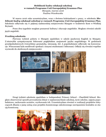Mobilność kadry edukacji szkolnej w ramach Programu Unii Europejskiej Erasmus Plus Margate, marzec 2016 Paulina Wesołowska W marcu 2016 roku uczestniczyłam, wraz z dwiema koleżankami z pracy, w szkoleniu Mobilność kadry edukacji szkolnej w ramach Programu Unii Europejskiej Erasmus Plus. Szkolenie odbywało się w pięknej nadmorskiej miejscowości Margate w hrabstwie Kent w Wielkiej Brytanii. Przez dwa tygodnie mogłam poznawać kulturę i obyczaje angielskie. Mogłam również szkolić język angielski. Przebieg szkolenia Pierwszy tydzień pobytu w Margate spędziłam w szkole językowej English in Margate. Z niezwykle sympatycznymi lektorami pogłębiałam znajomość języka angielskiego. W godzinach przedpołudniowych ćwiczyliśmy gramatykę, intonację, itd. A popołudniami odbywały się konwersacje. Wieczorami była możliwość spotkań z innymi studentami i lektorami. Odbyły się również wspólne wycieczki do okolicznych miejscowości. Drugi tydzień szkolenia spędziłam w Independent Primary School - Chartfield School. Mogłam obserwować sposób prowadzenia lekcji w najstarszej klasie szkolnej, życie szkolne, zajęcia popołudniowe, zachowanie uczniów, wychowanie ich. Uczestniczyłam również w realizacji projektów dotyczących dbania o jamę ustną oraz projektu kosmicznego zakończonego nawiązaniem kontaktu ze stacją kosmiczną. Przydatność osobista szkolenia i zawodowa W czasie szkolenia rozwijałam swoje umiejętności językowe. Poznawałam miejsca związane z historią Wielkiej Brytanii z przestrzeni kilku wieków. Byłam i zwiedziłam Dover Castle. Z wielkim zainteresowaniem obejrzałam Fire Command Post and Port War Signal Station in Dover. Największe wrażenie zrobiły na mnie Secret War Time Tunnels. Chętnie również zwiedziłam RAF Manston Spitfire & Hurricane Memorial Museum. I jestem pod ogromnym wrażeniem tych miejsc. Oczywiście zwiedzając okoliczne miejsca, Cantebury, Ramsgate i inne przyglądałam się architekturze angielskiej. W czasie pobytu w szkole obserwowałam inne metody pracy. Specyfika tych metod wynikała z charakteru szkoły. Uczęszcza do niej 35 uczniów od 5 do 11 roku życia. W klasie, której pracę widziałam, było 10 uczniów. Nie wszystkie ćwiczenia i formy da się przenieść do polskiej szkoły, w której liczebność klas jest zazwyczaj powyżej 20 osób. Co chciałabym przenieść na grunt naszej placówki? Olbrzymie wrażenie wywarło na mnie grzeczność i posłuszeństwo uczniów. Ich karność – uprzejmość jest zapewne wynikiem wieloletniej pracy i stabilności systemu oświaty. To jest jedna z ważniejszych spraw, którą chciałabym zastosować w naszej szkole. Porządek, ład, pomoc młodszym dzieciom – bez względu, czy ktoś jest wolontariuszem, czy nie, czy powie się jemu, czy nie. W małej grupie (10 osób) łatwiej pracować indywidualnie. W dużej grupie trzeba tego się uczyć. W angielskiej szkole, mimo różnych zadań podejmowanych przez uczniów, nie zauważyłam niezdrowego współzawodnictwa, zazdrości. To również warto wprowadzać u nas. Plany i działania w szkole po odbyciu mobilności Codziennie. W każdej chwili przypominać dzieciom i rodzicom o kulturze, takcie, odpowiednim do sytuacji zachowaniu. Wprowadzam różnorodne karty pracy, które pomagają indywidualizować pracę z uczniem. Opowiadam o historii Anglii więcej i łączę ją z naszą. Podsumowanie Jestem bardzo zadowolona z wyjazdu. Obawiałam się jego ze względu na język i duży opór w mówieniu po angielsku. Okazało się, że strach ma wielkie oczy. A mieszkanie w domu Angielki pokazało, jak różnią się nasze narody, które wzrastały w różnych warunkach historycznych i kulturowych – było to niezwykle ciekawe doświadczenie. Margate jest miejscowością, do której zjeżdżali się malarze z odległych rejonów, aby malować zachód słońca. Dzisiaj codziennie na plaży pojawiają się mieszkańcy i przyjezdni z aparatami fotograficznymi, aby zachować nie tylko w pamięci piękno angielskiego wybrzeża uchwycone o zachodzie słońca. Paulina Wesołowska