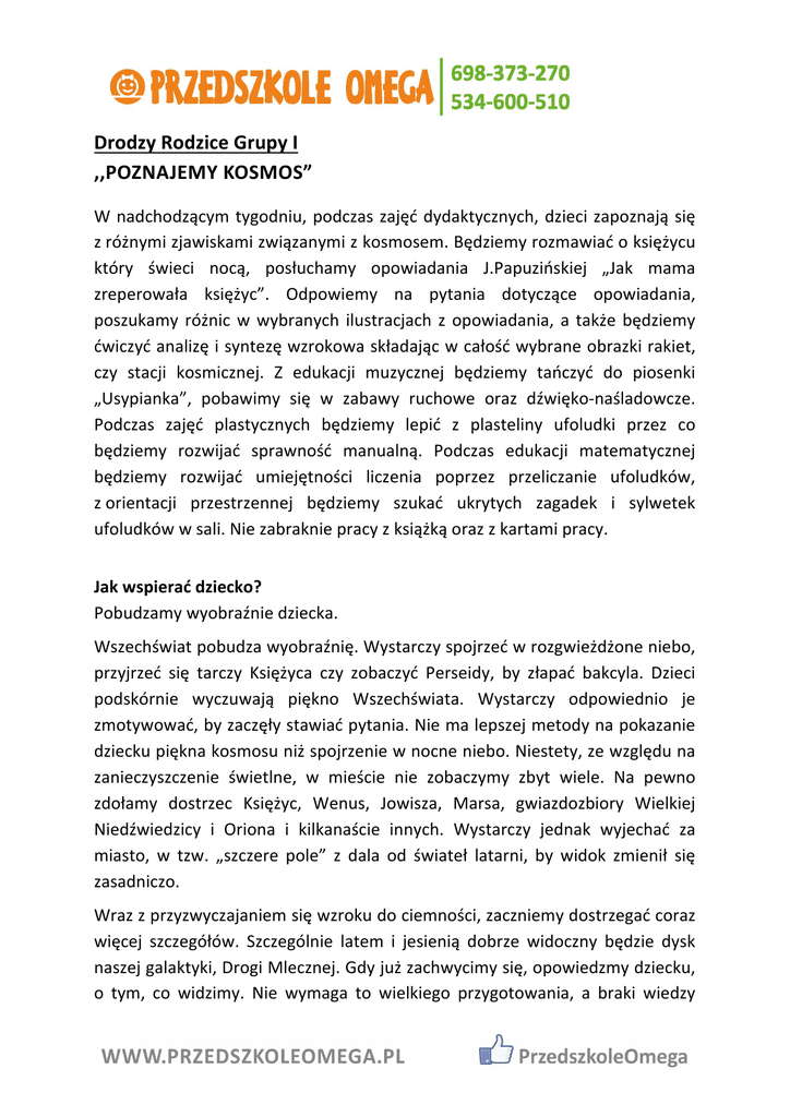 DrodzyRodziceGrupyI ,,POZNAJEMYKOSMOS” Wnadchodzącymtygodniu,podczaszajęćdydaktycznych,dziecizapoznająsię zróżnymizjawiskamizwiązanymizkosmosem.Będziemyrozmawiaćoksiężycu który świeci nocą, posłuchamy opowiadania J.Papuzińskiej „Jak mama zreperowała księżyc”. Odpowiemy na pytania dotyczące opowiadania, poszukamy różnic w wybranych ilustracjach z opowiadania, a także będziemy ćwiczyćanalizęisyntezęwzrokowaskładającwcałośćwybraneobrazkirakiet, czy stacji kosmicznej. Z edukacji muzycznej będziemy tańczyć do piosenki „Usypianka”, pobawimy się w zabawy ruchowe oraz dźwięko-naśladowcze. Podczas zajęć plastycznych będziemy lepić z plasteliny ufoludki przez co będziemy rozwijać sprawność manualną. Podczas edukacji matematycznej będziemy rozwijać umiejętności liczenia poprzez przeliczanie ufoludków, zorientacji przestrzennej będziemy szukać ukrytych zagadek i sylwetek ufoludkówwsali.Niezabrakniepracyzksiążkąorazzkartamipracy. Jakwspieraćdziecko? Pobudzamywyobraźniedziecka. Wszechświatpobudzawyobraźnię.Wystarczyspojrzećwrozgwieżdżoneniebo, przyjrzeć się tarczy Księżyca czy zobaczyć Perseidy, by złapać bakcyla. Dzieci podskórnie wyczuwają piękno Wszechświata. Wystarczy odpowiednio je zmotywować,byzaczęłystawiaćpytania.Niemalepszejmetodynapokazanie dzieckupięknakosmosuniżspojrzeniewnocneniebo.Niestety,zewzględuna zanieczyszczenie świetlne, w mieście nie zobaczymy zbyt wiele. Na pewno zdołamy dostrzec Księżyc, Wenus, Jowisza, Marsa, gwiazdozbiory Wielkiej Niedźwiedzicy i Oriona i kilkanaście innych. Wystarczy jednak wyjechać za miasto, w tzw. „szczere pole” z dala od świateł latarni, by widok zmienił się zasadniczo. Wrazzprzyzwyczajaniemsięwzrokudociemności,zaczniemydostrzegaćcoraz więcej szczegółów. Szczególnie latem i jesienią dobrze widoczny będzie dysk naszejgalaktyki,DrogiMlecznej.Gdyjużzachwycimysię,opowiedzmydziecku, o tym, co widzimy. Nie wymaga to wielkiego przygotowania, a braki wiedzy uzupełnijedenzniezliczonychatlasówniebaistronyinternetowepoświęcone astronomii. Dodatkowo14lutegozostanąprzeprowadzonezajęciatematyczne“Walentynki” Zpozdrowieniami, wychowawcagrupySylwiaDąbrowska. DrodzyRodziceGrupyII „CZYJESTEŚMYSAMIWKOSMOSIE” W ubiegłym tygodniu rozmawialiśmy o upływającym czasie. Uczyliśmy się dostrzegaćcyklicznościdniainocy. Wnadchodzącymtygodniubędziemynatomiastrozmawiaćokosmosie.Kosmos jestdladziecijednymznajbardziejfascynującychtematów.Dziecidowiedząsię różnychciekawostekowszechświecie,układziesłonecznymiastronomii.Będą miałyokazjepoznaćobiektytakiejakplanety,gwiazdy,komety,galaktyki,atakże dowiedzieć się nieco o podróżach kosmicznych, astronautach, rakietach czy ufoludkach. Podczas edukacji matematycznej będziemy utrwalali przeliczanie przedmiotów, będziemy dokonywać klasyfikacji przedmiotów ze względu na różne właściwości. Podczas edukacji językowej będziemy ćwiczyli dzielenie wyrazów na sylaby. Będziemy również rozwijać mowę podczas swobodnych wypowiedzi,sprawnośćmanualną,fizycznąorazgrafomotoryczną. W tym tygodniu będziemy również obchodzić Walentynki. Dzień Świętego Walentego obchodzony jest na całym świecie jako święto miłości. Tego dnia dzieciwezmąudziałwróżnychzabawachzwiązanychzwalentynkami. Ważnewydarzeniawnadchodzącymtygodniu: • 14 luty – Walentynki (Bardzo proszę, aby dzieci w tym dniu przyszły ubranenaczerwono.) • 17luty-DzieńKota Jakwspieraćdziecko: O kosmosie wiemy zazwyczaj niewiele, bo wydaje się być on czymś odległym itajemniczym.Dlategojesttoświetnaokazjadotego,byzgłębićniecokosmiczne tajemnice i dowiedzieć się co nieco o przestrzeni kosmicznej, planetach iwysiłkach człowieka, by kosmos lepiej poznać. Warto zarazić dziecko zachwytemnadpięknemkosmosu.Wszechświatpobudzawyobraźnię.Niema lepszej metody na pokazanie dziecku piękna kosmosu niż spojrzenie w nocne niebo. Wartopoczytaćdzieciom: „Cudownyświatkosmosu”-opracowaniezbiorowe G.Kasdepke„BodzioiPulpet” „Zieloneufoludki” Mójbratwciążczytaokosmitach, Gwiazdach,planetachiorbitach. Oniczyminnymniechcesłyszeć, NawetdoUFOlistypisze. Wreszciezasłużyłnanagrodę Ilatającyujrzałspodek, Bowylądowałdziśwogródku Pojazdzielonychufoludków. Zielonewłosy,zielonebutki, Całezielonesąufoludki. Zielonewłosy,zielonebutki, Całezielonesąufoludki. Kotnaichwidokzarazzmyka, Dziwnegoboisięludzika. Pierwszykotprzykryłnosogonem, Możetogryzietozielone. Aczymsiężywiśmiesznytworek? Czyzjedząznamipodwieczorek? Kompotdostały,tortdostały, Zjadły,wypiły,odleciały. Zielonewłosy,zielonebutki, Całezielonesąufoludki. Zielonewłosy,zielonebutki… Zielonewłosy,zielonebutki, Całezielonesąufoludki. Zielonewłosy,zielonebutki, Całezielonesąufoludki. Zpozdrowieniami, wychowawcagrupyMagdaPrzepiórka. DrodzyRodziceGrupyIV W minionym tygodniu rozmawialiśmy na temat szeroko pojętego „czasu”. Przedszkolakipoznałypracęzegarmistrza.Dowiedziałysięróżnychciekawostek o dawnych i obecnych czasomierzach np. zegar słoneczny, klepsydra. Podejmowały próby zrozumienia następujących pojęć: przeszłość, teraźniejszość,przyszłość.Poznałyiutrwalałynazwywszystkichmiesięcy. W przyszłym tygodniu będziemy rozmawiali na temat kosmosu. Przedszkolaki poznają takie pojęcia jak: kosmos, planety, UFO, rakieta, wahadłowiec, droga mleczna.PoznająwyglądUkładuSłonecznegoorazdowiedząsięjakietworzągo planety.PoznająwieleciekawosteknatematZiemi. Podczasedukacjimatematycznejbędziemyutrwalaliprzeliczanieprzedmiotów w zakresie 10, utrwalali właściwe używanie znaków mniejszości, większości irówności,tworzyliczęśćwspólnązbiorów,klasyfikowaliprzedmiotyzewzględu na różne właściwości (wielkość, kształt, kolor, przeznaczenie), ćwiczyli przeliczanie przy użyciu liczebników głównych (jeden, dwa, trzy…) iporządkowych(pierwszy,drugi,trzeciit