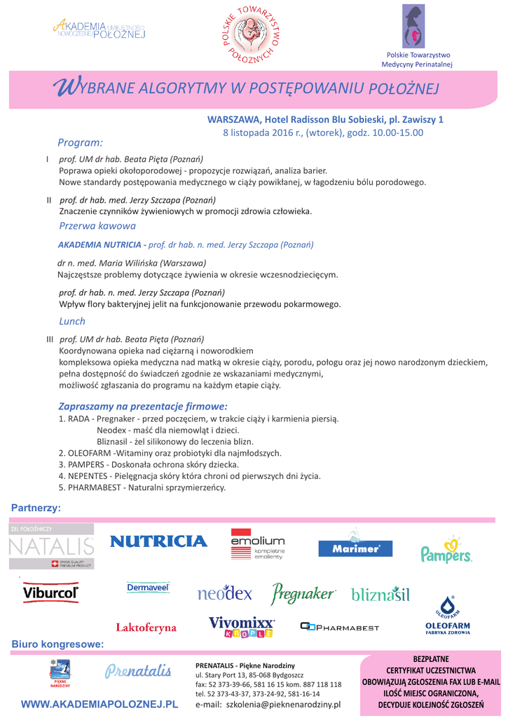 Polskie Towarzystwo Medycyny Perinatalnej WYBRANE ALGORYTMY W POSTĘPOWANIU POŁOŻNEJ Program: I WARSZAWA, Hotel Radisson Blu Sobieski, pl. Zawiszy 1 8 listopada 2016 r., (wtorek), godz. 10.00-15.00 prof. UM dr hab. Beata Pięta (Poznań) Poprawa opieki okołoporodowej - propozycje rozwiązań, analiza barier. Nowe standardy postępowania medycznego w ciąży powikłanej, w łagodzeniu bólu porodowego. II prof. dr hab. med. Jerzy Szczapa (Poznań) Znaczenie czynników żywieniowych w promocji zdrowia człowieka. Przerwa kawowa AKADEMIA NUTRICIA - prof. dr hab. n. med. Jerzy Szczapa (Poznań) dr n. med. Maria Wilińska (Warszawa) Najczęstsze problemy dotyczące żywienia w okresie wczesnodziecięcym. prof. dr hab. n. med. Jerzy Szczapa (Poznań) Wpływ flory bakteryjnej jelit na funkcjonowanie przewodu pokarmowego. Lunch III prof. UM dr hab. Beata Pięta (Poznań) Koordynowana opieka nad ciężarną i noworodkiem kompleksowa opieka medyczna nad matką w okresie ciąży, porodu, połogu oraz jej nowo narodzonym dzieckiem, pełna dostępność do świadczeń zgodnie ze wskazaniami medycznymi, możliwość zgłaszania do programu na każdym etapie ciąży. Zapraszamy na prezentacje firmowe: 1. RADA - Pregnaker - przed poczęciem, w trakcie ciąży i karmienia piersią. Neodex - maść dla niemowląt i dzieci. Bliznasil - żel silikonowy do leczenia blizn. 2. OLEOFARM -Witaminy oraz probiotyki dla najmłodszych. 3. PAMPERS - Doskonała ochrona skóry dziecka. 4. NEPENTES - Pielęgnacja skóry która chroni od pierwszych dni życia. 5. PHARMABEST - Naturalni sprzymierzeńcy. Partnerzy: . Biuro kongresowe: PRENATALIS - Piękne Narodziny ul. Stary Port 13, 85-068 Bydgoszcz fax: 52 373-39-66, 581 16 15 kom. 887 118 118 tel. 52 373-43-37, 373-24-92, 581-16-14 WWW.AKADEMIAPOLOZNEJ.PL e-mail: [email protected] BEZPŁATNE CERTYFIKAT UCZESTNICTWA OBOWIĄZUJĄ ZGŁOSZENIA FAX LUB E-MAIL ILOŚĆ MIEJSC OGRANICZONA, DECYDUJE KOLEJNOŚĆ ZGŁOSZEŃ