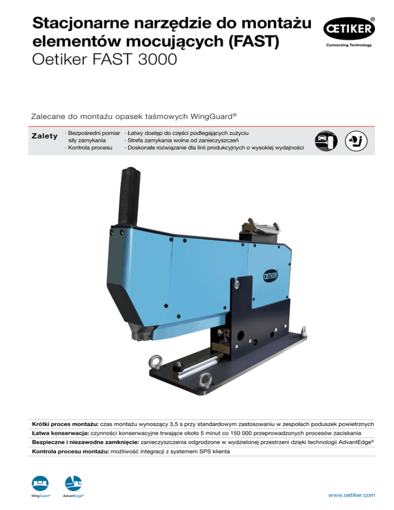 Stacjonarne narzędzie do montażu elementów mocujących (FAST) Oetiker FAST 3000 Zalecane do montażu opasek taśmowych WingGuard ® Zalety ·B ezpośredni pomiar · Łatwy dostęp do części podlegających zużyciu · Strefa zamykania wolna od zanieczyszczeń siły zamykania · Doskonałe rozwiązanie dla linii produkcyjnych o wysokiej wydajności · Kontrola procesu Krótki proces montażu: czas montażu wynoszący 3,5 s przy standardowym zastosowaniu w zespołach poduszek powietrznych Łatwa konserwacja: czynności konserwacyjne trwające około 5 minut co 150 000 przeprowadzonych procesów zaciskania Bezpieczne i niezawodne zamknięcie: zanieczyszczenia odgrodzone w wydzielonej przestrzeni dzięki technologii AdvantEdge® Kontrola procesu montażu: możliwość integracji z systemem SPS klienta www.oetiker.com Stacjonarne narzędzie do montażu elementów mocujących – Oetiker FAST 3000 ZAKRES DOSTAWY Kabel łączący ·O budowa elementów aparatury elektrycznej · Panel sterowania oburęcznego · Narzędzie montażowe · Kabel łączący Akcesoria opcjonalne: · Panel dotykowy · Jednostka weryfikująca siłę zamykania · Pedał nożny Obudowa elementów aparatury elektrycznej Narzędzie montażowe Jednostka weryfikująca siłę zamykania Pedał nożny Panel sterowania oburęcznego PRZEGLĄD DANYCH TECHNICZNYCH* Panel dotykowy OPIS Stosowana siła zamykania (SK)** - Maks. - Zalecana - Tolerancja (SK-T) 2000 N 1850 N ± 100 N Szczelina przy zamknięciu szczypiec zaciskowych (SS) - Tolerancja (SS-T) 3 mm ± 0,15 mm Szczelina otwarcia szczypiec zaciskowych (OS) - Tolerancja (OS-T) Stacjonarne, elektromechaniczne narzędzie montażowe Oetiker FAST 3000 przeznaczone jest do zaciskania opasek taśmowych Oetiker WingGuard® 270. Jego stosowanie gwarantuje równomierną siłę zamykania. Urządzenie stosuje stałą, powtarzalną i odpowiednio dostosowaną siłę rozciągającą, dzięki czemu poszczególne komponenty, zaciskany element oraz sama opaska nie są nadmiernie obciążane. 10,5 mm ± 0,15 mm Metody zaciskuMetoda zamykania „Siła przed rozciągnięciem i skok przed zamknięciem” Przybliżone wymiary (mm) Przybliżona masa (kg) Obudowa elementów aparatury elektrycznej 650 x 585 x 355 39,5 Kabel łączący 2500 Narzędzie montażowe 650 x 50 x 180 Mechanizm zamykający z technologią AdvantEdge® zapewnia ochronę zaciskanego elementu przed uszkodzeniem i nie pozostawia zanieczyszczeń. Narzędzie to pozwala na pełne monitorowanie procesu i rejestrację wszystkich danych. Tym samym stanowi ono doskonałe rozwiązanie dla podzespołów systemów bezpieczeństwa takich jak zespół poduszki powietrznej. 2,5 30,0 08903490 * Dane orientacyjne. Te dane są przedstawione wyłącznie w celach referencyjnych. Prawa do wprowadzania zmian technicznych zastrzeżone. ** Średnia siła zamykania stosowana wobec elementów o wymiarach nominalnych nie powinna przekraczać podanej wartości. 2