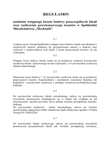REGULAMIN ustalania wstępnego kosztu budowy poszczególnych