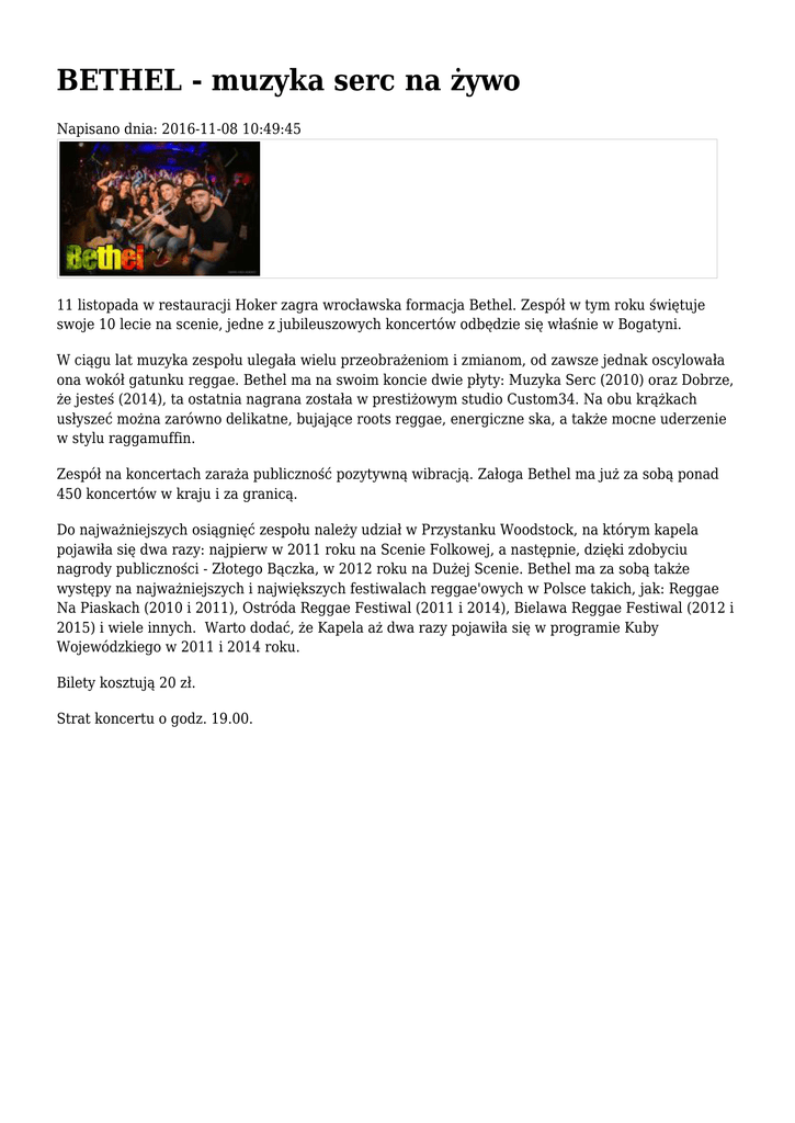 BETHEL - muzyka serc na żywo Napisano dnia: 2016-11-08 10:49:45 11 listopada w restauracji Hoker zagra wrocławska formacja Bethel. Zespół w tym roku świętuje swoje 10 lecie na scenie, jedne z jubileuszowych koncertów odbędzie się właśnie w Bogatyni. W ciągu lat muzyka zespołu ulegała wielu przeobrażeniom i zmianom, od zawsze jednak oscylowała ona wokół gatunku reggae. Bethel ma na swoim koncie dwie płyty: Muzyka Serc (2010) oraz Dobrze, że jesteś (2014), ta ostatnia nagrana została w prestiżowym studio Custom34. Na obu krążkach usłyszeć można zarówno delikatne, bujające roots reggae, energiczne ska, a także mocne uderzenie w stylu raggamuffin. Zespół na koncertach zaraża publiczność pozytywną wibracją. Załoga Bethel ma już za sobą ponad 450 koncertów w kraju i za granicą. Do najważniejszych osiągnięć zespołu należy udział w Przystanku Woodstock, na którym kapela pojawiła się dwa razy: najpierw w 2011 roku na Scenie Folkowej, a następnie, dzięki zdobyciu nagrody publiczności - Złotego Bączka, w 2012 roku na Dużej Scenie. Bethel ma za sobą także występy na najważniejszych i największych festiwalach reggae'owych w Polsce takich, jak: Reggae Na Piaskach (2010 i 2011), Ostróda Reggae Festiwal (2011 i 2014), Bielawa Reggae Festiwal (2012 i 2015) i wiele innych. Warto dodać, że Kapela aż dwa razy pojawiła się w programie Kuby Wojewódzkiego w 2011 i 2014 roku. Bilety kosztują 20 zł. Strat koncertu o godz. 19.00.