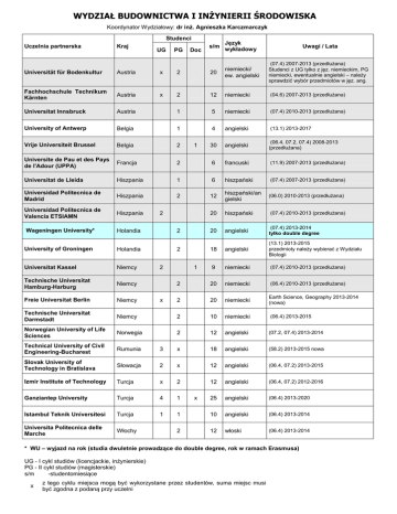 WYDZIAŁ BUDOWNICTWA I INŻYNIERII ŚRODOWISKA Koordynator Wydziałowy: dr inż. Agnieszka Karczmarczyk Studenci Uczelnia partnerska Kraj UG PG Doc s/m Język wykładowy Uwagi / Lata (07.4) 2007-2013 (przedłużana) Studenci z UG tylko z jęz. niemieckim, PG niemiecki, ewentualnie angielski – należy sprawdzić wybór przedmiotów w jęz. ang. Universität für Bodenkultur Austria x 2 20 niemiecki/ ew. angielski Fachhochschule Technikum Kärnten Austria x 2 12 niemiecki (04.6) 2007-2013 (przedłużana) Universitat Innsbruck Austria 1 5 niemiecki (07.4) 2010-2013 (przedłużana) University of Antwerp Belgia 1 4 angielski (13.1) 2013-2017 Vrije Universiteit Brussel Belgia 2 30 angielski (06.4, 07.2, 07.4) 2008-2013 (przedłużana) Universite de Pau et des Pays de l'Adour (UPPA) Francja 2 6 francuski (11.9) 2007-2013 (przedłużana) Universitat de Lleida Hiszpania 1 6 hiszpański (07.4) 2007-2013 (przedłużana) Universidad Politecnica de Madrid Hiszpania 2 12 hiszpański/an gielski (06.0) 2010-2013 (przedłużana) Universidad Politecnica de Valencia ETSIAMN Hiszpania 20 hiszpański (07.4) 2010-2013 (przedłużana) Wageningen University* Holandia 2 20 angielski (07.4) 2013-2014 tylko double degree University of Groningen Holandia 2 18 angielski (13.1) 2013-2015 przedmioty należy wybierać z Wydziału Biologii Universitat Kassel Niemcy 9 niemiecki (07.4) 2010-2013 (przedłużana) Technische Universitat Hamburg-Harburg Niemcy 2 20 niemiecki (06.4) 2010-2013 (przedłużana) Freie Universitat Berlin Niemcy 2 20 niemiecki Earth Science, Geography 2013-2014 (nowa) Technische Universitat Darmstadt Niemcy 2 10 niemiecki (06.4) 2013-2015 Norwegian University of Life Sciences Norwegia 2 12 angielski (07.2, 07.4) 2013-2014 Technical University of Civil Engineering-Bucharest Rumunia 3 x 18 angielski (58.2) 2013-2015 nowa Slovak University of Technology in Bratislava Słowacja 2 x 12 angielski (06.4, 07.2) 2013-2015 Izmir Institute of Technology Turcja x 2 12 angielski (06.4, 07.2) 2012-2016 Ganziantep University Turcja 4 1 25 angielski (06.4) 2013-2020 Istambul Teknik Universitesi Turcja 1 1 10 angielski (06.4) 2013-2014 Universita Politecnica delle Marche Włochy 2 12 włoski (06.4) 2013-2014 1 2 2 x 1 x * WU – wyjazd na rok (studia dwuletnie prowadzące do double degree, rok w ramach Erasmusa) UG - I cykl studiów (licencjackie, inżynierskie) PG - II cykl studiów (magisterskie) s/m -studentomiesiące x z tego cyklu miejsca mogą być wykorzystane przez studentów, suma miejsc musi być zgodna z podaną przy uczelni
