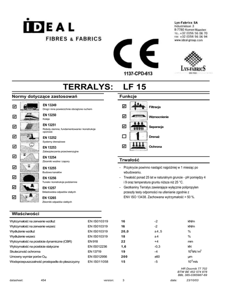 TERRALYS: Normy dotyczące zastosowań LF 15 Funkcje EN 13249 Filtracja Drogi i inne powierzchnie obciążone ruchem EN 13250 Wzmocnienie Koleje EN 13251 Separacja Roboty ziemne, fundamentowanie i konstrukcje oporowe Drenaż EN 13252 Systemy drenażowe Ochrona EN 13253 Zabezpieczenia przeciwerozyjne EN 13254 Trwałość Zbiorniki wodne i zapory - Przykrycie powinno nastąpić najpóźniej w 1 miesiąc po wbudowaniu. - Trwałość ponad 25 lat w naturalnym gruncie - pH pomiędzy 4 i 9 oraz temperatura gruntu niższa niż 25 °C. - Geotkaniny Terralys zawierające wyłącznie polipropylen przeszły testy odporności na utlenianie zgodnie z ENV ISO 13438. Zachowana wytrzymałość > 50 %. EN 13255 Budowa kanałów EN 13256 Tunele i konstrukcje podziemne EN 13257 Składowiska odpadów stałych EN 13265 Zbiorniki odpadów ciekłych Właściwości Wytrzymałość na zerwanie wzdłuż EN IS010319 16 -2 kN/m Wytrzymałość na zerwanie wszerz EN IS010319 16 -2 kN/m Wydłużenie wzdłuż EN IS010319 20,0 ±4,5 % Wydłużenie wszerz EN IS010319 18 ±4 % Wytrzymałość na przebicie dynamiczne (CBR) EN 918 22 +4 mm Wytrzymałość na przebicie statyczne EN IS012236 1,6 -0,3 kN Skuteczność ochronna EN 13719 19 -4 10 kN / m Umowny wymiar porów O90 EN IS012956 200 ±60 µm Wodoprzepuszczalność prostopadła do płaszczyzny EN IS011058 15 -5 10-3m/s 3 2 HR Doornik 77 702 BTW BE 452 574 878 BBL 385-0365987-69 datasheet: 454 version: 3 date: 23/10/03 TERRALYS: Normy dotyczące zastosowań LF 90/90 01 Funkcje EN 13249 Filtracja Drogi i inne powierzchnie obciążone ruchem EN 13250 Wzmocnienie Koleje EN 13251 Separacja Roboty ziemne, fundamentowanie i konstrukcje oporowe Drenaż EN 13252 Systemy drenażowe Ochrona EN 13253 Zabezpieczenia przeciwerozyjne EN 13254 Trwałość Zbiorniki wodne i zapory - Przykrycie powinno nastąpić najpóźniej w 1 miesiąc po wbudowaniu. - Trwałość ponad 25 lat w naturalnym gruncie - pH pomiędzy 4 i 9 oraz temperatura gruntu niższa niż 25 °C. - Geotkaniny Terralys zawierające wyłącznie polipropylen przeszły testy odporności na utlenianie zgodnie z ENV ISO 13438. Zachowana wytrzymałość > 50 %. EN 13255 Budowa kanałów EN 13256 Tunele i konstrukcje podziemne EN 13257 Składowiska odpadów stałych EN 13265 Zbiorniki odpadów ciekłych Właściwości Wytrzymałość na zerwanie wzdłuż EN IS010319 90 -10 kN/m Wytrzymałość na zerwanie wszerz EN IS010319 90 -10 kN/m Wydłużenie wzdłuż EN IS010319 21 ±5 % Wydłużenie wszerz EN IS010319 14 ±4 % Wytrzymałość na przebicie dynamiczne (CBR) EN 918 8 +2 mm Wytrzymałość na przebicie statyczne EN IS012236 9,5 -1,9 kN Skuteczność ochronna EN 13719 38 -8 10 kN / m Umowny wymiar porów O90 EN IS012956 160 ±50 µm Wodoprzepuszczalność prostopadła do płaszczyzny EN IS011058 6 -2 10-3m/s 3 2 HR Doornik 77 702 BTW BE 452 574 878 BBL 385-0365987-69 datasheet: 232 version: 5 date: 23/10/03 TERRALYS: Normy dotyczące zastosowań LF 75/75 11 Funkcje EN 13249 Filtracja Drogi i inne powierzchnie obciążone ruchem EN 13250 Wzmocnienie Koleje EN 13251 Separacja Roboty ziemne, fundamentowanie i konstrukcje oporowe Drenaż EN 13252 Systemy drenażowe Ochrona EN 13253 Zabezpieczenia przeciwerozyjne EN 13254 Trwałość Zbiorniki wodne i zapory - Przykrycie powinno nastąpić najpóźniej w 1 miesiąc po wbudowaniu. - Trwałość ponad 25 lat w naturalnym gruncie - pH pomiędzy 4 i 9 oraz temperatura gruntu niższa niż 25 °C. - Geotkaniny Terralys zawierające wyłącznie polipropylen przeszły testy odporności na utlenianie zgodnie z ENV ISO 13438. Zachowana wytrzymałość > 50 %. EN 13255 Budowa kanałów EN 13256 Tunele i konstrukcje podziemne EN 13257 Składowiska odpadów stałych EN 13265 Zbiorniki odpadów ciekłych Właściwości Wytrzymałość na zerwanie wzdłuż EN IS010319 75 -10 kN/m Wytrzymałość na zerwanie wszerz EN IS010319 75 -10 kN/m Wydłużenie wzdłuż EN IS010319 14 ±4 % Wydłużenie wszerz EN IS010319 14 ±4 % Wytrzymałość na przebicie dynamiczne (CBR) EN 918 12 +3 mm Wytrzymałość na przebicie statyczne EN IS012236 8,2 -1,6 kN Skuteczność ochronna EN 13719 34 -7 10 kN / m Umowny wymiar porów O90 EN IS012956 200 ±60 µm Wodoprzepuszczalność prostopadła do płaszczyzny EN IS011058 6 -2 10-3m/s 3 2 HR Doornik 77 702 BTW BE 452 574 878 BBL 385-0365987-69 datasheet: 179 version: 4 date: 23/10/03 TERRALYS: Normy dotyczące zastosowań LF 68/68 01 Funkcje EN 13249 Filtracja Drogi i inne powierzchnie obciążone ruchem EN 13250 Wzmocnienie Koleje EN 13251 Separacja Roboty ziemne, fundamentowanie i konstrukcje oporowe Drenaż EN 13252 Systemy drenażowe Ochrona EN 13253 Zabezpieczenia przeciwerozyjne EN 13254 Trwałość Zbiorniki wodne i zapory - Przykrycie powinno nastąpić najpóźniej w 1 miesiąc po wbudowaniu. - Trwałość ponad 25 lat w naturalnym gruncie - pH pomiędzy 4 i 9 oraz temperatura gruntu niższa niż 25 °C. - Geotkaniny Terralys zawierające wyłącznie polipropylen przeszły testy odporności na utlenianie zgodnie z ENV ISO 13438. Zachowana wytrzymałość > 50 %. EN 13255 Budowa kanałów EN 13256 Tunele i konstrukcje podziemne EN 13257 Składowiska odpadów stałych EN 13265 Zbiorniki odpadów ciekłych Właściwości Wytrzymałość na zerwanie wzdłuż EN IS010319 68 -8 kN/m Wytrzymałość na zerwanie wszerz EN IS010319 68 -8 kN/m Wydłużenie wzdłuż EN IS010319 14 ±4 % Wydłużenie wszerz EN IS010319 14 ±4 % Wytrzymałość na przebicie dynamiczne (CBR) EN 918 12 +3 mm Wytrzymałość na przebicie statyczne EN IS012236 9,0 -1,8 kN Skuteczność ochronna EN 13719 33 -7 10 kN / m Umowny wymiar porów O90 EN IS012956 170 ±60 µm Wodoprzepuszczalność prostopadła do płaszczyzny EN IS011058 4 -1 10-3m/s 3 2 HR Doornik 77 702 BTW BE 452 574 878 BBL 385-0365987-69 datasheet: 73 version: 4 date: 23/10/03 TERRALYS: Normy dotyczące zastosowań LF 57/57 11 Funkcje EN 13249 Filtracja Drogi i inne powierzchnie obciążone ruchem EN 13250 Wzmocnienie Kol