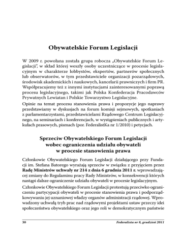Obywatelskie Forum Legislacji W 2009 r. powołana została grupa robocza „Obywatelskie Forum Legislacji”, w skład której weszły osoby uczestniczące w procesie legislacyjnym w charakterze lobbystów, ekspertów, partnerów społecznych lub obserwatorów, w tym przedstawiciele organizacji pozarządowych, środowisk akademickich i naukowych, kancelarii prawniczych i firm PR. Współpracujemy też z innymi instytucjami zainteresowanymi poprawą procesu legislacyjnego, takimi jak Polska Konfederacja Pracodawców Prywatnych Lewiatan i Polskie Towarzystwo Legislacyjne. Opinie na temat procesu stanowienia prawa i propozycje jego naprawy przedstawiamy w dyskusjach na forum komisji sejmowych, spotkaniach z parlamentarzystami, przedstawicielami Rządowego Centrum Legislacyjnego, na seminariach i konferencjach, w wystąpieniach publicznych i artykułach prasowych, pismach (por. FederalistKa nr 1/2010) i petycjach. Sprzeciw Obywatelskiego Forum Legislacji wobec ograniczenia udziału obywateli w procesie stanowienia prawa Członkowie Obywatelskiego Forum Legislacji działającego przy Fundacji im. Stefana Batorego wyrażają sprzeciw w związku z przyjęciem przez Radę Ministrów uchwały nr 214 z dnia 6 grudnia 2011 r. wprowadzającej zmiany do Regulaminu pracy Rady Ministrów, w konsekwencji których nastąpi dalsze ograniczenie udziału obywateli w procesie legislacyjnym. Członkowie Obywatelskiego Forum Legislacji protestują przeciwko ograniczeniu partycypacji obywateli w procesie stanowienia prawa i podporządkowywaniu jej uznaniowej władzy organów administracji rządowej. Wprowadzony uchwałą tryb prac nad rządowymi projektami ustaw przeczy idei społeczeństwa obywatelskiego oraz jego roli w demokratycznym państwie 30 Federalista nr 8, grudzień 2011 prawnym. Prowadzi także do dalszego ograniczenia transparentności procesu stanowienia prawa, co – wobec ostatnich zmian w ustawie o dostępie do informacji publicznej – budzi tym większy niepokój. Prawo obywateli i ich organizacji do partycypacji w procesie stanowienia prawa, a także zakres i forma tej partycypacji, pozbawione są całkowicie gwarancji ustawowych. Pragniemy w związku z tym podkreślić, że w demokratycznym państwie prawnym i społeczeństwie obywatelskim kwestie udziału obywateli w procesie stanowienia prawa, zasadniczy przebieg tego procesu, kształt poszczególnych jego elementów, wskazanie momentów i zakresu przeprowadzania konsultacji publicznych, powinny być objęte zasadą wyłączności ustawowej. Domagamy się wycofania uchwały Rady Ministrów nr 214 z dnia 6 grudnia 2011 r. W ocenie członków Obywatelskiego Forum Legislacji niezbędne jest podjęcie prac nad ustawą o stanowieniu prawa. UZASADNIENIE W Strategii Rozwoju Kraju 2020 zapisano: „Zwiększeniu partycypacji społecznej służyć będą działania mające na celu silniejsze włączenie obywateli w proces stanowienia prawa” (s. 39). Pragniemy także przypomnieć słowa Prezydenta RP wypowiedziane 8 listopada br. na posiedzeniu inauguracyjnym Sejmu RP VII kadencji: „Siła państwa demokratycznego zależy od jego sprawności i zaufania, jakim darzą go obywatele. Polacy oczekują poprawy jakości funkcjonowania państwa. Wiemy, że państwo jest dla obywateli, a nie odwrotne. Jednak pomimo już dokonanych wielu ważnych zmian na lepsze procedury biurokratyczne nadal pozostają uciążliwe. Niedostateczna jest jakość, przejrzystość i stabilność stanowionego prawa. Pilną potrzebą jest precyzyjne opisanie procesu jego stanowienia i skutecznego wprowadzania go w życie.” Warto też zwrócić uwagę, że z badań zleconych przez MPiPS („Badania efektywności mechanizmów konsultacji społecznych” zrealizowanego przez Pracownię Badań i Innowacji Społecznych Stocznia) wynika, iż brak jasnych unormowań skutkował tym, że ministerstwa często organizowały „konsultacje według własnych specyficznych reguł”, co prowadziło Federalista nr 8, grudzień 2011 31 do konstatacji, że „bardzo wskazane byłoby stworzenie regulacji ogólnorządowej ustanawiającej minimalne standardy konsultacji”. Zmiany wprowadzone do Regulaminu pracy Rady Ministrów uchwałą nr 214 z dnia 6 grudnia 2011 r. polegają na drastycznym zmniejszeniu wymagań merytorycznych wobec założeń ustaw, które mają odtąd stanowić krótki dokument prezentujący intencje prawodawcy i obejmować wyłącznie „zwięzłe przedstawienie celu projektowanej ustawy oraz zakresu przewidywanej regulacji i zasadniczych kwestii wymagających uregulowania, w tym zniesienia dotychczasowych lub powołania nowych organów lub instytucji”. Na tym etapie nie będzie już konieczne przygotowywanie szczegółowej oceny przewidywanych skutków społeczno-gospodarczych projektowanej zmiany (OSR). Dotychczasowa niska jakość tej oceny ma zostać usankcjonowana poprzez zastąpienie obowiązku przygotowywania OSR bliżej nieokreślonym „testem regulacyjnym”, który ma obejmować „w szczególności wstępną analizę ekonomiczną, finansową i społeczną”. Mając świadomość stopnia wywiązywania się organów władzy publicznej z dotychczasowych standardów Oceny Skutków Regulacji, należy wyrazić obawę, że zmniejszenie tych wymagań może doprowadzić do legislacji prowadzonej w całkowitym oderwaniu od rzetelnej oceny jej skutków ekonomiczno - społecznych. Przyjęte zmiany – jak rozumiemy ich genezę – mają ułatwić i przyspieszyć prace legislacyjne, co jednak w naszej ocenie przyniesie fatalne skutki w zakresie jakości ustaw. Istotne obawy członków Obywatelskiego Forum Legislacji budzą trudne do precyzyjnego określenia zmiany w zasadach udziału obywateli w procesie stanowienia prawa na etapie rządowym. Dotychczas, w świetle reguł przyjętych po wejściu w życie zmian procesu stanowienia prawa w kwietniu 2009 r., konsultacjom społecznym miały podlegać wyłącznie założenia ustaw. Argumentowano, że skoro ustawa powstaje na 