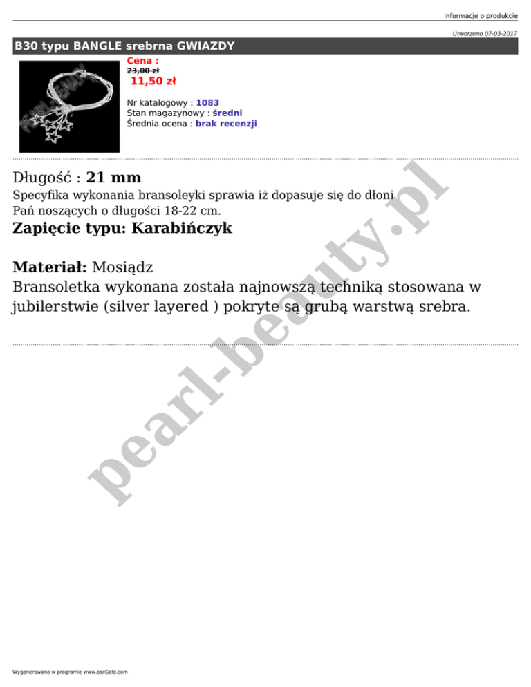 Informacje o produkcie Utworzono 07-03-2017 B30 typu BANGLE srebrna GWIAZDY Cena : 23,00 zł 11,50 zł Nr katalogowy : 1083 Stan magazynowy : średni Średnia ocena : brak recenzji pl Długość : 21 mm Specyfika wykonania bransoleyki sprawia iż dopasuje się do dłoni Pań noszących o długości 18-22 cm. ty . Zapięcie typu: Karabińczyk pe ar lbe au Materiał: Mosiądz Bransoletka wykonana została najnowszą techniką stosowana w jubilerstwie (silver layered ) pokryte są grubą warstwą srebra. Wygenerowano w programie www.oscGold.com