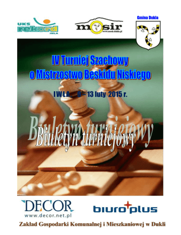 Gmina Dukla I W L A , 9 – 13 luty 2015 r. Zakład Gospodarki Komunalnej i Mieszkaniowej w Dukli Biuletyn Turniejowy IV Turnieju Szachowego o Mistrzostwo Beskidu Niskiego – 2015 IV TURNIEJ SZACHOWY O MISTRZOSTWO „BESKIDU NISKIEGO” – IWLA, 9 – 13 luty 2015 r. Organizator: UKS „Rekord” Iwla; MOSiR Dukla Sponsorzy: Firma DECOR – statuetki szklane; Biuro-Plus Dyrektor turnieju: Jerzy Gunia; Sędzia turnieju: Piotr Fałatowicz Lista startowa zawodników Nazwisko Imię Ranking FIDE Ranking PZSzach Klub 1 k Kopczyk, Daniel 2186 2200 LKS Parnas Stara Wieś 2 k Lorenc, Marian 2111 2200 KKSz Urania Krosno 3 I+ Skomiał, Mateusz 2008 2100 LKS Parnas Stara Wieś 4 I Mrozowski, Patryk 1956 2000 KKSz Urania Krosno 5 I Składanowski, Adam 1791 2000 KKSz Urania Krosno 6 I+ Czopor, Maciej 1737 2100 KS Komunalni Sanok 7 II+ Raus, Maciej 1676 1900 Krosno 8 I Szaro, Mariusz 1524 2000 Stowarzyszenie Nasz Rymanów 9 I Jurkiewicz, Zuzanna 1438 1800 UKS SP 1 Brzozów 10 II Szaro, Kazimierz 1403 1800 Stowarzyszenie Nasz Rymanów 11 I Winter, Anna 1386 1800 KKSz Urania Krosno 12 II Chodorowski, Adrian 1347 1800 KKSz Urania Krosno 13 II Guzik, Wojciech 1254 1800 KKSz Urania Krosno 14 II Gazda, Dominik 1212 1800 KKSz Urania Krosno 15 II Guzik, Kacper 1142 1800 KKSz Urania Krosno 16 I Duplaga, Zbigniew 0 2000 Stowarzyszenie Nasz Rymanów 17 II Szwast, Kamil 0 1800 Iwla 18 II Fałatowicz, Paweł 0 1800 Stowarzyszenie Nasz Rymanów 19 II Krukar, Jakub 0 1800 Stowarzyszenie Nasz Rymanów 20 II Guzik, Michał 0 1800 KKSz Urania Krosno 21 II Mrozowska, Gabriela 0 1600 KKSz Urania Krosno 22 II Kluk, Julia 0 1600 Iwla 23 II Uliasz, Katarzyna 0 1600 KKSz Urania Krosno 24 II Trybus, Izabela 0 1600 KKSz Urania Krosno 25 III Krówka, Ireneusz 0 1600 Iwla 26 III Krówka, Damian 0 1600 Iwla Copyrights by UKS “Rekord” Iwla, 2015, all rights reserved 2 Tytuł Strona Nr Biuletyn Turniejowy IV Turnieju Szachowego o Mistrzostwo Beskidu Niskiego – 2015 9 luty 2015 r. godz. 1300 (kojarzenie i wyniki) Stół Białe Wynik Czarne 1 Kopczyk, Daniel 1-0 Gazda, Dominik 2 Guzik, Kacper 0-1 Lorenc, Marian 3 Skomiał, Mateusz 1-0 Duplaga, Zbigniew 4 Szwast, Kamil 0-1 Mrozowski, Patryk 5 Składanowski, Adam 1-0 Fałatowicz, Paweł 6 Krukar, Jakub 0-1 Czopor, Maciej 7 Raus, Maciej 1-0 Guzik, Michał 8 Mrozowska, Gabriela 0-1 Szaro, Mariusz 9 Jurkiewicz, Zuzanna 1-0 Kluk, Julia 10 Uliasz, Katarzyna 0-1 Szaro, Kazimierz 11 Winter, Anna 1-0 Trybus, Izabela 12 Krówka, Ireneusz ½-½ Chodorowski, Adrian 13 Guzik, Wojciech 1-0 Krówka, Damian 1. d4 d5 2. c4 e6 3. N c3 n f6 4. N f3 l e7 5. Q c2 n bd7 6. L f 4 b6 7. a3 c5 8. N b5 O-O 9. L c7 W e8 10. N d6 l xd6 11. L xd6 n e4 12. L xf 8 W xf 8 13. e3 l b7 14. L d3 n df6 15. O- O h6 16. R ac 1 W d6 17. b4 T c8 18. Q b2 l a8 19. L xe4 n xe4 20. c xd5 l xd5 21. dxc5 bxc 5 22. bxc 5 T xc5 23. R xc 5 W xc5 24. R c1 W a5 25. h4 k h7 26. Q b4 W d8 27. R d1 g5 28. Q xe4+ l xe4 29. R xd8 l xf 3 30. gxf 3 gxh4 1 0 1.2 Guzik, Kacper (1142) - Lorenc, Mari an (2111) ( 0 - 1) 1. e4 c5 2. N f3 d6 3. d4 cxd4 4. N xd4 n f6 5. N c3 a6 6. L e3 n g4 7. L c4 n xe3 8. f xe3 e6 9. O-O l e7 10. Q f3 O- O 11. R ad1 W c7 12. L b3 n c6 13. R d2 n e5 14. Q h5 b5 15. R df 2 g6 16. Q h3 l d7 17. N xe6 f xe6 18. L xe6+ k g7 19. N d5 W d8 20. R xf 8 l xf 8 21. L xd7 W xd7 22. Q h4 W d8 23. Q xd8 T xd8 24. N c7 T c8 25. N e6+ k g8 26. R f2 l h6 27. N f4 n c4 28. g3 n xb2 29. K g2 n c4 30. K f 3 n e5+ 31. K g2 n g4 32. R e2 T xc 2 33. R xc 2 n xe3+ 34. K f3 n xc 2 35. N d5 n d4+ 36. K f2 a5 37. K e1 k f7 38. K d1 k e6 39. N c3 k e5 40. a3 l e3 41. g4 l g5 0 - 1 1.3 Skomi ał, Mat eusz (2008) - Dupl aga, Zbigni ew (0) ( 1 - 0) 1. e4 c6 2. d4 d5 3. exd5 cxd5 4. c4 n f 6 5. N c 3 n c6 6. L f4 a6 7. c 5 g6 8. N a4 l g7 9. N b6 T a7 10. L e2 l e6 11. L f3 O-O 12. N e2 l g4 13. L xg4 n xg4 14. h3 n f6 15. O-O T e8 16. R e1 e6 17. L g5 h6 18. L h4 g5 19. L g3 n d7 20. N a4 W f 6 21. Q b3 n xd4 22. N xd4 W xd4 23. R ad1 n xc 5 24. N xc 5 W xc5 25. R xd5 W c8 26. R d2 b5 27. R ed1 W c4 28. Q f 3 e5 29. b3 W e6 30. R d6 W e7 31. Q e4 W b7 32. Q f 5 W c8 33. Q f3 W b7 34. Q e2 W a8 35. h4 gxh 4 36. L xh4 T c7 37. Q g4 W c8 38. Q g3 T c3 39. f3 W f5 40. R f6 W h7 41. R xa6 T ec 8 42. R ad6 T c1 1 - 0 1.4 Szwast, Kamil (0) - Mr ozowski, Patr yk (1956) ( 0 - 1) Copyrights by UKS “Rekord” Iwla, 2015, all rights reserved 3 1.1 Kopcz yk, Daniel ( 2186) - Gazda, Domi nik (1212) ( 1 - 0) Strona Runda 1 – Biuletyn Turniejowy IV Turnieju Szachowego o Mistrzostwo Beskidu Niskiego – 2015 1. N f3 d5 2. g3 n f6 3. L g2 e6 4. O-O n bd7 5. c4 c6 6. d4 l e7 7. c xd5 exd5 8. N h4 O-O 9. N f5 T e8 10. N xe7+ T xe7 11. N c3 n b6 12. L g5 T e6 13. Q c2 h6 14. L f4 W e8 15. R fe1 n h5 16. L c1 n c4 17. e4 dxe4 18. Q e2 n d6 19. Q xh5 b6 20. L f4 l a6 21. L xd6 T xd6 22. R xe4 1 - 0 1.6 Krukar, Jakub (0) - Cz opor, Maciej ( 1737) (0 - 1) 1. d4 n f6 2. c4 g6 3. N f3 l g7 4. N c3 O-O 5. L g5 d6 6. e3 n bd7 7. L e2 h6 8. L h4 g5 9. L g3 n e8 10. L d3 e6 11. O-O f 5 12. N e2 b6 13. h3 l b7 14. N d2 e5 15. L c2 f 4 16. L h2 n ef6 17. d5 a5 18. N e4 n xe4 19. L xe4 n c5 20. N c3 n xe4 21. N xe4 l c8 22. Q d2 f3 23. g4 h5 24. N g3 hxg4 25. hxg4 l xg4 26. e4 W f6 27. R fc1 W h6 28. Q e1 k f7 29. a3 T h8 30. N f1 W h3 31. N e3 W xh2+ 32. K f1 W h1# 0 - 1 1.7 Raus, Maciej ( 1676) - Guzik, Mi chał (0) ( 1 0) 1. d4 n f6 2. c4 d6 3. N c3 g6 4. e4 l g7 5. g3 O-O 6. L g2 l d7 7. e5 dxe5 8. dxe5 n e8 9. L xb7 l c6 10. Q xd8 l xb7 11. f3 n d6 12. Q xc 7 l xe5 13. c5 T c8 14. Q a5 n c6 15. Q a4 n f5 16. L f4 l xf4 17. Q xf 4 n cd4 18. O-O-O T xc 5 19. R xd4 n xd4 20. Q xd4 T ac 8 21. Q e3 T d5 22. N ge2 e6 23. Q xa7 T d7 24. Q e3 T d5 25. K b1 T f5 26. N d4 T a5 27. R d1 T ca8 28. a3 T d8 29. N e4 T b8 30. Q h6 l xe4+ 31. f xe4 T xa3 32. N c6 1 - 0 1.8 Mr ozowska, Gabriel a (0) - Szaro, Mariusz (1524) ( 0 - 1) 1. e4 e5 2. N f3 n c 6 3. L c4 l e7 4. d3 d6 5. h3 n f6 6. N c3 O-O 7. O- O n a5 8. L d2 n xc4 9. dxc 4 l e6 10. N d5 n xe4 11. Q e2 n f6 12. N xf 6