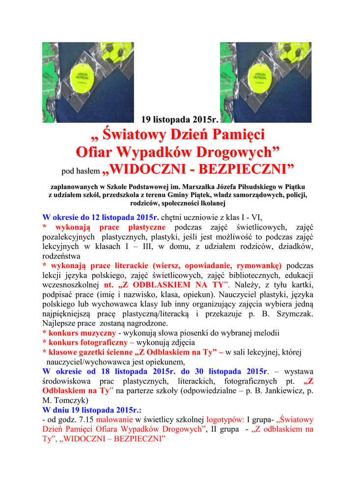 19 listopada 2015r. „ Światowy Dzień Pamięci Ofiar Wypadków Drogowych” pod hasłem „WIDOCZNI - BEZPIECZNI” zaplanowanych w Szkole Podstawowej im. Marszałka Józefa Piłsudskiego w Piątku z udziałem szkól, przedszkola z terenu Gminy Piątek, władz samorządowych, policji, rodziców, społeczności lkolanej W okresie do 12 listopada 2015r. chętni uczniowie z klas I - VI, * wykonają prace plastyczne podczas zajęć świetlicowych, zajęć pozalekcyjnych plastycznych, plastyki, jeśli jest możliwość to podczas zajęć lekcyjnych w klasach I – III, w domu, z udziałem rodziców, dziadków, rodzeństwa * wykonają prace literackie (wiersz, opowiadanie, rymowankę) podczas lekcji języka polskiego, zajęć świetlicowych, zajęć bibliotecznych, edukacji wczesnoszkolnej nt. „Z ODBLASKIEM NA TY”. Należy, z tyłu kartki, podpisać prace (imię i nazwisko, klasa, opiekun). Nauczyciel plastyki, języka polskiego lub wychowawca klasy lub inny organizujący zajęcia wybiera jedną najpiękniejszą pracę plastyczną/literacką i przekazuje p. B. Szymczak. Najlepsze prace zostaną nagrodzone. * konkurs muzyczny - wykonują słowa piosenki do wybranej melodii * konkurs fotograficzny – wykonują zdjęcia * klasowe gazetki ścienne „Z Odblaskiem na Ty” – w sali lekcyjnej, której nauczyciel/wychowawca jest opiekunem, W okresie od 18 listopada 2015r. do 30 listopada 2015r. – wystawa środowiskowa prac plastycznych, literackich, fotograficznych pt. „Z Odblaskiem na Ty” na parterze szkoły (odpowiedzialne – p. B. Jankiewicz, p. M. Tomczyk) W dniu 19 listopada 2015r.: - od godz. 7.15 malowanie w świetlicy szkolnej logotypów: I grupa- „Światowy Dzień Pamięci Ofiara Wypadków Drogowych”, II grupa - „Z odblaskiem na Ty”, „WIDOCZNI – BEZPIECZNI” Wzory powyższych haseł drukuje p. R. Wojciechowski, przekazuje w dniu 16.11.2015r. (do godziny 13.30) p. B. Szymczak. Wywieszenie logotypu I grupy w wejściu szkoły (18.11.2015r. rano)– p. Jagiełło. W dniu 19.11.2015r. * godz. 8.55 na holu II piętra odbędzie się apel „WIDOCZNI BEZPIECZNI”” z udziałem uczniów klas I – VI pod opieką nauczycieli i pracowników szkoły, Rady Rodziców (zapraszają wychowawcy klas), policji KPP w Łęczycy i Rewiru Dzielnicowego w Piątku, - przedstawienie profilaktyczne „WIDOCZNI – BEZPIECZNI” w wykonaniu uczniów klasy I a pod kierunkiem p. mgr B. Wójcik - pokaz „Moda z Odblaskiem” pod kierunkiem p. mgr B. Szymczak - wręczenie kamizelek odblaskowych uczniom klas I, wręczenie dyplomów, nagród rzeczowych uczniom za zajęcie I miejsca w kategorii praca plastyczna, praca literacka, praca muzyczna. Pan R. Wojciechowski przygotowuje ekran, projektor i laptop. Pan S. Jagiełło zasłania okno, przygotowuje ławki z dwóch pięter. * po apelu zostają przedstawiciele klas III – VI – po 2-3 uczniów z klasy, Rada Rodziców, policjanci, nauczyciele, którzy w tym czasie nie mają lekcji: szkolna debata nt. „Z Odblaskiem na Ty”. Podczas debaty szkolnej wypracujemy „Apel WIDOCZNI - BEZPIECZNI” tematycznie związany z hasłem przewodnim akcji. * godz. 10.30 – Marsz Milczenia w Środku Polski z logotypami – hasłami przygotowanymi w ramach zajęć klasowych, Happening w Środku Polski „Z Odblaskiem na Ty”, „WIDOCZNI – BEZPIECZNI”, „Światowy Dzień Pamięci Ofiara Wypadków Drogowych’. Rozmowa kierowana, dyskusja nt. „WIDOCZNI - BEZPIECZNI”. Pokaz udzielania pierwszej pomocy przedmedycznej w wykonaniu uczniów, uczestników Marszu Milczenia w Środku Polski pod bacznym okiem nauczycieli, policji, nauczycieli WOŚP (odpowiedzialne p. B. Szymczak, p. M. Tomczyk) Przemarsz na cmentarz – uczestnicy Marszu Milczenia, zapalenie znicza na grobach tragicznie zmarłych w wypadku drogowym. Po tym wszyscy uczestnicy wracają do szkoły. Podczas tego dnia społeczność szkolna ubrana jest w kamizelki odblaskowe symbolizujące troskę o bezpieczeństwo na polskich drogach i głośne wołanie o noszenie odblasków, kiedy poruszamy się w ruchu drogowym.
