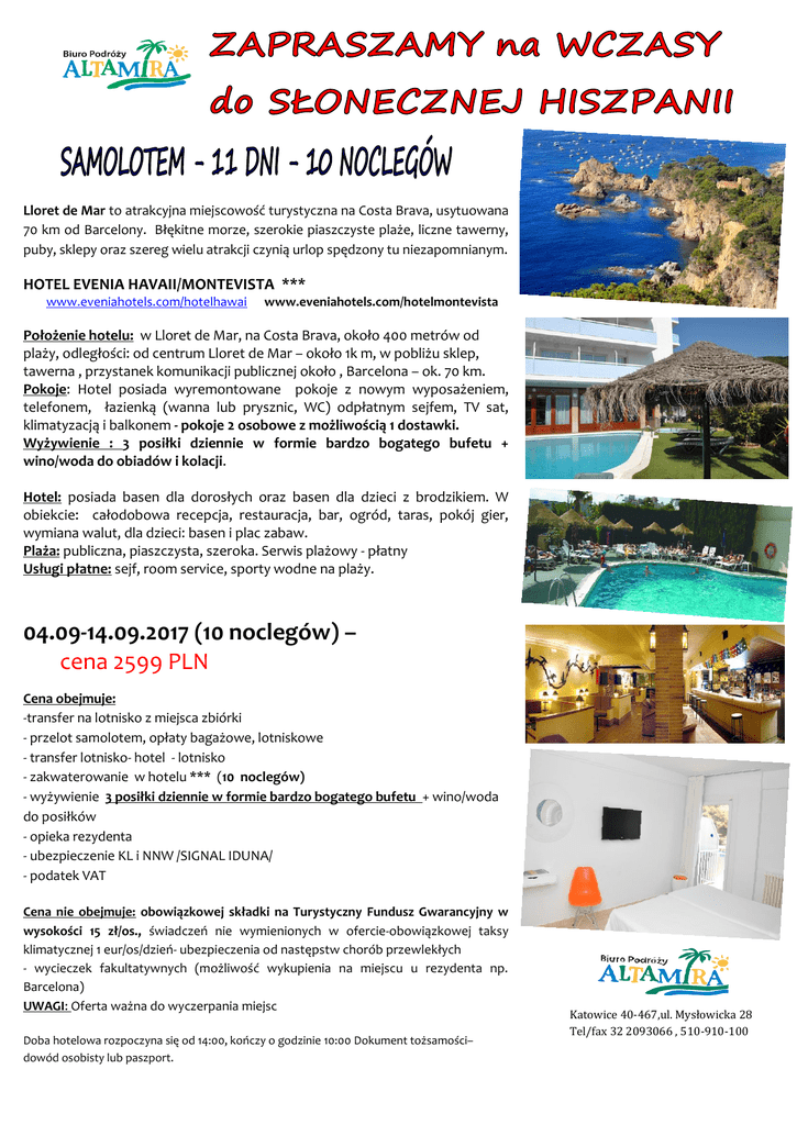 Lloret de Mar to atrakcyjna miejscowość turystyczna na Costa Brava, usytuowana 70 km od Barcelony. Błękitne morze, szerokie piaszczyste plaże, liczne tawerny, puby, sklepy oraz szereg wielu atrakcji czynią urlop spędzony tu niezapomnianym. HOTEL EVENIA HAVAII/MONTEVISTA *** www.eveniahotels.com/hotelhawai www.eveniahotels.com/hotelmontevista Położenie hotelu: w Lloret de Mar, na Costa Brava, około 400 metrów od plaży, odległości: od centrum Lloret de Mar – około 1k m, w pobliżu sklep, tawerna , przystanek komunikacji publicznej około , Barcelona – ok. 70 km. Pokoje: Hotel posiada wyremontowane pokoje z nowym wyposażeniem, telefonem, łazienką (wanna lub prysznic, WC) odpłatnym sejfem, TV sat, klimatyzacją i balkonem - pokoje 2 osobowe z możliwością 1 dostawki. Wyżywienie : 3 posiłki dziennie w formie bardzo bogatego bufetu + wino/woda do obiadów i kolacji. Hotel: posiada basen dla dorosłych oraz basen dla dzieci z brodzikiem. W obiekcie: całodobowa recepcja, restauracja, bar, ogród, taras, pokój gier, wymiana walut, dla dzieci: basen i plac zabaw. Plaża: publiczna, piaszczysta, szeroka. Serwis plażowy - płatny Usługi płatne: sejf, room service, sporty wodne na plaży. 04.09-14.09.2017 (10 noclegów) – cena 2599 PLN Cena obejmuje: -transfer na lotnisko z miejsca zbiórki - przelot samolotem, opłaty bagażowe, lotniskowe - transfer lotnisko- hotel - lotnisko - zakwaterowanie w hotelu *** (10 noclegów) - wyżywienie 3 posiłki dziennie w formie bardzo bogatego bufetu + wino/woda do posiłków - opieka rezydenta - ubezpieczenie KL i NNW /SIGNAL IDUNA/ - podatek VAT Cena nie obejmuje: obowiązkowej składki na Turystyczny Fundusz Gwarancyjny w wysokości 15 zł/os., świadczeń nie wymienionych w ofercie-obowiązkowej taksy klimatycznej 1 eur/os/dzień- ubezpieczenia od następstw chorób przewlekłych - wycieczek fakultatywnych (możliwość wykupienia na miejscu u rezydenta np. Barcelona) UWAGI: Oferta ważna do wyczerpania miejsc Doba hotelowa rozpoczyna się od 14:00, kończy o godzinie 10:00 Dokument tożsamości– dowód osobisty lub paszport. Katowice 40-467,ul. Mysłowicka 28 Tel/fax 32 2093066 , 510-910-100