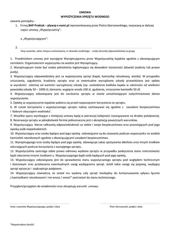 UMOWA WYPOŻYCZENIA SPRZĘTU WODNEGO zawarta pomiędzy : 1. Firmą BHP Praktyk – pływaj-z-nami.pl reprezentowaną przez Piotra Gierszewskiego, nazywaną w dalszej części umowy „Wypożyczalnią”: a „Wypożyczającym”: 2. ........................................................................................................................ Imię nazwisko, adres miejsca zamieszkania, nr dowodu osobistego - osoby dorosłej odpowiedzialnej za grupę 1. Przedmiotem umowy jest wynajęcie Wynajmującemu przez Wypożyczalnię kajaków zgodnie z obowiązującym cennikiem. Organizatorem wypoczynku na wodzie jest Wynajmujący. 2. Wynajmującym może być osoba pełnoletnia legitymująca się dowodem tożsamości (dowód osobisty lub prawo jazdy). 3. Wypożyczający odpowiedzialny jest za wypożyczony sprzęt (kajak, kamizelkę ratunkową, wiosła). W przypadku zniszczenia, zagubienia, kradzieży sprzętu oraz za ewentualne wyrządzone szkody przewidziana jest opłata w wysokości zależnej od wartości wyrządzonej szkody (np. uszkodzenie kadłuba kajaka w zależności od wielkości powstałej szkody 50 – 1000 zł; złamanie, wygięcie wiosła 100 zł, zgubienie, zniszczenie kamizelki 50 zł) 4. Wypożyczający zobowiązany jest do zwrócenia sprzętu w stanie umożliwiającym natychmiastowe dalsze wypożyczenie. 5. Opłatę za wypożyczenie kajaków pobiera się przed rozpoczęciem korzystania ze sprzętu. 6. W czasie korzystania z wypożyczonego sprzętu należy zachowywać się zgodnie z zasadami bezpieczeństwa i ‘dobrym obyczajem wodniaka’. 7. Wszelkie spory wynikające z niniejszej umowy będą w pierwszej kolejności rozwiązywane na drodze polubownej. 8. Rezerwacja sprzętu w jakiejkolwiek formie jednoznaczna jest z akceptacją powyższych warunków. 9. Wypożyczający bierze całkowitą odpowiedzialność za siebie i swoje bezpieczeństwo oraz pozostających pod jego opieką osób niepełnoletnich. 10. Wypożyczający oraz osoby będące pod jego opieką zobowiązane są do używania podczas wypoczynku na wodzie kamizelek ratunkowych zgodnie z obowiązującymi zasadami bezpieczeństwa. 11. Wynajmującego oraz osoby będące pod jego opieką obowiązuje zakaz spożywania alkoholu oraz innych środków odurzających podczas korzystania z wynajętego sprzętu . 12. Wypożyczalnia zastrzega sobie prawo odmowy wydania sprzętu w przypadku podejrzenia stanu nietrzeźwości bądź odurzenia innymi środkami u Wypożyczającego bądź osób będących pod jego opieką. 13. Wypożyczający zobowiązany jest do sprawdzenia stanu wypożyczanego sprzętu pod względem technicznym i ilościowym oraz przekazania ewentualnych uwag wydającemu sprzęt. Jeżeli takie uwagi się pojawią, wydający sprzęt opisze je i zaakceptuje podpisem. 14. Wypożyczający oświadcza, że został mu wydany cały sprzęt niezbędny do kontynuowania spływu łącznie z kamizelkami ratunkowymi i nie wnosi / wnosi* zastrzeżeń do stanu technicznego. Przyjąłem/przyjęłam do wiadomości oraz akceptuję warunki umowy: ...................................................... Imię i nazwisko Wypożyczającego, podpis i data *Niepotrzebne skreślić ...................................................... Piotr Gierszewski, podpis i data
