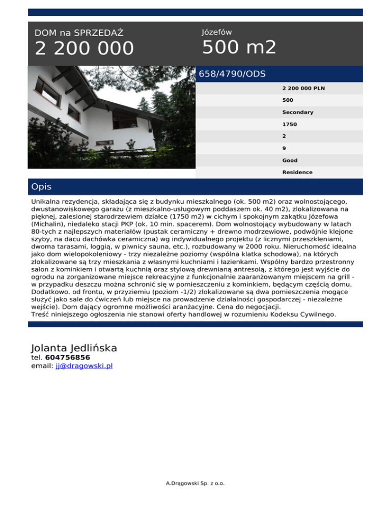 DOM na SPRZEDAŻ 2 200 000 Józefów 500 m2 658/4790/ODS 2 200 000 PLN 500 Secondary 1750 2 9 Good Residence Opis Unikalna rezydencja, składająca się z budynku mieszkalnego (ok. 500 m2) oraz wolnostojącego, dwustanowiskowego garażu (z mieszkalno-usługowym poddaszem ok. 40 m2), zlokalizowana na pięknej, zalesionej starodrzewiem działce (1750 m2) w cichym i spokojnym zakątku Józefowa (Michalin), niedaleko stacji PKP (ok. 10 min. spacerem). Dom wolnostojący wybudowany w latach 80-tych z najlepszych materiałów (pustak ceramiczny + drewno modrzewiowe, podwójnie klejone szyby, na dacu dachówka ceramiczna) wg indywidualnego projektu (z licznymi przeszkleniami, dwoma tarasami, loggią, w piwnicy sauna, etc.), rozbudowany w 2000 roku. Nieruchomość idealna jako dom wielopokoleniowy - trzy niezależne poziomy (wspólna klatka schodowa), na których zlokalizowane są trzy mieszkania z własnymi kuchniami i łazienkami. Wspólny bardzo przestronny salon z kominkiem i otwartą kuchnią oraz stylową drewnianą antresolą, z którego jest wyjście do ogrodu na zorganizowane miejsce rekreacyjne z funkcjonalnie zaaranżowanym miejscem na grill w przypadku deszczu można schronić się w pomieszczeniu z kominkiem, będącym częścią domu. Dodatkowo. od frontu, w przyziemiu (poziom -1/2) zlokalizowane są dwa pomieszczenia mogące służyć jako sale do ćwiczeń lub miejsce na prowadzenie działalności gospodarczej - niezależne wejście). Dom dający ogromne możliwości aranżacyjne. Cena do negocjacji. Treść niniejszego ogłoszenia nie stanowi oferty handlowej w rozumieniu Kodeksu Cywilnego. Jolanta Jedlińska tel. 604756856 email: [email protected] A.Drągowski Sp. z o.o. Powered by TCPDF (www.tcpdf.org)