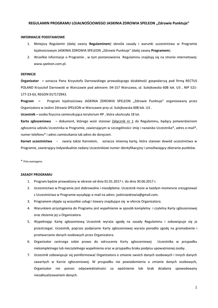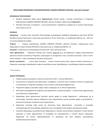 REGULAMIN PROGRAMU LOJALNOŚCIOWEGO JASKINIA ZDROWIA SPELEON „Zdrowie Punktuje” INFORMACJE PODSTAWOWE 1. Niniejszy Regulamin (dalej zwany Regulaminem) określa zasady i warunki uczestnictwa w Programie lojalnościowym JASKINIA ZDROWIA SPELEON „Zdrowie Punktuje” (dalej zwany Programem). 2. Wszelkie informacje o Programie , w tym postanowienia Regulaminu znajdują się na stronie internetowej: www.speleon.com.pl. DEFINICJE Organizator – oznacza Pana Krzysztofa Darnowskiego prowadzącego działalność gospodarczą pod firmą RECTUS POLAND Krzysztof Darnowski w Warszawie pod adresem: 04-157 Warszawa, ul. Sulejkowska 60B lok. U3 , NIP 521177-23-63, REGON 017172943. Program – Program lojalnościowy JASKINIA ZDROWIA SPELEON „Zdrowie Punktuje” organizowany przez Organizatora w Jaskini Zdrowia SPELEON w Warszawie przy ul. Sulejkowska 60B lok. U3 . Uczestnik – osoba fizyczna zamieszkująca terytorium RP , która ukończyła 18 lat. Karta zgłoszeniowa – dokument, którego wzór stanowi Załącznik nr 1 do Regulaminu, będący potwierdzeniem zgłoszenia udziału Uczestnika w Programie, zawierającym w szczególności: imię i nazwisko Uczestnika*, adres e-mail*, numer telefonu* i adres zamieszkania lub adres do doręczeń. Karnet uczestnictwa - zwany także Karnetem, oznacza imienną kartę, która stanowi dowód uczestnictwa w Programie, zawierający indywidualnie nadany Uczestnikowi numer identyfikacyjny i umożliwiający zbieranie punktów. * Pola wymagane. ZASADY PROGRAMU 1. Program będzie prowadzony w okresie od dnia 01.01.2017 r. do dnia 30.06.2017 r. 2. Uczestnictwo w Programie jest dobrowolne i nieodpłatne. Uczestnik może w każdym momencie zrezygnować z Uczestnictwa w Programie wysyłając e-mail na adres: [email protected]. 3. Programem objęte są wszystkie usługi i towary znajdujące się w ofercie Organizatora. 4. Warunkiem przystąpienia do Programu jest wypełnienie w sposób kompletny i czytelny Karty zgłoszeniowej oraz złożenie jej u Organizatora. 5. Wypełniając Kartę zgłoszeniową Uczestnik wyraża zgodę na zasady Regulaminu i zobowiązuje się je przestrzegać. Uczestnik, poprzez podpisanie Karty zgłoszeniowej wyraża ponadto zgodę na gromadzenie i przetwarzanie danych osobowych przez Organizatora. 6. Organizator zastrzega sobie prawo do odrzucenia Karty zgłoszeniowej Uczestnika w przypadku niekompletnego lub nieczytelnego wypełnienia oraz w przypadku braku podpisu upoważnionej osoby. 7. Uczestnik zobowiązuje się poinformować Organizatora o zmianie swoich danych osobowych i innych danych zawartych w Karcie zgłoszeniowej. W przypadku nie powiadomienia o zmianie danych osobowych, Organizator nie ponosi odpowiedzialności za opóźnienie lub brak działania spowodowany niezaktualizowaniem danych. 1 KARNET UCZESTNICTWA W PROGRAMIE 1. Każdy Uczestnik, po spełnieniu warunków przewidzianych przez Organizatora otrzyma Karnet uczestnictwa. Wzór Karnetu stanowi Załącznik nr 2 do Regulaminu. 2. Karnet wydawany jest Uczestnikowi bezpłatnie i jest ważny nie dłużej niż przez okres 6 miesięcy od daty jego wydania zamieszczonej na Karnecie. 3. Karnet służy do zbierania punktów przez Uczestnika i umożliwia wymianę punktów na nagrody. Lista nagród Programu stanowi Załącznik nr 3 do Regulaminu. SYSTEM PRZYZNAWANIA PUNKÓW UCZESTNIKOWI 1. Organizator zobowiązuje się przyznawać Uczestnikowi punkty za nabycie usług lub towarów z oferty Organizatora. 2. Warunkiem przyznania punktów jest wręczenie przez Uczestnika swojego Karnetu uczestnictwa Organizatorowi podczas dokonywania zakupu celem wstemplowania na Karnecie przyznanej podczas dokonanych zakupów ilości punktów. 3. Punkty przyznawane są według następującego przelicznika: za każdy jednorazowy zakup usług : wejście do groty solnej/sauny, kinesiotaping, nordic walking - 1 punkt; wybrany masaż 30 minut, tajski masaż stóp 45 minut – 2 punkty wybrany masaż 60 minut, terapia manualna, tajski masaż jogiczny – 3 punkty Uczestnik otrzyma potwierdzenie ilości przyznanych punktów poprzez wstemplowanie punktów na Karnecie. W przypadku gdy Uczestnik zwróci nabyte towary, punkty, które zostały mu przyznane za ich zakup, będą usuwane z Karnetu. 4. Punkty zebrane na Karnecie Uczestnika mogą być zamieniane na nagrody w każdej chwili do czasu ważności Karnetu. Uczestnikowi nie przysługuje prawo żądania wymiany punktów na pieniądze. ODPOWIEDZIALNOŚĆ ORGANIZATORA 1. Organizator nie ponosi odpowiedzialności za rzetelność i prawdziwość danych podanych przez Uczestników. 2. Organizator zastrzega sobie prawo do wykluczenia z udziału w Programie Uczestników, których działania są sprzeczne z prawem lub Regulaminem, w tym Uczestników którzy posługują się nieprawdziwymi danymi osobowymi. PRZETWARZANIE DANYCH OSOBOWYCH 1. Dane osobowe Uczestnika Programu będą przetwarzane przez Organizatora jako administratora danych osobowych. Dane te będą przetwarzane przez Organizatora w celu dokonania czynności niezbędnych do prawidłowego przeprowadzenia Programu. 2. Za odrębną i dodatkową zgodą Uczestnika dane osobowe Uczestnika będą także przetwarzane w celu marketingu bezpośredniego towarów i usług Organizatora. 3. Uczestnicy programu mają prawo dostępu do swoich danych osobowych oraz ich poprawiania. Dane osobowe dla celów realizacji Programu są podawane na zasadach dobrowolności, ale niezbędne w celu wzięcia udziału w Programie. 2 4. Na potrzeby przeprowadzenia Programu, Organizator zbiera następujące dane Uczestników Programu: imię*, nazwisko*, adres e-mail*, numer telefonu*, adres zamieszkania lub adres do doręczeń. * Pola wymagane TRYB SKŁADANIA I ROZPATRYWANIA REKLAMACJI 1. Wszelkie reklamacje i zastrzeżenia dotyczące Programu mogą być składane przez Uczestników Programu w ciągu 14 dni od dnia dającego podstawę do wniesienia takiej reklamacji w formie pisemnej listem poleconym na adres Organizatora lub drogą elektro