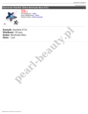 Informacje o produkcie Utworzono 07-03-2017 Swarovski Starfish 28mm Bermuda Blue 6721 Cena : 18,80 zł Nr katalogowy : 1001 Stan magazynowy : niski Średnia ocena : brak recenzji pe ar lbe au ty . pl Kształt: Starfish 6721 Wielkość: 28 mm Kolor: Bermuda Blue Ilość: 1szt Wygenerowano w programie www.oscGold.com