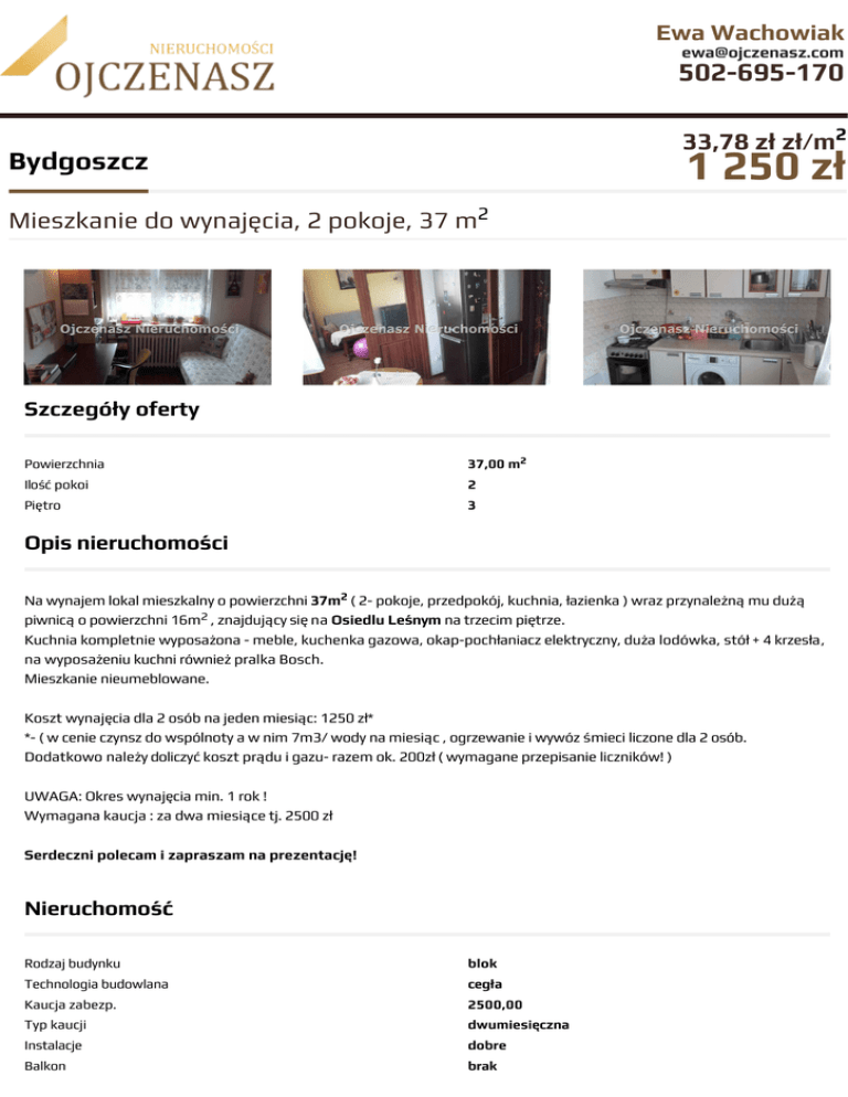 Ewa Wachowiak [email protected] 502-695-170 33,78 zł zł/m2 1 250 zł Bydgoszcz Mieszkanie do wynajęcia, 2 pokoje, 37 m2 Szczegóły oferty Powierzchnia 37,00 m2 Ilość pokoi 2 Piętro 3 Opis nieruchomości Na wynajem lokal mieszkalny o powierzchni 37m2 ( 2- pokoje, przedpokój, kuchnia, łazienka ) wraz przynależną mu dużą piwnicą o powierzchni 16m2 , znajdujący się na Osiedlu Leśnym na trzecim piętrze. Kuchnia kompletnie wyposażona - meble, kuchenka gazowa, okap-pochłaniacz elektryczny, duża lodówka, stół + 4 krzesła, na wyposażeniu kuchni również pralka Bosch. Mieszkanie nieumeblowane. Koszt wynajęcia dla 2 osób na jeden miesiąc: 1250 zł* *- ( w cenie czynsz do wspólnoty a w nim 7m3/ wody na miesiąc , ogrzewanie i wywóz śmieci liczone dla 2 osób. Dodatkowo należy doliczyć koszt prądu i gazu- razem ok. 200zł ( wymagane przepisanie liczników! ) UWAGA: Okres wynajęcia min. 1 rok ! Wymagana kaucja : za dwa miesiące tj. 2500 zł Serdeczni polecam i zapraszam na prezentację! Nieruchomość Rodzaj budynku blok Technologia budowlana cegła Kaucja zabezp. 2500,00 Typ kaucji dwumiesięczna Instalacje dobre Balkon brak