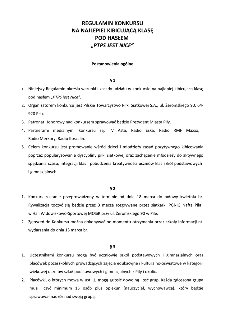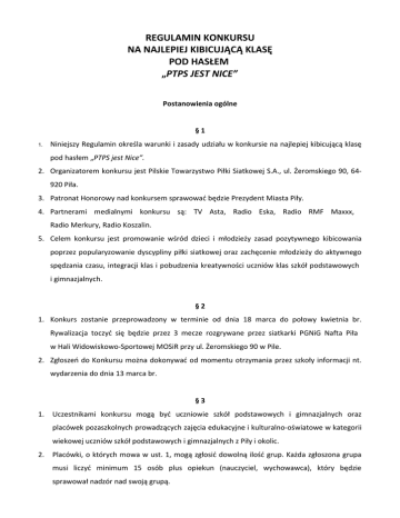 REGULAMIN KONKURSU NA NAJLEPIEJ KIBICUJĄCĄ KLASĘ POD HASŁEM „PTPS JEST NICE” Postanowienia ogólne §1 1. Niniejszy Regulamin określa warunki i zasady udziału w konkursie na najlepiej kibicującą klasę pod hasłem „PTPS jest Nice”. 2. Organizatorem konkursu jest Pilskie Towarzystwo Piłki Siatkowej S.A., ul. Żeromskiego 90, 64920 Piła. 3. Patronat Honorowy nad konkursem sprawować będzie Prezydent Miasta Piły. 4. Partnerami medialnymi konkursu są: TV Asta, Radio Eska, Radio RMF Maxxx, Radio Merkury, Radio Koszalin. 5. Celem konkursu jest promowanie wśród dzieci i młodzieży zasad pozytywnego kibicowania poprzez popularyzowanie dyscypliny piłki siatkowej oraz zachęcenie młodzieży do aktywnego spędzania czasu, integracji klas i pobudzenia kreatywności uczniów klas szkół podstawowych i gimnazjalnych. §2 1. Konkurs zostanie przeprowadzony w terminie od dnia 18 marca do połowy kwietnia br. Rywalizacja toczyć się będzie przez 3 mecze rozgrywane przez siatkarki PGNiG Nafta Piła w Hali Widowiskowo-Sportowej MOSiR przy ul. Żeromskiego 90 w Pile. 2. Zgłoszeń do Konkursu można dokonywać od momentu otrzymania przez szkoły informacji nt. wydarzenia do dnia 13 marca br. §3 1. Uczestnikami konkursu mogą być uczniowie szkół podstawowych i gimnazjalnych oraz placówek pozaszkolnych prowadzących zajęcia edukacyjne i kulturalno-oświatowe w kategorii wiekowej uczniów szkół podstawowych i gimnazjalnych z Piły i okolic. 2. Placówki, o których mowa w ust. 1, mogą zgłosić dowolną ilość grup. Każda zgłoszona grupa musi liczyć minimum 15 osób plus opiekun (nauczyciel, wychowawca), który będzie sprawował nadzór nad swoją grupą. 3. Zgłoszeń do udziału w Konkursie dokonują wychowawcy klas lub opiekunowie grup. Każdą grupę zgłasza się na oddzielnym formularzu. §4 1. Zgłoszeniem do udziału w Konkursie jest przesłanie do Klubu PTPS S.A. wypełnionego formularza, którego wzór stanowi załącznik nr 1 do niniejszego Regulaminu. Sposoby dostarczenia formularza: a) osobiście do siedziby klubu PTPS S.A., ul. Żeromskiego 90, Piła b) elektronicznie – na adres: [email protected] z dopiskiem w tytule "PTPS jest NICE" c) faxem – na numer: 67 349 16 04 2. Po otrzymaniu prawidłowo wypełnionego formularza Organizator przekaże danej grupie bilety wstępu na wszystkie trzy mecze z góry oraz po 3 bilety na osobę dla rodziców, znajomych. 3. Każda grupa zobowiązana jest podać w formularzu nazwę pod jaką będzie kibicować w konkursie. 4. Każdy uczestnik konkursu otrzyma koszulkę z hasłem „PTPS jest Nice”, którą będzie zobowiązany mieć na sobie na każdym meczu konkursowym. §5 1. Nad prawidłowym przebiegiem konkursu czuwać będzie Komisja konkursowa składająca się z: dwóch przedstawicieli klubu PTPS S.A. oraz przedstawiciela Wydziału Kultury, Oświaty i Sportu w Pile. 2. O wyłonieniu zwycięzców decyduje Komisja konkursowa w oparciu o głosy zgromadzonej w hali publiczności, która na każdym z trzech meczów będzie mogła zagłosować na najlepiej kibicującą klasę. 3. W przypadku równej liczby głosów publiczności, głos Przewodniczącego Komisji konkursowej jest rozstrzygający. 4. Rozstrzygnięcie Komisji jest ostateczne. §6 1. Przy wyborze najlepiej kibicującej grupy brane będą pod uwagę między innymi: a) widoczne barwy klubowe PTPS b) transparenty c) okrzyki, przyśpiewki 2. Nagrodą dla zwycięskiej grupy będzie dwudniowa wycieczka klasowa. 3. Na wycieczkę pojadą wyłącznie uczniowie, którzy brali czynny udział w konkursie. 4. Nagrodą dla wychowawcy/ opiekuna wygranej klasy będzie dwudniowy wyjazd do SPA dla dwóch osób. 5. Pozostałe klasy, które wezmą udział w konkursie, otrzymają drobne upominki. §7 Ogłoszenie wyników konkursu, połączone z wręczeniem nagród odbędzie się po trzecim meczu, w połowie kwietnia br. O dokładnej dacie organizator poinformuje uczestników w terminie późniejszym. §8 1. Przystępując do konkursu, każdy uczestnik wyraża zgodę na przetwarzanie jego danych osobowych w zakresie i celu niezbędnym dla przeprowadzenia konkursu z jego udziałem, zgodnie z przepisami ustawy z dnia 29 sierpnia 1997 roku o ochronie danych osobowych (Dz. U. Z Nr 101, poz. 926 z późn. zm.), w zakresie i celu niezbędnym dla przeprowadzenia i wyłonienia zwycięzców konkursu, ewentualnego dostarczenia nagrody oraz umieszczenia danych osobowych uczestników na liście laureatów konkursu, a także w zakresie niezbędnym dla wykonywania przez Organizatora uprawnień wynikających z udzielonej przez uczestnika konkursu licencji. 2. Administratorem danych osobowych uczestników jest Organizator. Uczestnicy mają prawo dostępu do treści swoich udostępnionych danych oraz ich poprawiania. 3. Uczestnicy konkursu oświadczają, że udzielają Organizatorowi nieodpłatnej, niewyłącznej i nieograniczonej czasowo ani terytorialnie zgody na publiczne udostępnianie zdjęć i filmów z przebiegu konkursu, w taki sposób, aby każdy mógł mieć do nich dostęp w miejscu i w czasie przez siebie wybranym (m.in. udostępniania w Internecie, w ramach dowolnych stron internetowych oraz jakichkolwiek serwisów odpłatnych lub nieodpłatnych). §9 1. Przystąpienie do udziału w Konkursie oznacza przyjęcie warunków niniejszego Regulaminu. 2. Regulamin Konkursu wraz z załącznikami udostępnia się na stronie internetowej Organizatora: www.ptps.pila.pl/ptpssa. § 10 1. Udział w Konkursie jest równoznaczny z wyrażeniem zgody przez uczestników na zwolnienie z odpowiedzialności Organizatora z tytułu jakichkolwiek roszczeń, strat i odszkodowań, które mogłyby powstać na skutek uczestnictwa w Konkursie. 2. Uczestnicy Konkursu, którzy nie spełnią któregokolwiek z wymogów określonych w niniejszym Regulaminie, zostaną zdyskwalifikowani. § 11 1. Organizatorowi przysługuje prawo do wiążącej i ostatecznej interpretacji postanowień Regulaminu. 2. Organizator moż