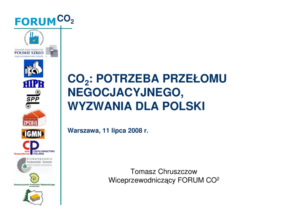 FORUM CO2 CO2: POTRZEBA PRZEŁOMU NEGOCJACYJNEGO, WYZWANIA DLA POLSKI Warszawa, 11 lipca 2008 r. Tomasz Chruszczow Wiceprzewodniczący FORUM CO2 FORUM CO2 Pakiet klimatyczny został zaakceptowany przez Polskę • Pakiet klimatyczny 3 x 20 jest uzgodnionym celem politycznym Wspólnoty, zaakceptowanym przez państwa członkowskie i przyjętym przez Radę Europejską w marcu 2007 roku. • Pan Prezydent RP Lech Kaczyński uczestniczył w posiedzeniu Rady i w imieniu Polski przyjął tę decyzję. • Nie możemy kwestionować celów, pakietu, i tego, że Polska musi wnieść swój udział w ich osiągnięcie. FORUM CO2 „3 x 20%”. Cele do zrealizowania przez Polskę • Każdy sposób rozdzielenia „wysiłków” pomiędzy państwa członkowskie UE, w tym zaproponowany w styczniu 2008 przez KE musi dać w wyniku polityczny cel redukcyjny. Tutaj zadziałać musi arytmetyka. Każda zmiana celu dla jednego państwa oznacza wpływ na wielkość celów pozostałych członków UE. • Cele pakietu i „rozdział wysiłków” pomiędzy państwa członkowskie jest przeliczalny na pieniądze – bardzo duże pieniądze. • „Komisja Europejska oszacowała, iż osiągnięcie do tego czasu celów UE w zakresie redukcji gazów cieplarnianych oraz odnawialnych źródeł energii będzie kosztowało UE 70 mld euro rocznie” (Dariusz Ciepiela, www.wnp.pl 10 lipca 2008) • Mamy prawo być niezadowoleni z tego jak ten cel rozdzielono, w jakim stopniu wzięto pod uwagę różnice w rozwoju gospodarczym, a także dotychczasowe osiągnięcia naszego kraju w redukowaniu emisji. • Niezadowolenie musimy okazać w sposób konstruktywny. FORUM CO2 Przemysł • Nie zastanawia się nad przyczynami globalnego ocieplenia. • Nie sprawdza, czy ocieplenie jest faktem • Przemysł reaguje na: – Regulacje polityczne – Zjawiska społeczne – Zjawiska ekonomiczne i …. Być rentowny FORUM CO2 Obraz pakietu klimatycznego • „Jedynie słuszna” propozycja KE – 21% redukcji w sektorze ETS + 10% redukcji w sektorach non-ETS • Brak elastyczności w wykorzystaniu limitów na poziomie krajowym jest przeciwstawiana czarnej wizji upadku polskiej gospodarki, z bardzo wysokimi cenami energii, wyludnienia Polski itd. • Obie wizje są fałszywe FORUM CO2 Błędy KE i jej propozycji legislacyjnej • Odejście od zintegrowanego traktowania środowiska – nie da się jednocześnie ograniczyć emisji „klasycznych” z wykorzystaniem metod wtórnych i emisji GHG. • Europa – zwłaszcza EU12 musi wykonać olbrzymi wysiłek adaptacyjny – aby przygotować się na: – – – – Ekstrema pogodowe; Migracje klimatyczne; Zabezpieczenia powodziowe; Nowe zagrożenia epidemiologiczne. • Tymczasem poszczególne DG konkurują ze sobą – bez koordynacji działań FORUM CO2 Jak negocjować pakiet klimatyczny? • • Nie możemy mówić „NIE i tyle”, bo z takim stanowiskiem nikt nie będzie się liczył. Należy mówić „TAK, ale …” – – – – • jest to bardzo trudne nie mamy wystarczających środków potrzebujemy wsparcia możemy zrobić więcej w innych dziedzinach (np. efektywności energetycznej) Należy żądać powrotu do zintegrowanego podejścia do środowiska FORUM CO2 Bezpieczeństwo energetyczne Polski Zabezpieczenie paliwowe dzięki węglowi (mamy go dużo). Dość stabilne dostawy gazu, w tym z własnych źródeł. Mały udział energii ze źródeł odnawialnych istnieje potencjał do wzrostu. Wysoki wskaźnik zużycia energii na jednostkę dochodu narodowego (2,5-krotnie większy niż w EU-15), co czyni naszą całą gospodarkę nieefektywną. NISKA EFEKTYWNOŚĆ jest bardzo istotnym źródłem zagrożenia naszego bezpieczeństwa energetycznego. FORUM CO2 Źródła braku efektywności w Polsce Infrastruktura jest jednym głównych źródłem nieefektywności. Dotyczy to: • • • • • sieci przesyłowych – zwłaszcza elektroenergetycznej, systemów zaopatrzenia w wodę, oczyszczania ścieków (pompy itd.), infrastruktury kolejowej i stanu taboru, sieci drogowej, miast (oświetlenie ulic, tabor komunalny – komunikacyjny i techniczny) Dalszy rozwój i unowocześnienie kraju zależą od zmiany tego stanu rzeczy. Warunkiem są pieniądze. Część środków mamy już w funduszach strukturalnych oraz Funduszu Spójności, ale … Cele 2020 wymagają kolejnych miliardów. FORUM CO2 Co to jest CO2 (GHG) • Dla przemysłu CO2 to jest nowy surowiec, bez którego nie da się produkować • Ekonomia – zaczyna sobie coraz lepiej radzić uwzględnieniem zmian klimatu i adaptacją • Zmiany klimatu to kolejne ryzyko, które trzeba uwzględnić w zarządzaniu, biorąc pod uwagę koszty ubezpieczeń, ewentualnych roszczeń osób trzecich itd. • Przemysł bezustannie pracuje nad poprawą swojej efektywności energetyczne i nowymi technologiami. FORUM CO2 Pakiet klimatyczny – propozycja stanowiska (1) Mówmy TAK, ale… pod warunkiem: • • • • Musimy dostać wsparcie w kolejnym budżecie UE, na lata 2014-2020 i to duże! Nie ma mowy aby stać się płatnikiem netto. Trzeba tak zmodyfikować wspólnotowe zasady pomocy publicznej, aby można było finansować restytucję mocy w energetyce z wykorzystaniem najnowszych, najmniej emisyjnych technologii. Trzeba pomóc przemysłowi, który po bardzo kosztownych restrukturyzacjach (przykłady hutnictwa stali, szkła, cementu) osiągnął już bardzo wysoki poziom efektywności energetycznej. Trzeba zaoferować środki (najlepiej poprzez samorządy) wszystkim, którzy zechcą przeprowadzić prawdziwą termomodernizację swych domów, mieszkań. FORUM CO2 Pakiet klimatyczny – propozycja stanowiska (2) • Trzeba odejść od sztywnego podziału wysiłku pomiędzy sektory ETS oraz non-ETS i pozwolić na elastyczne korzystanie z całej puli dozwolonej emisji CO2, tak aby oszczędności poza przemysłem osiągane dzięki produktom tego przemysłu mogły zwiększać pulę dostępnych uprawnień emisyjnych. • Potrzebujemy projektów 